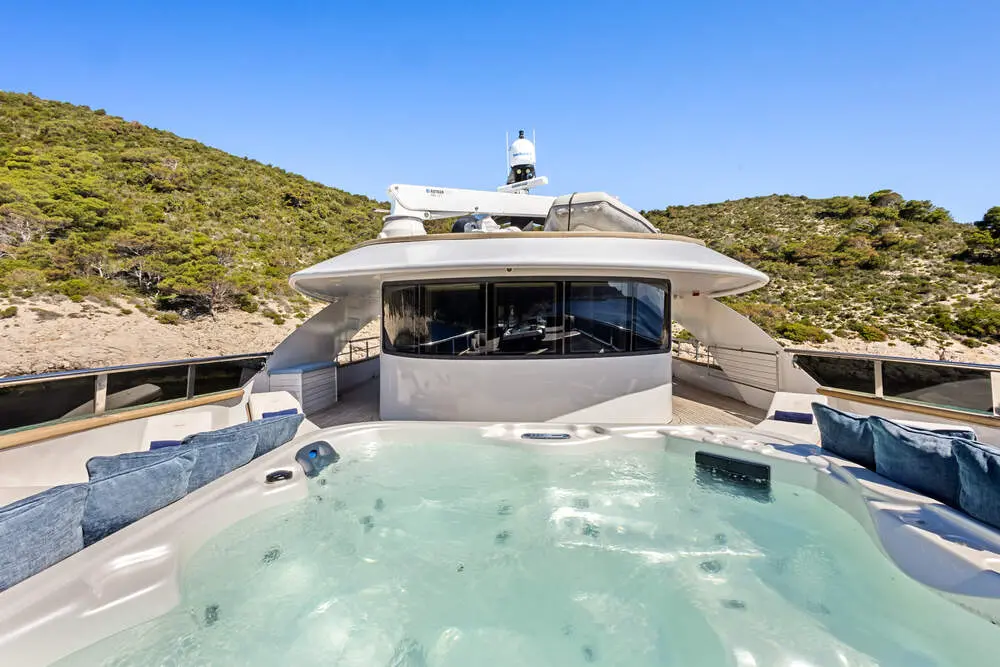 Bella is outfitted with state-of-the-art entertainment options including satellite TVs in both the saloon and all cabins. The deck is a haven for relaxation and fun, featuring a jacuzzi, sun loungers, and a swimming pool. For the adventurous, an assortment of water toys including kayaks, a jet-ski, paddle boards, and a SeaBob are available.