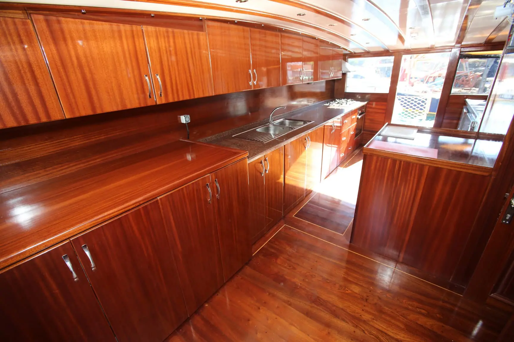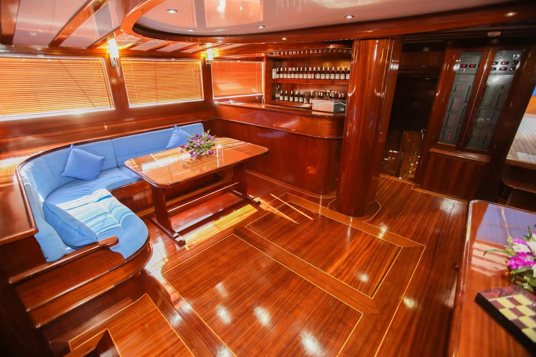 Onboard entertainment includes a TV and DVD player in the salon, a comprehensive music system, and wireless internet, complemented by a variety of water sports equipment such as a canoe, ringo, and water skis. The indoor restaurant serves a variety of delicious dishes, prepared by the onboard chef who specializes in both local and international cuisine, tailored to meet any dietary needs and preferences.