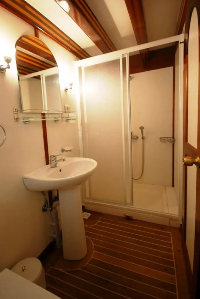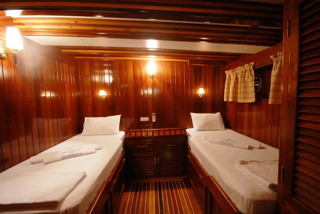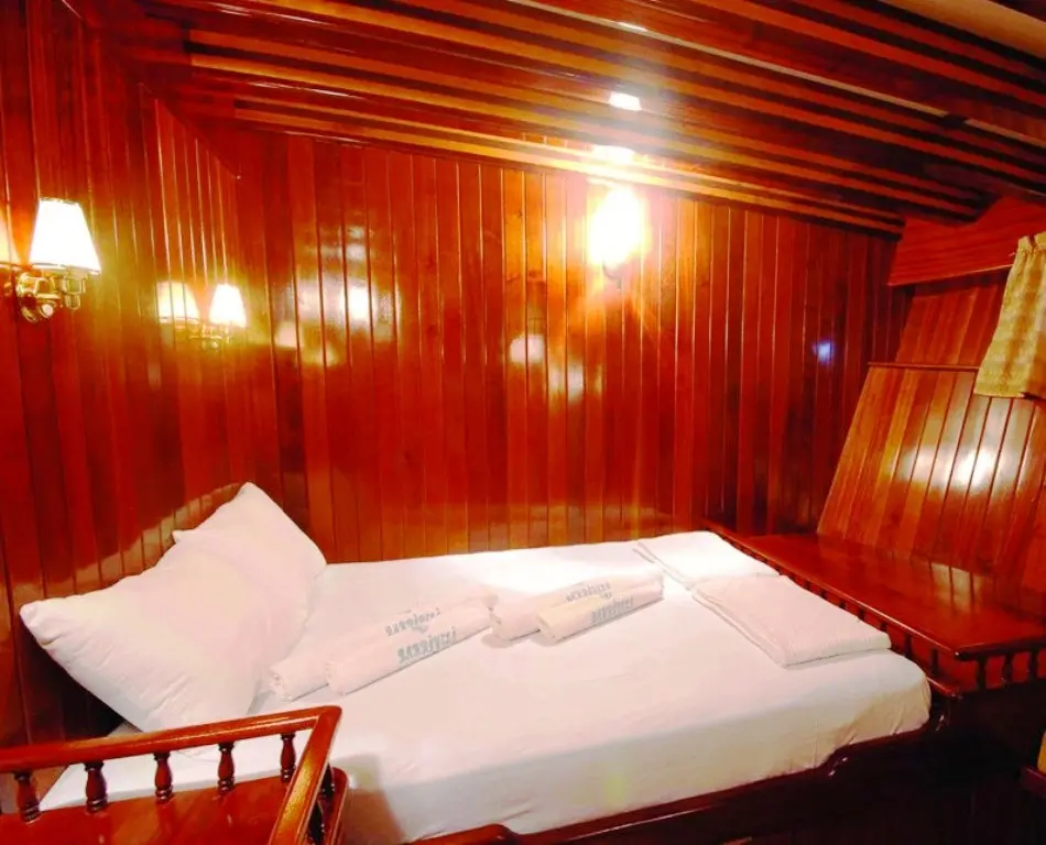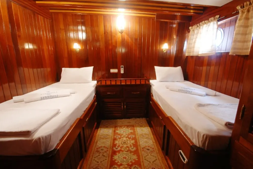 This gulet features 12 cabins, including 2 Double and 10 Twin, each outfitted with en-suite facilities, air conditioning, and other modern comforts, ensuring a pleasant stay for all guests. The professional crew of five is dedicated to providing personalized service, from navigation to gourmet dining, focusing on creating a memorable and luxurious experience for every guest.