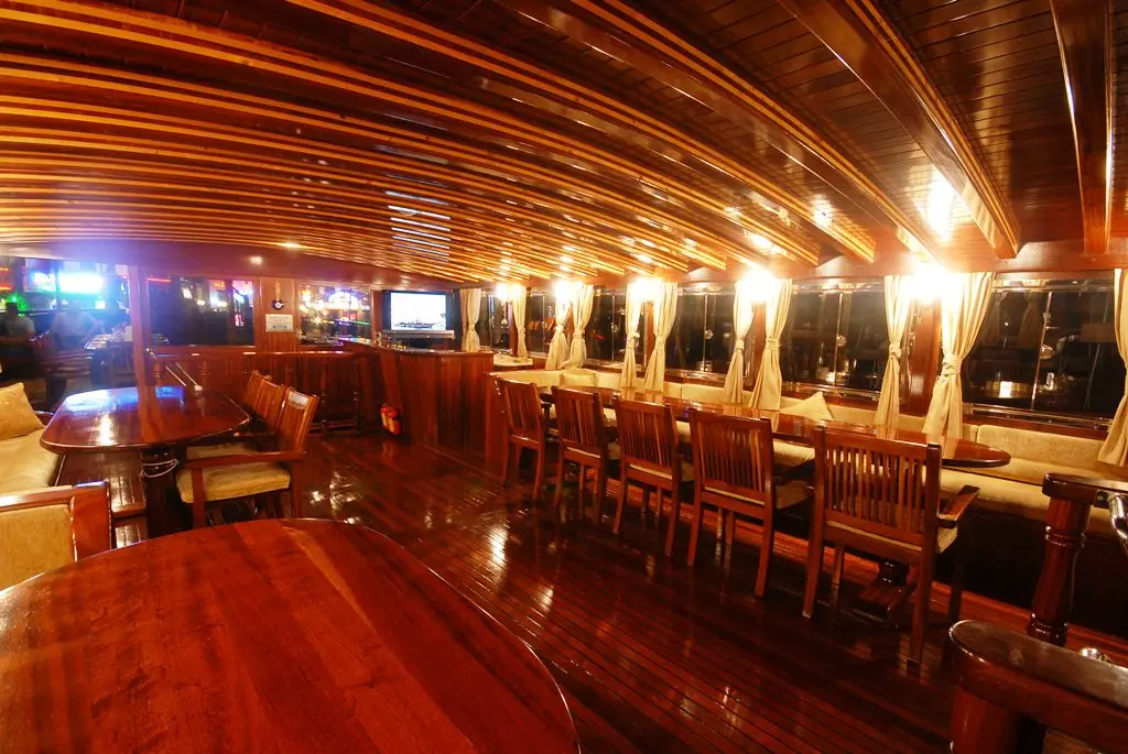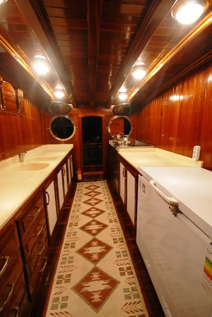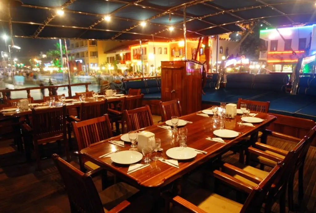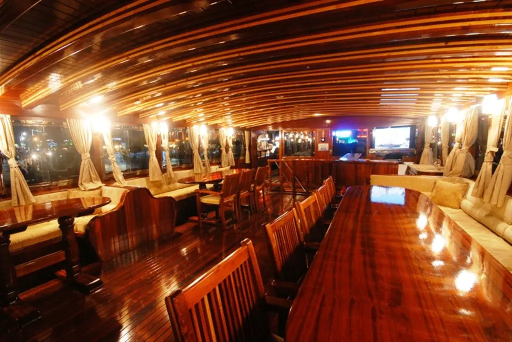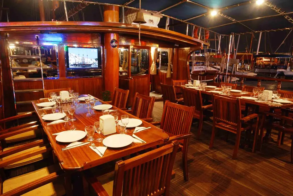 Onboard entertainment includes a TV and DVD player in the salon, a music system, and wireless internet, along with a canoe for guests to use, adding fun and relaxation to the cruising experience. The indoor restaurant on Gulet Bahriyeli C serves a variety of delicious meals prepared by the onboard chef, catering to all tastes and dietary requirements, and making dining a highlight of the cruise.