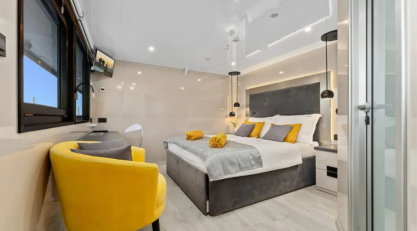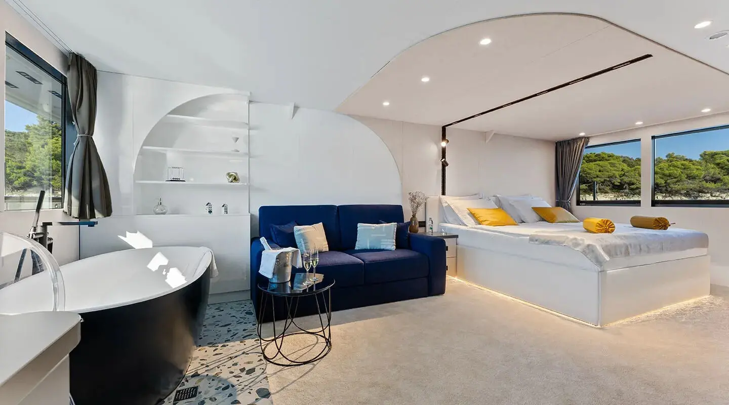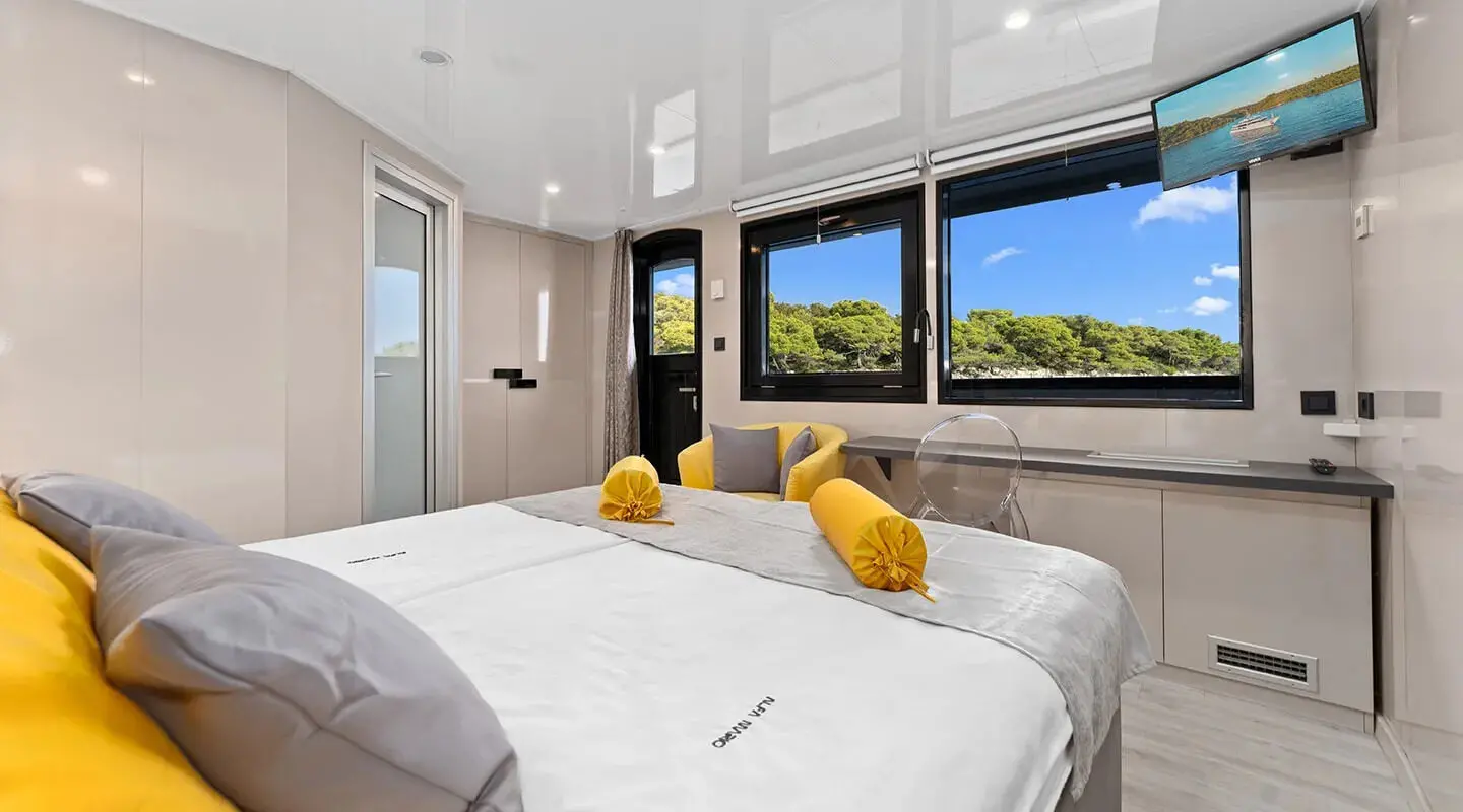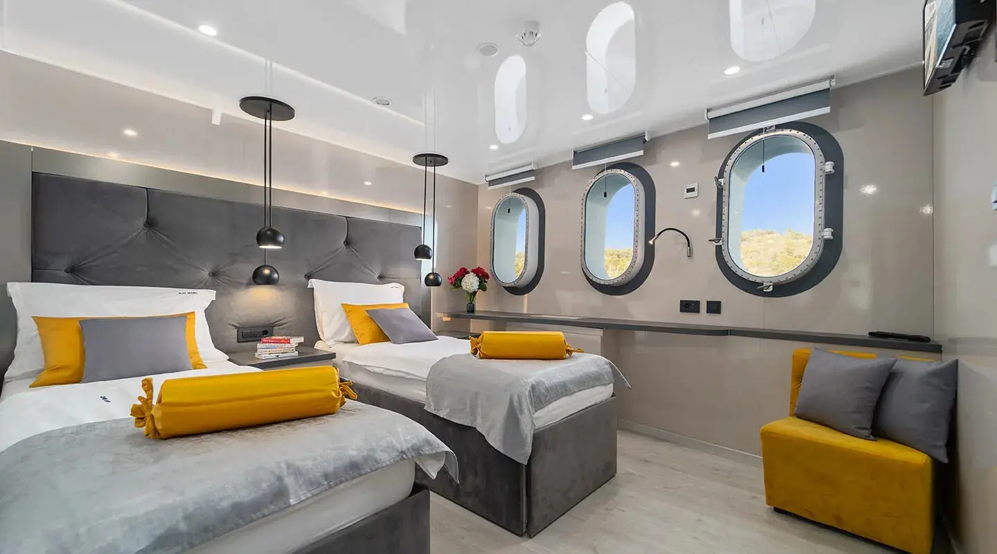 The yacht accommodates guests in 16 well-appointed cabins, with 10 double, 2 master and 4 twin cabins, all equipped with air conditioning for comfort in the warmer months. Each cabin also features a bathroom with a shower box and home-type toilet facilities, emphasizing a home-away-from-home experience.