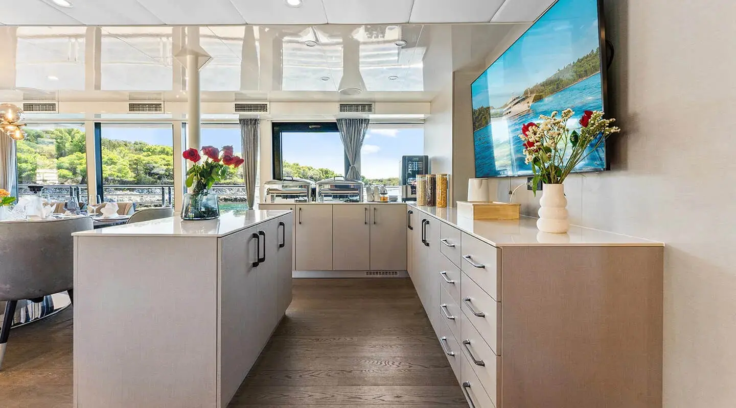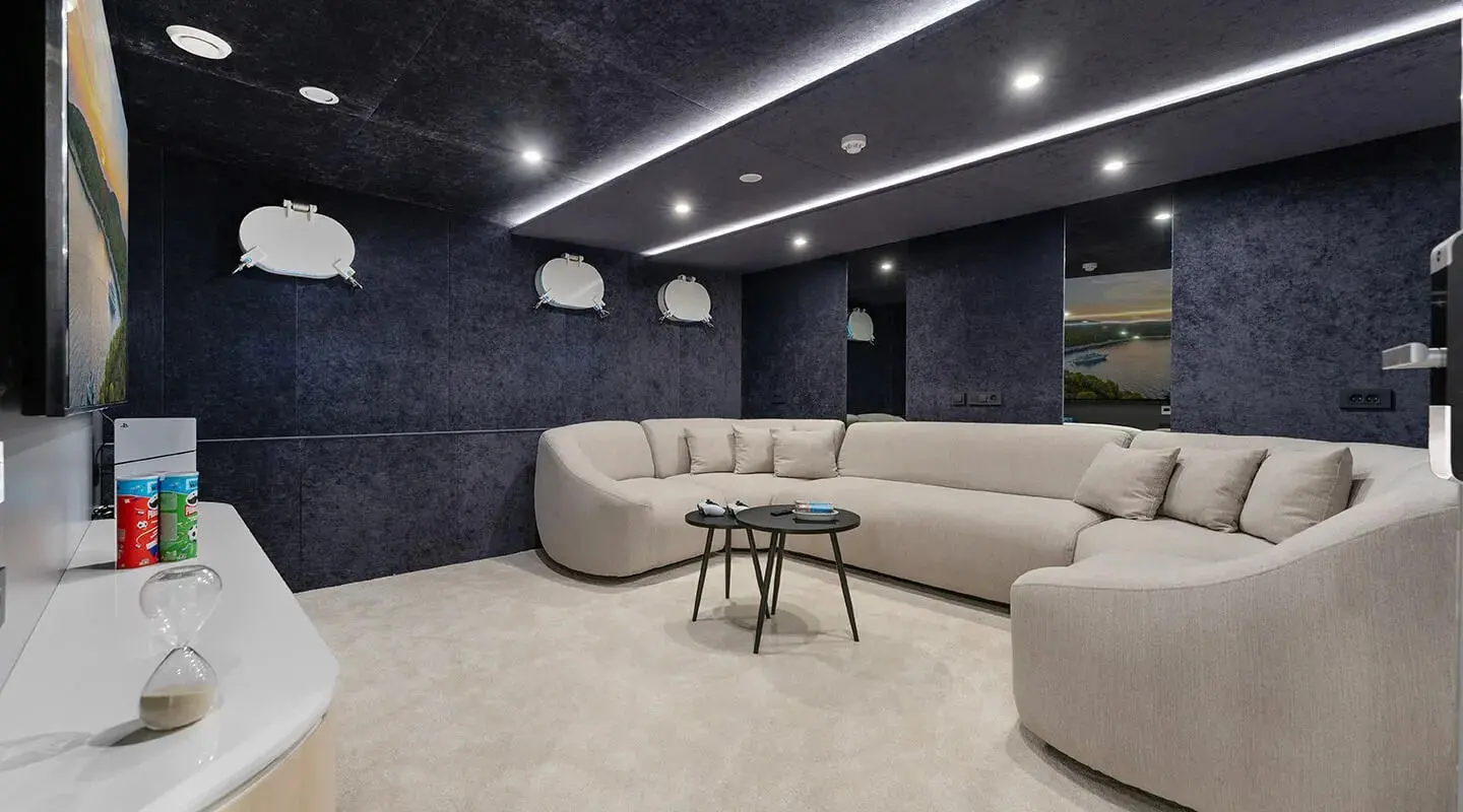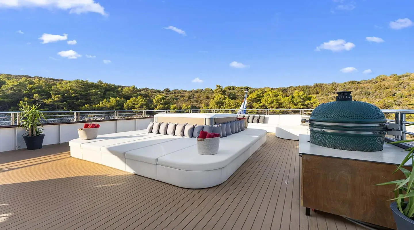 For entertainment, the yacht is equipped with an indoor audio system and a TV saloon for catching up on films or watching live events. Water sports enthusiasts will find plenty to keep themselves entertained with two kayaks, a jet-ski, two paddle boards, a SeaBob, a tube ride, an E-foil, and a banana boat available.