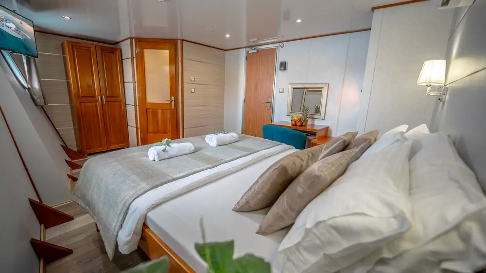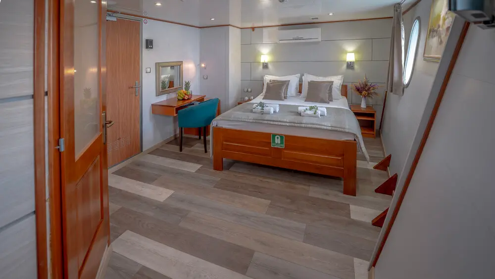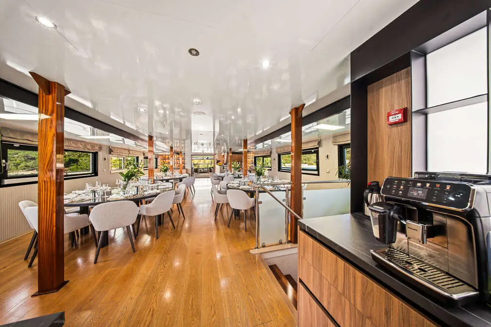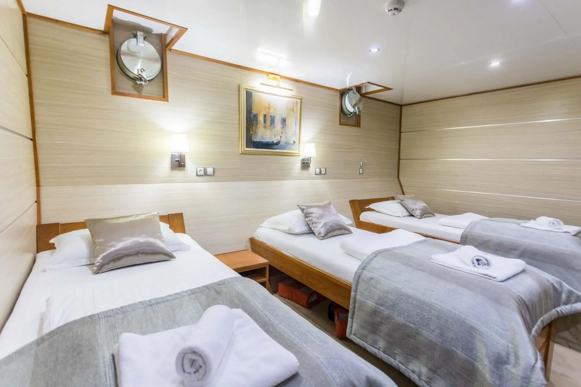 Karizma’s interior is a haven of comfort and luxury, featuring six double cabins, two triple cabins, and four twin cabins, all outfitted with home-type toilet facilities and shower boxes. Each cabin boasts individual air conditioning units, guaranteeing personal comfort regardless of the external weather conditions.