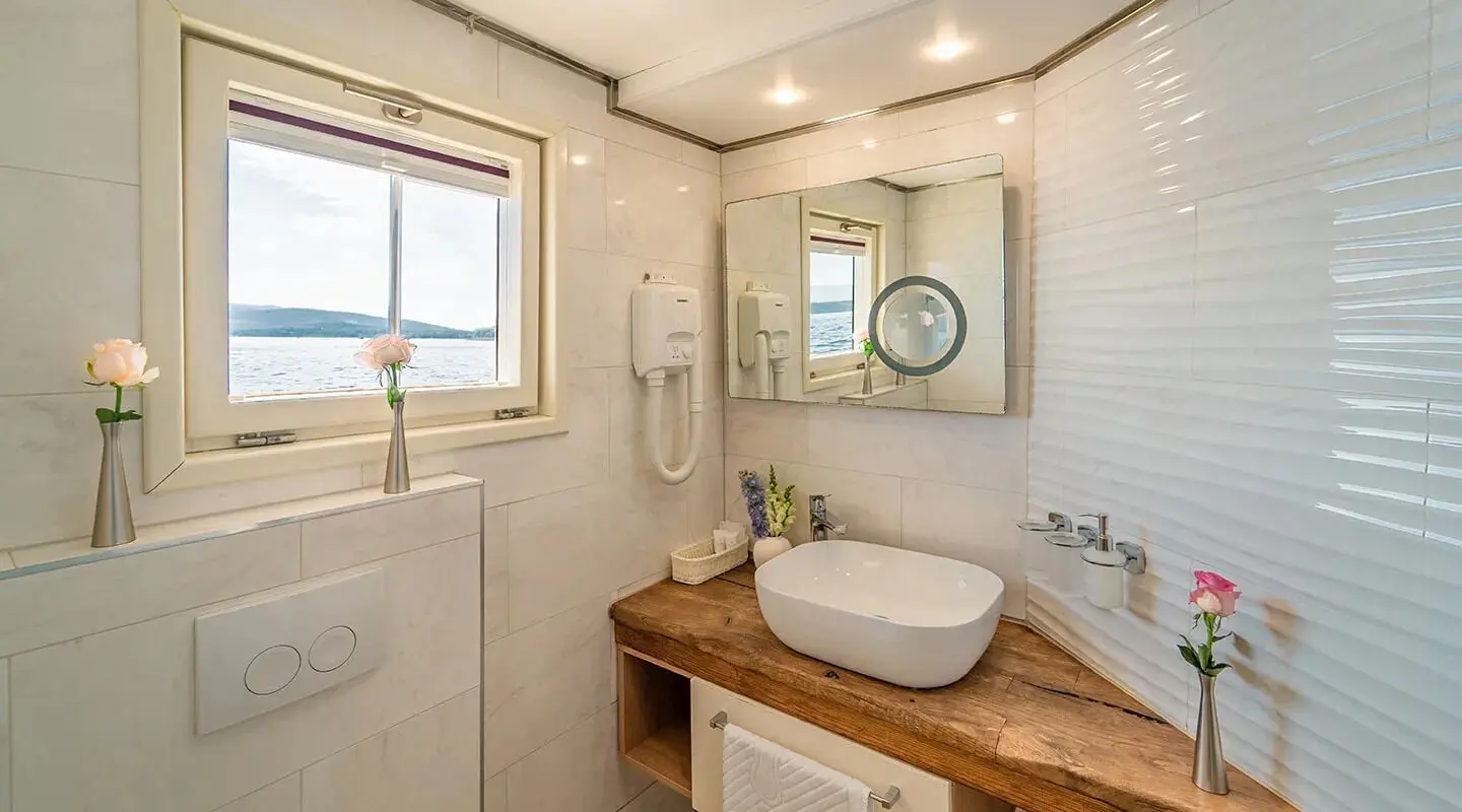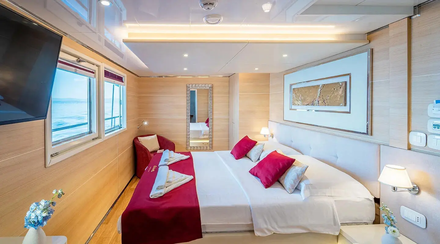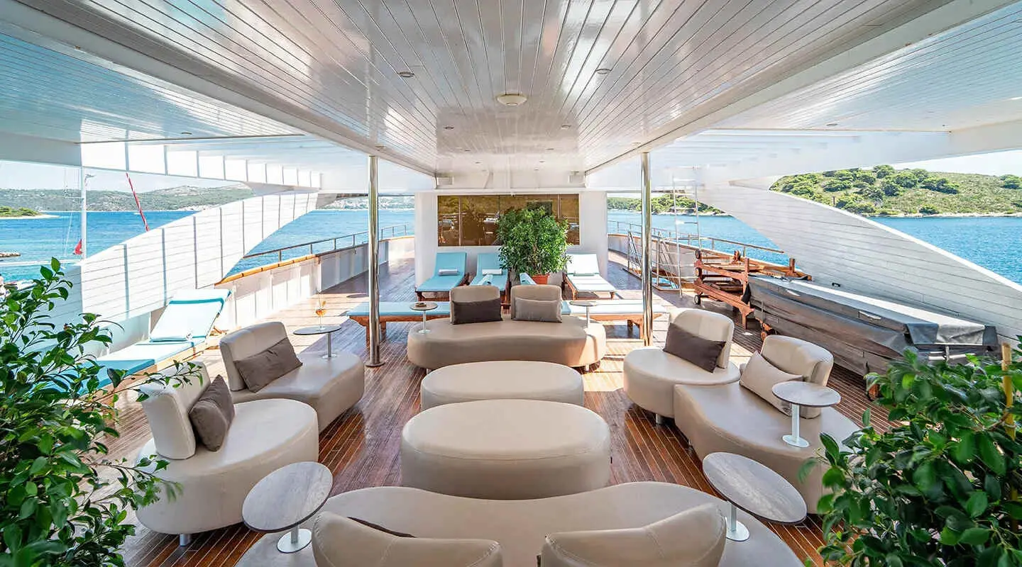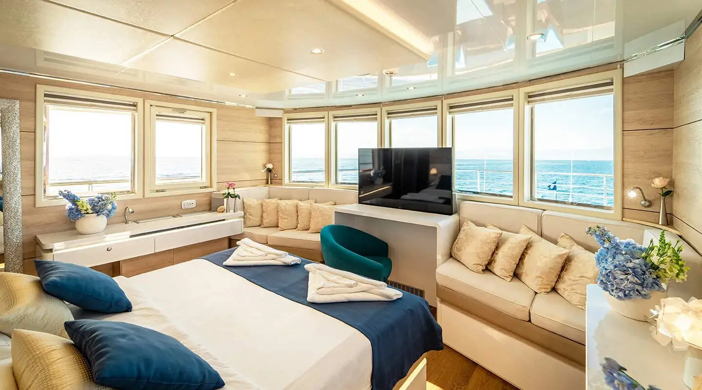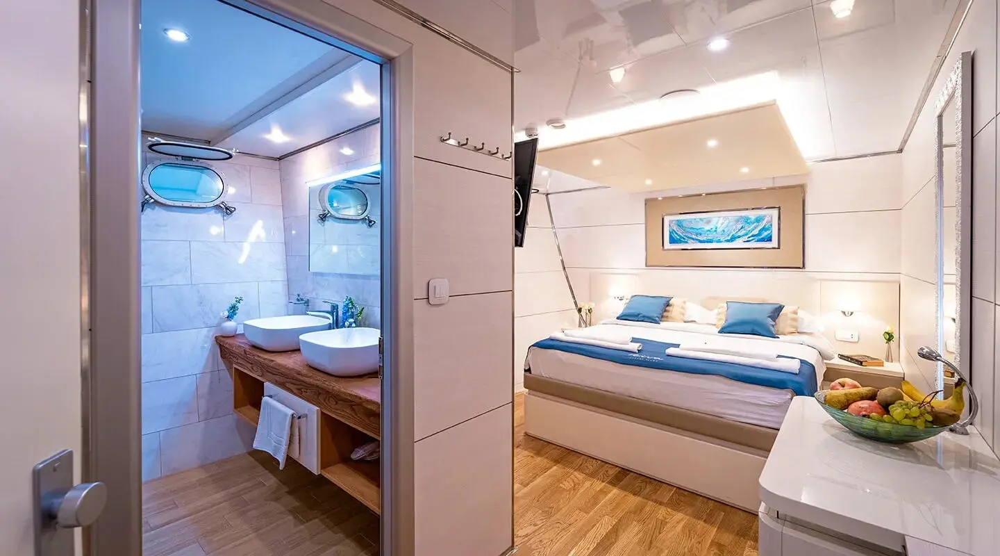 Beyond the exquisite cabins, the yacht features a jacuzzi on deck, full air conditioning throughout, and a salon equipped with an indoor audio system and TV for entertainment. These amenities offer guests a blend of relaxation and entertainment options while aboard.