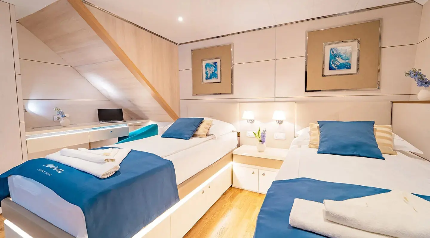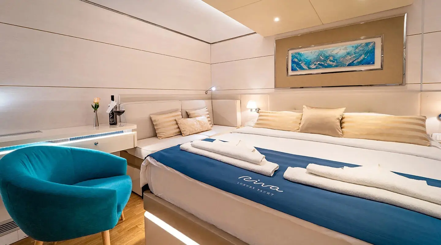 The interior of Motor Yacht Riva is a testament to luxury, with bespoke furnishings and elegant decor. Each of the 18 cabins, including 10 double, 4 VIP, 2 triple, and 2 twin, are fitted with state-of-the-art amenities and en-suite facilities, ensuring privacy and comfort.