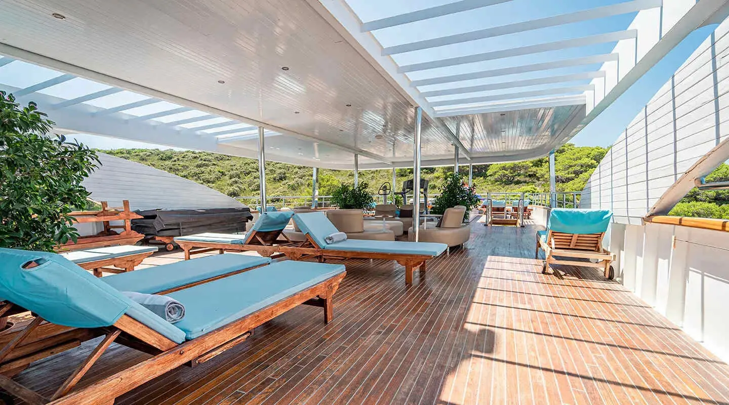 The onboard gym is stocked with exercise equipment, and the availability of kayaks, paddle boards, and water skis encourages an active lifestyle even while at sea. For relaxation, the jacuzzi serves as a perfect spot to unwind after a day of activities.
