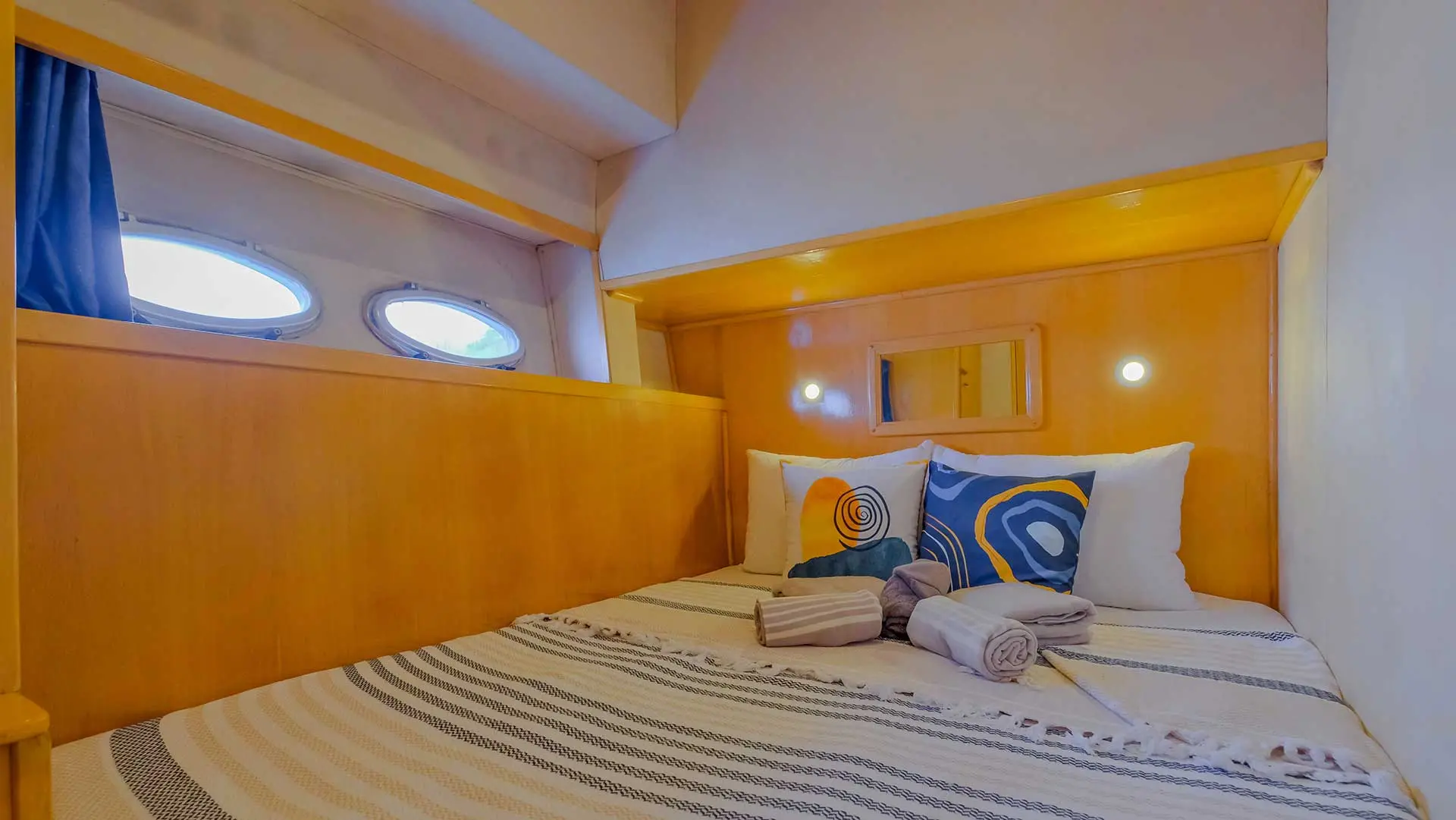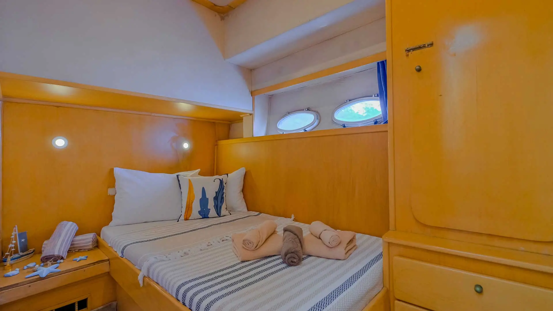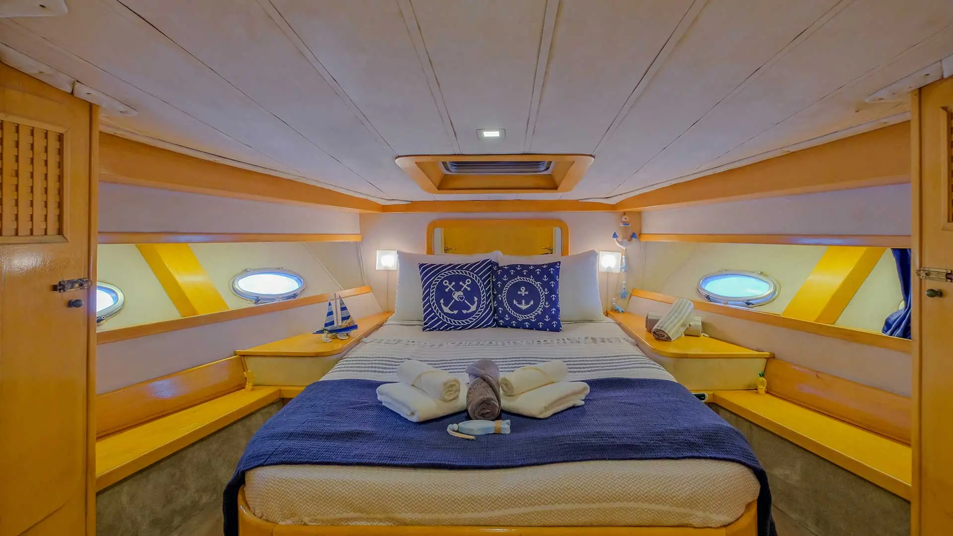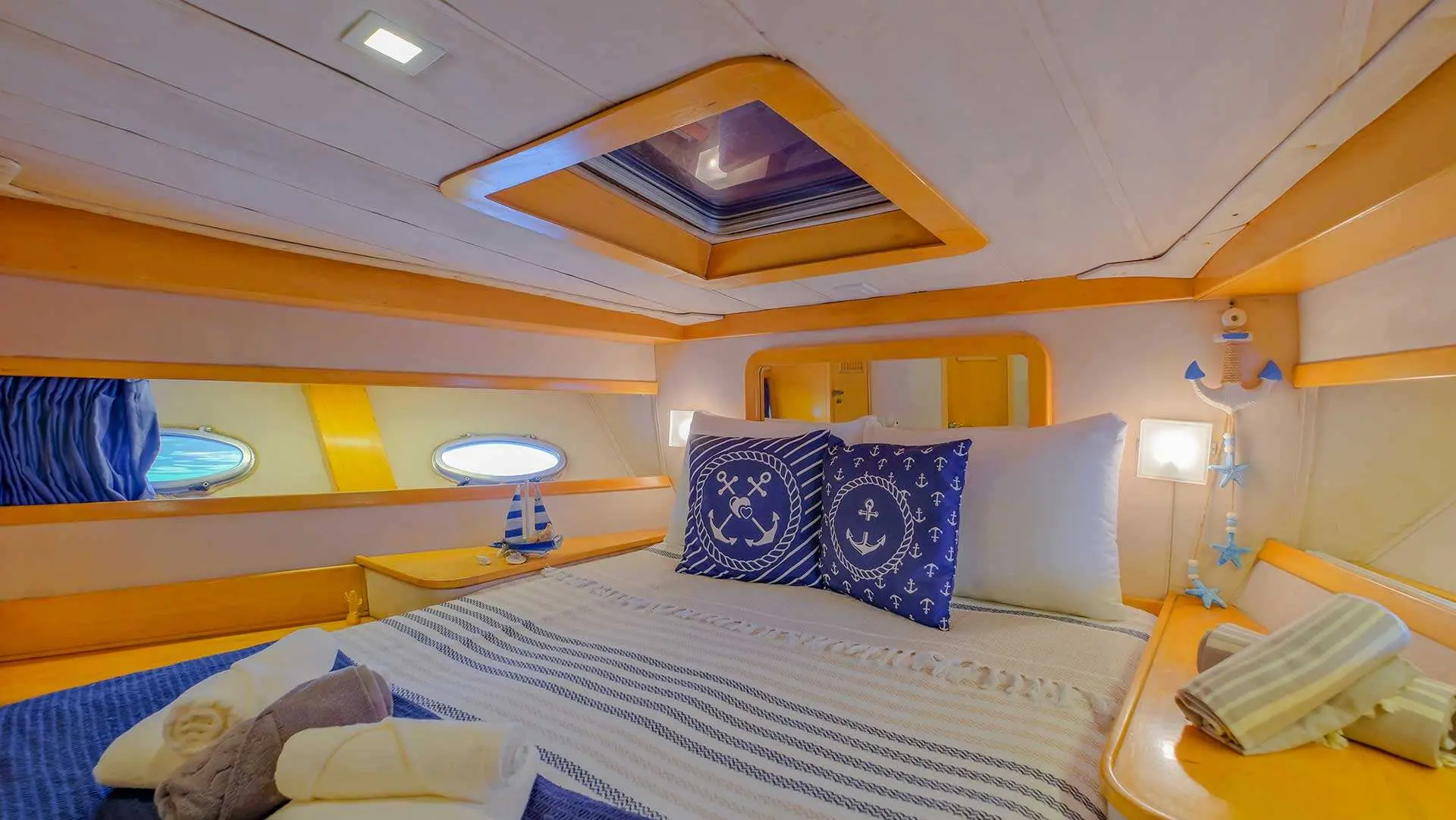 Ada Kuzey features one master and two double cabins, each equipped with private bathrooms, ensuring a comfortable and private living space. The air-conditioned interiors provide a cool retreat from the Mediterranean sun.