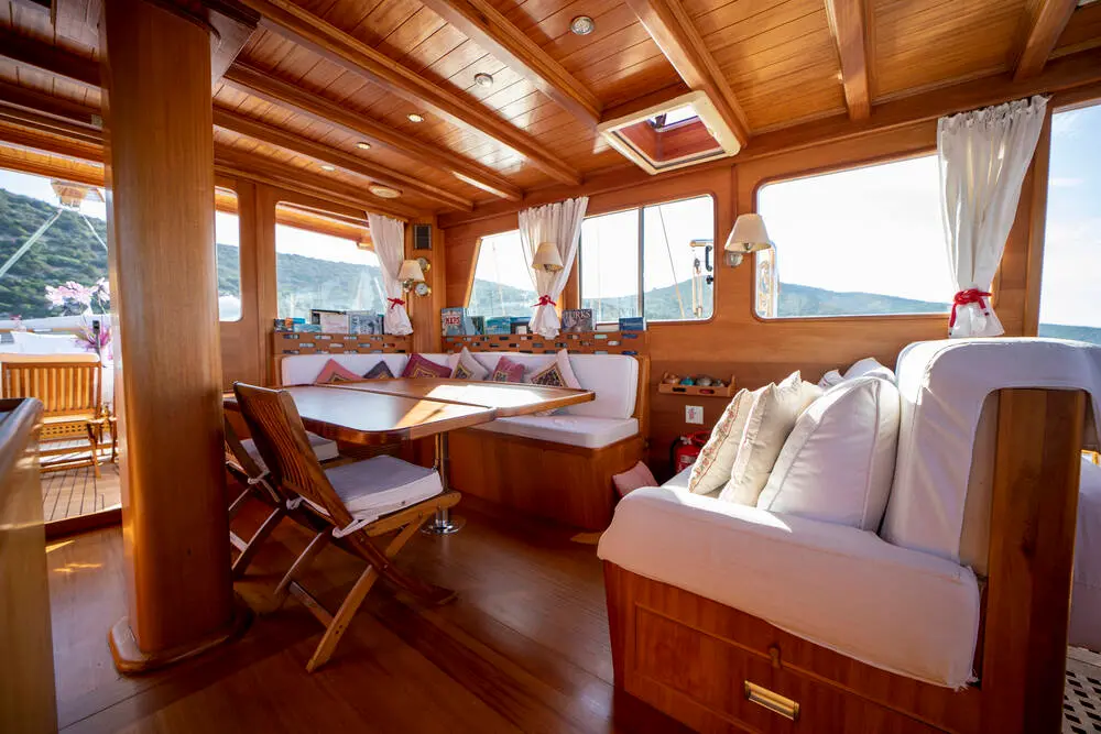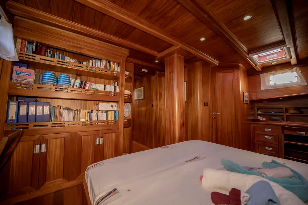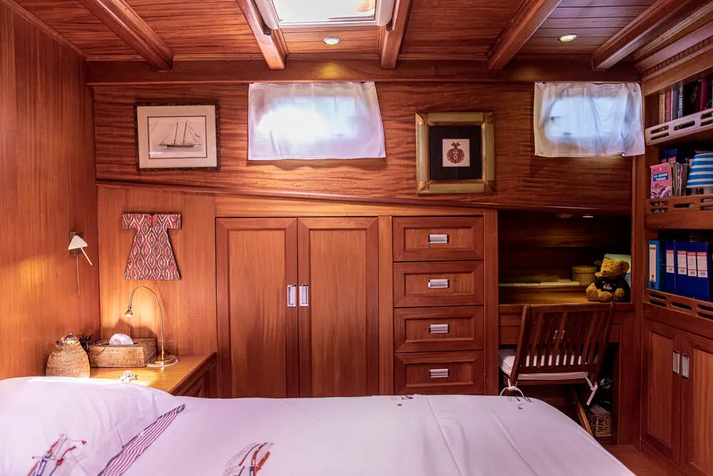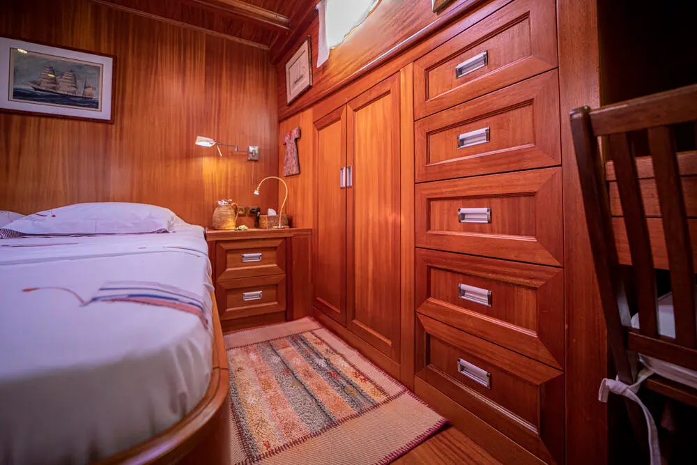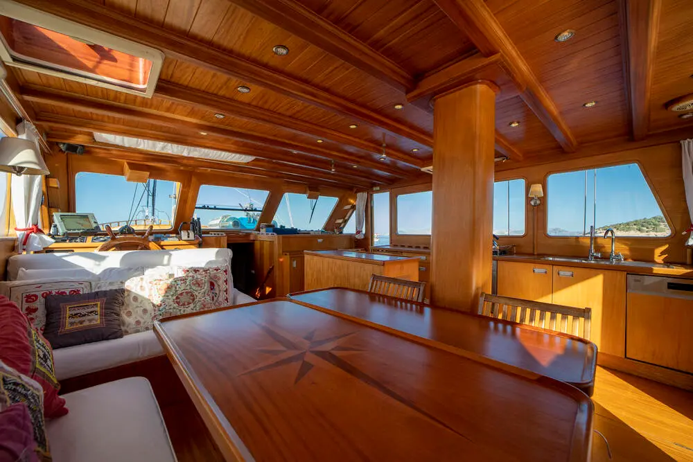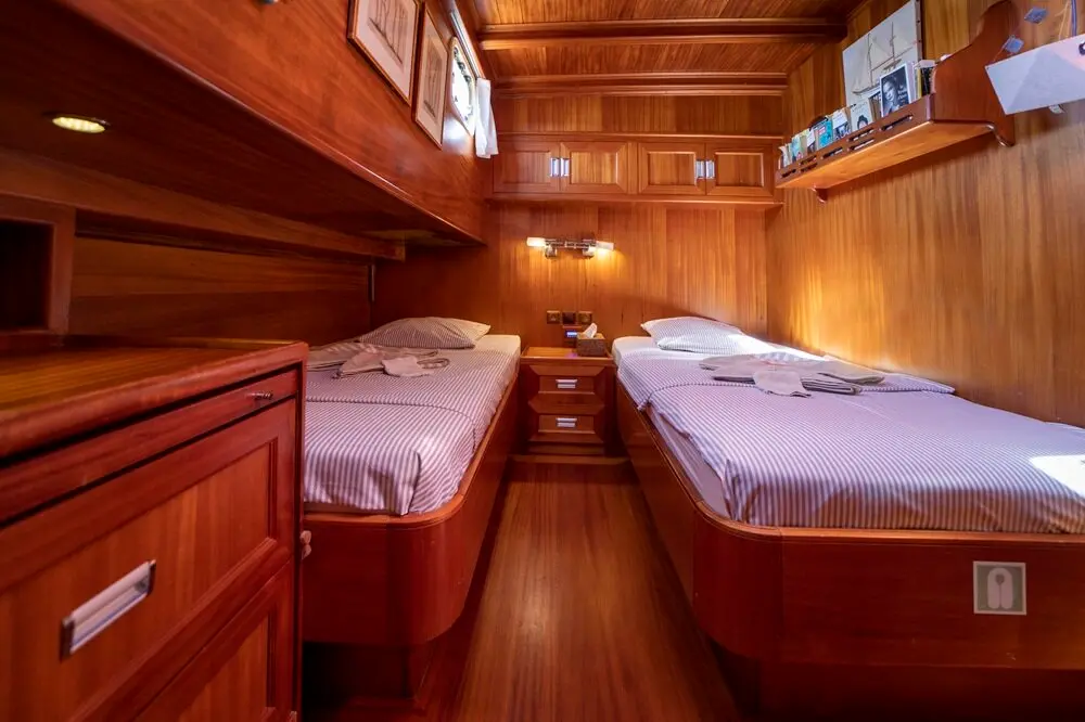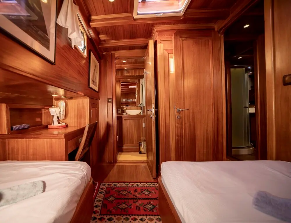 The interior space is warm and inviting, featuring rich wood finishes and a classic nautical style. The Master cabin is spacious and comfortable, while the twin cabins offer flexible accommodation for friends or family. All cabins include private bathrooms and air conditioning for a comfortable stay in warm weather.