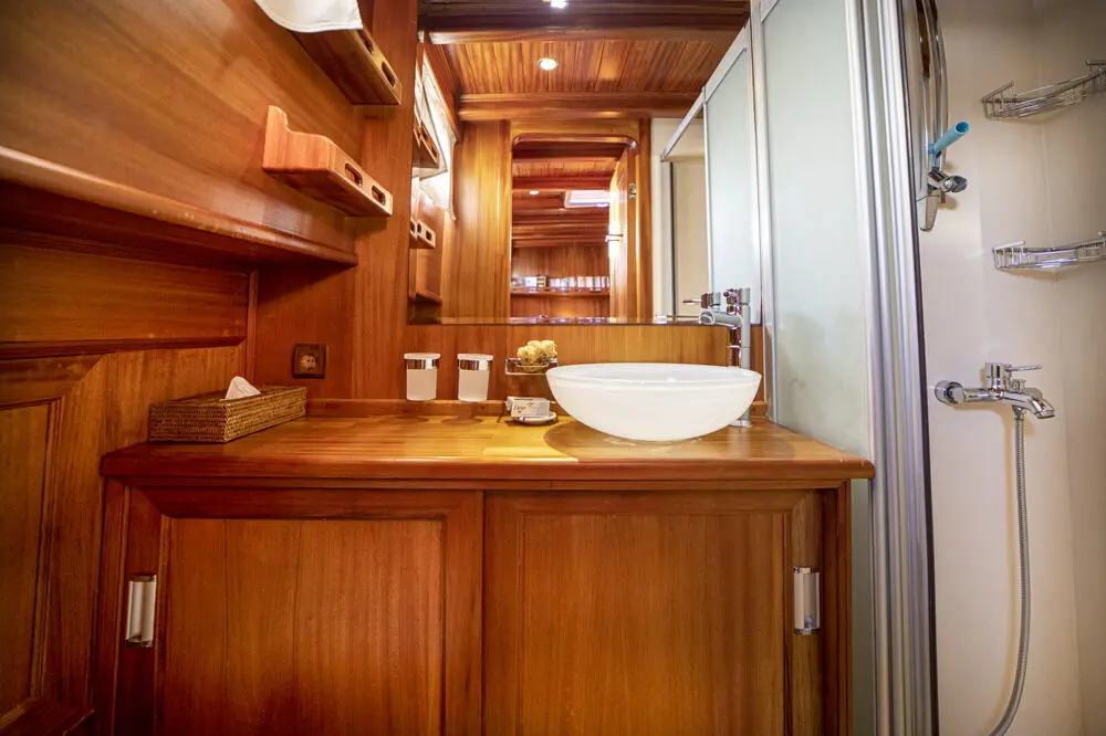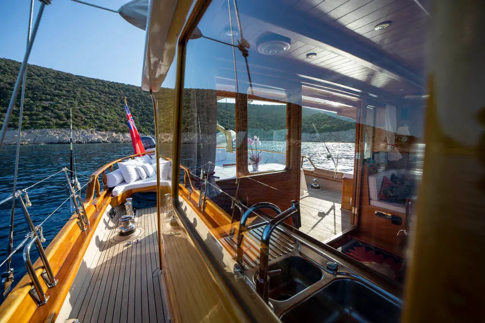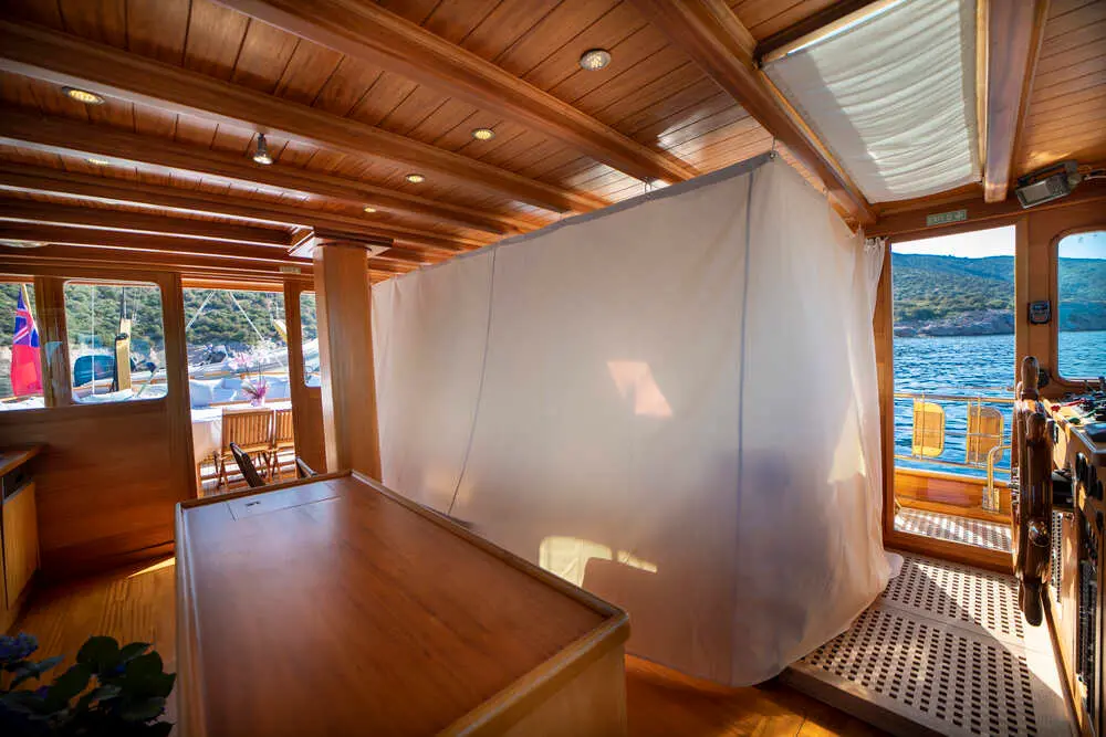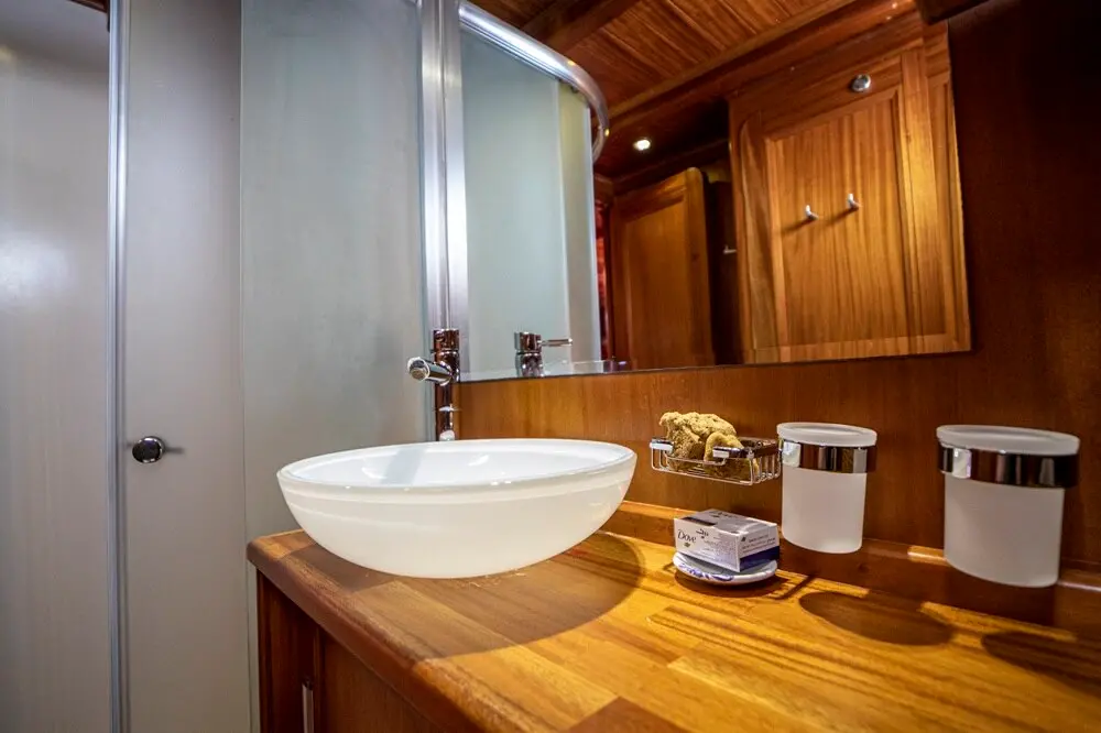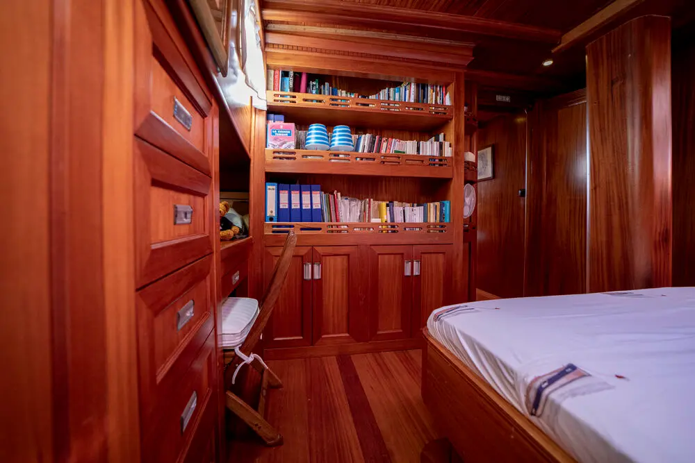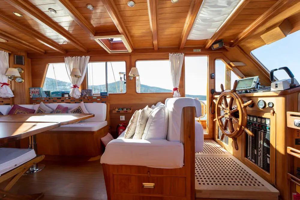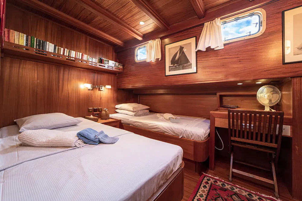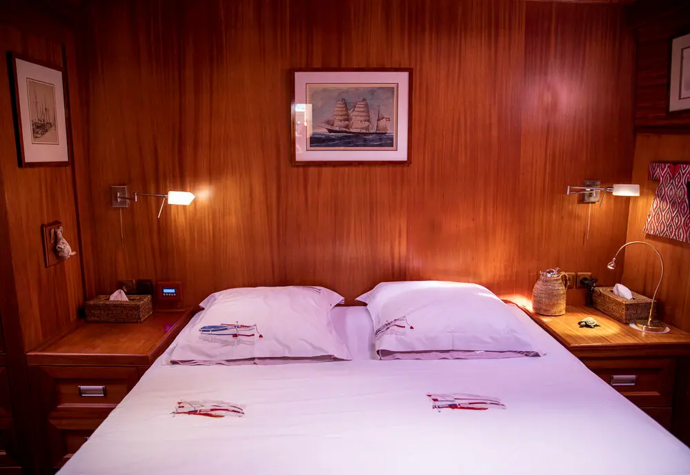 The interior space is warm and inviting, featuring rich wood finishes and a classic nautical style. The Master cabin is spacious and comfortable, while the twin cabins offer flexible accommodation for friends or family. All cabins include private bathrooms and air conditioning for a comfortable stay in warm weather.
