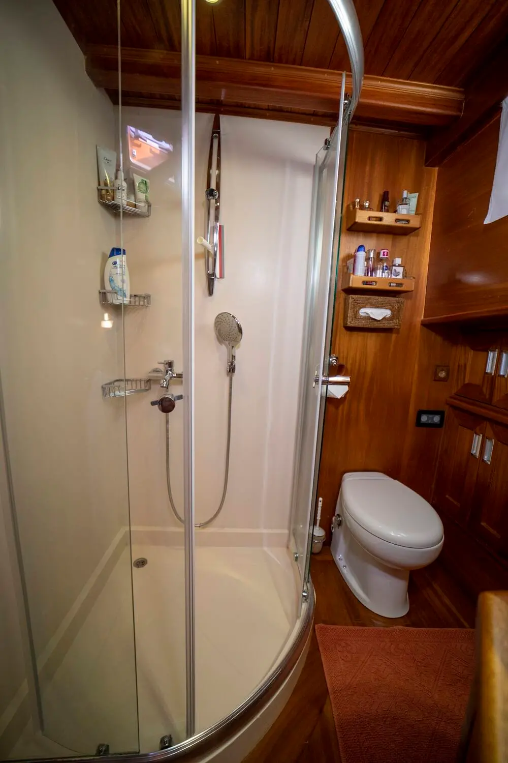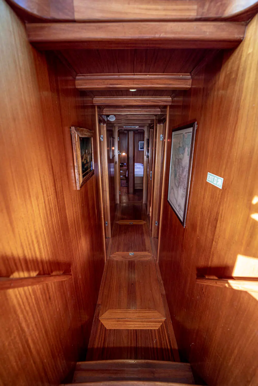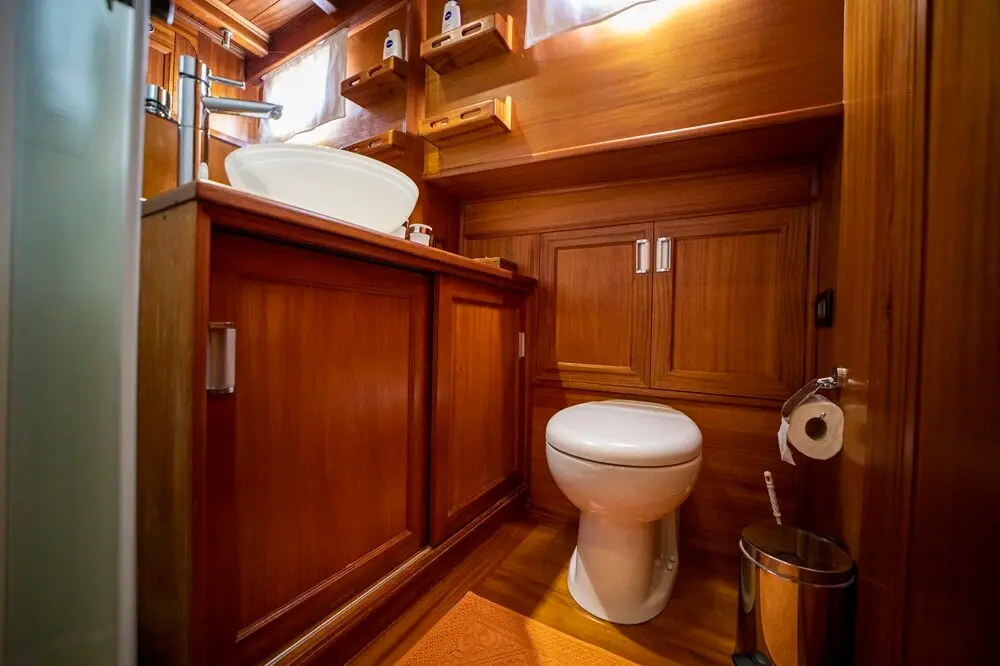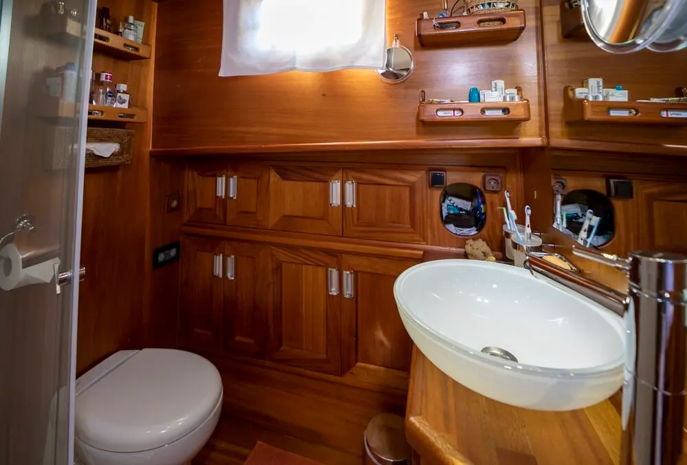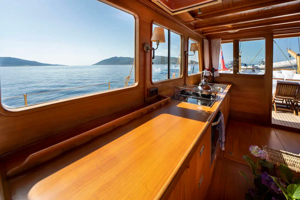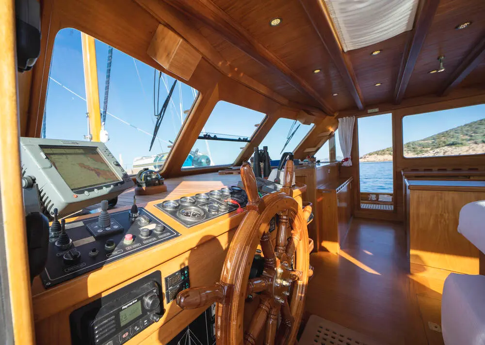 The interior space is warm and inviting, featuring rich wood finishes and a classic nautical style. The Master cabin is spacious and comfortable, while the twin cabins offer flexible accommodation for friends or family. All cabins include private bathrooms and air conditioning for a comfortable stay in warm weather.