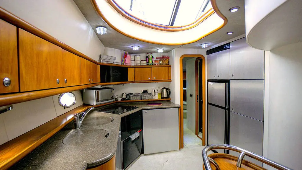 The yacht's spacious design offers multiple relaxation areas, including sun decks and shaded lounges. Inside, the saloon is elegantly furnished, providing a welcoming environment for relaxation or entertainment.