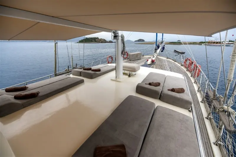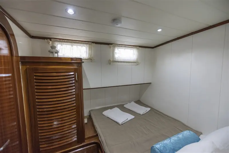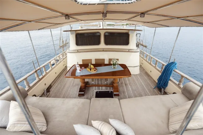 The Faralya was built in 2008 and has been meticulously maintained to ensure it meets the highest standards of safety and comfort. Its specifications include a 280 hp Iveco engine and an 11.5 kW Onan generator, supporting a cruising speed of 8 knots. This gulet’s considerable beam provides stability and spaciousness, while the draft of 1.50 meters allows it to explore closer to shorelines than larger vessels, accessing secluded bays and coves that are often unreachable by bigger yachts.