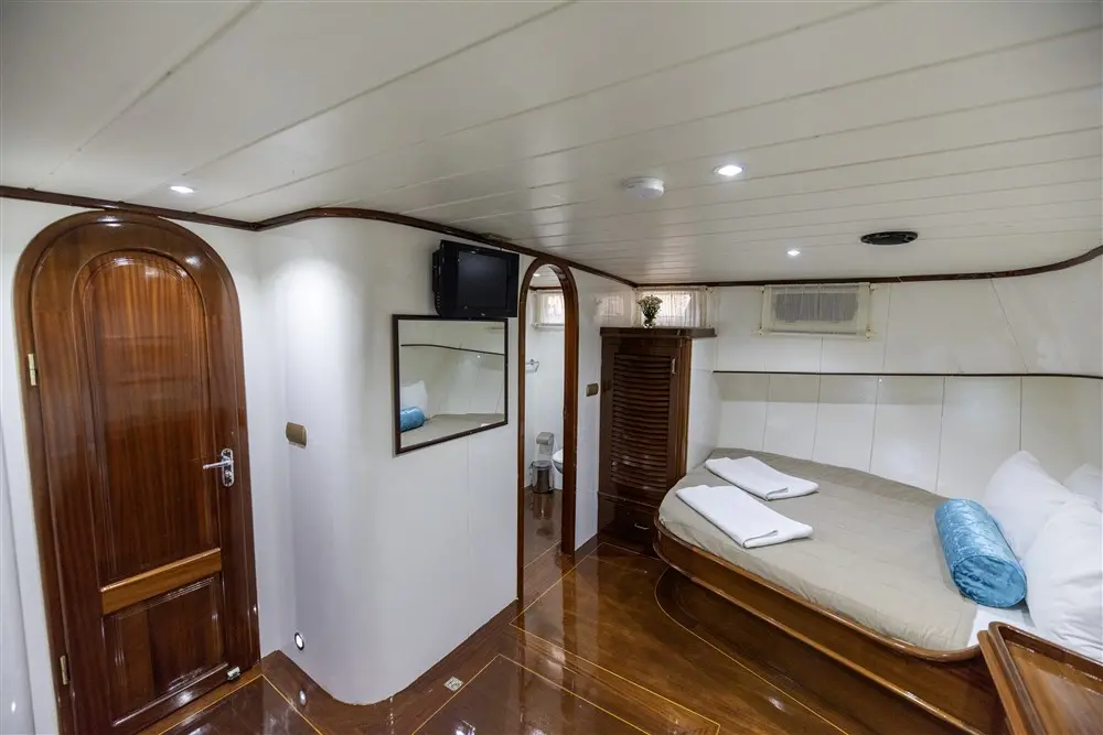 The cabin configuration includes one master and two double cabins, each equipped with home-type toilets and shower boxes. All cabins feature air conditioning, ensuring comfort regardless of the external temperatures. Each cabin is designed to provide privacy and tranquility, allowing guests to rest and rejuvenate in a serene, air-conditioned environment after a day full of activities.