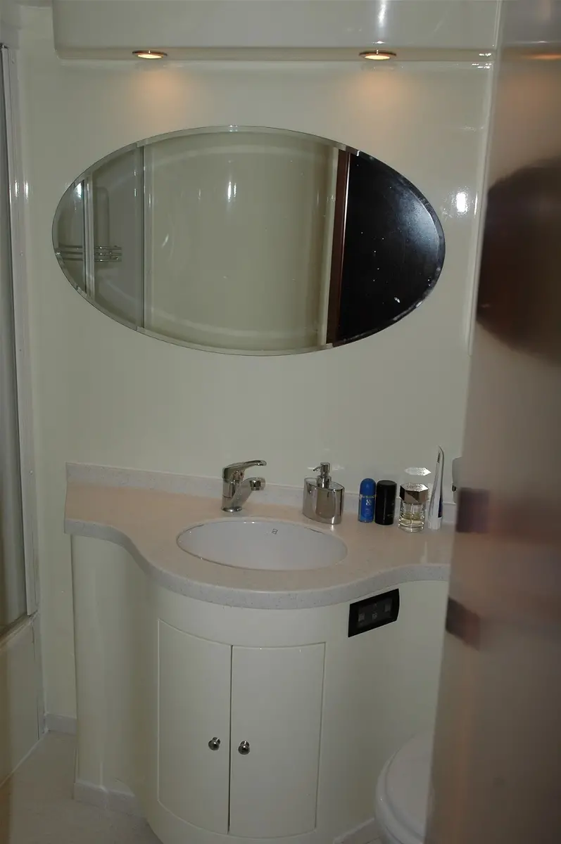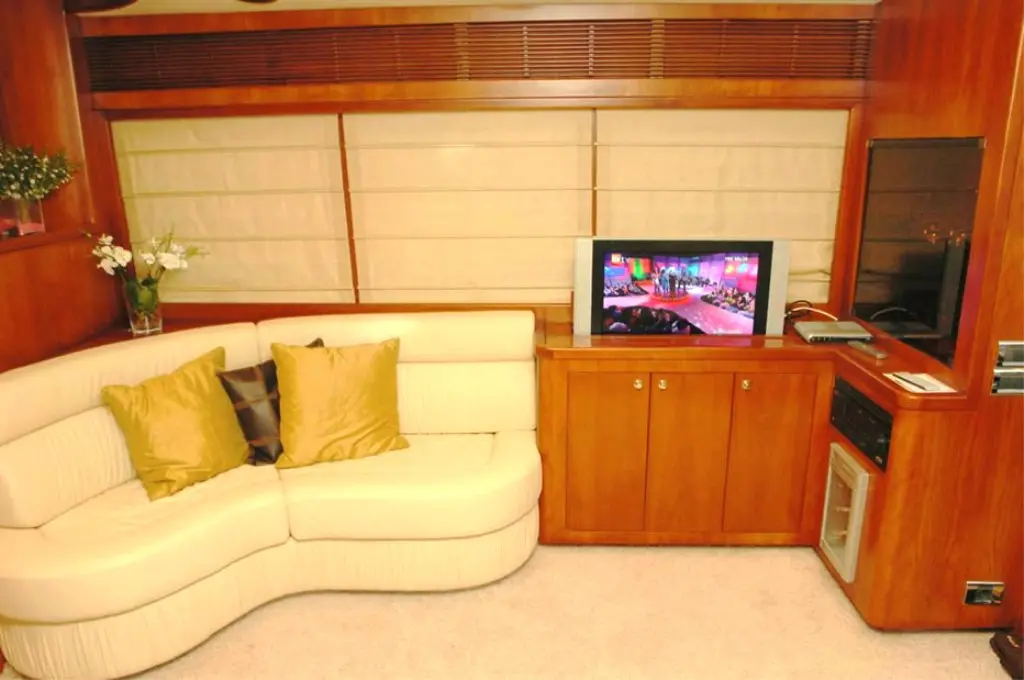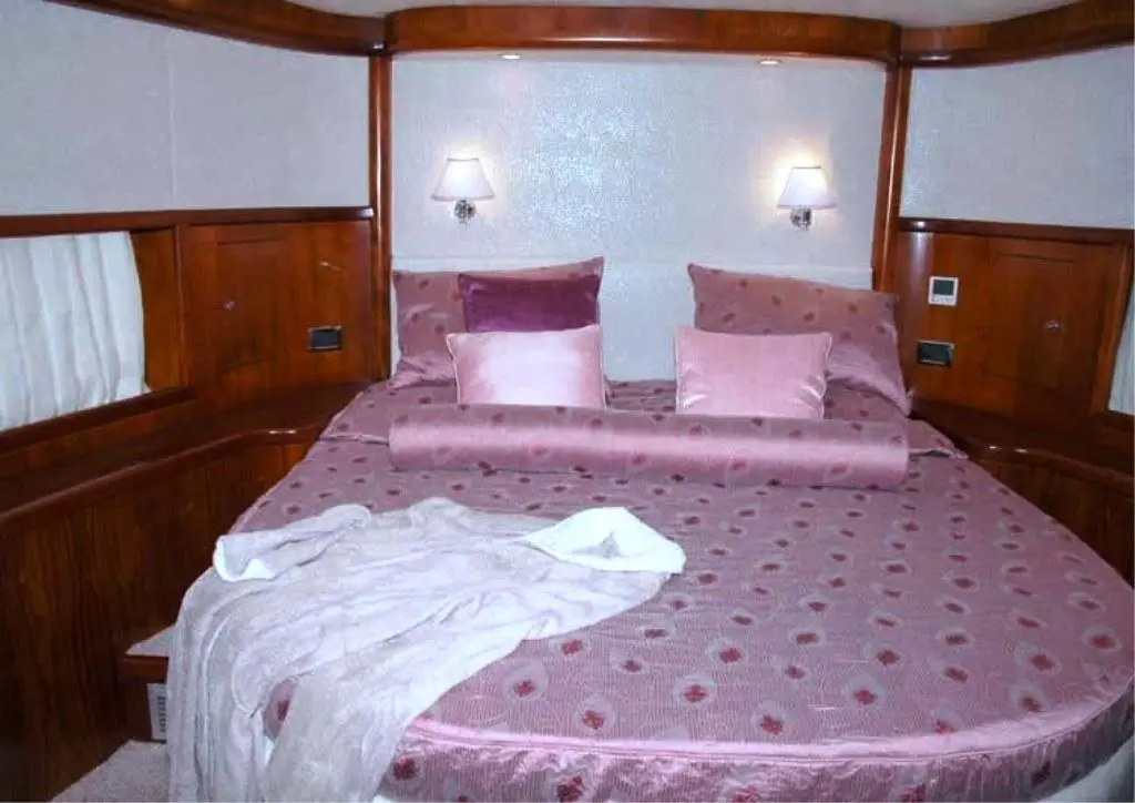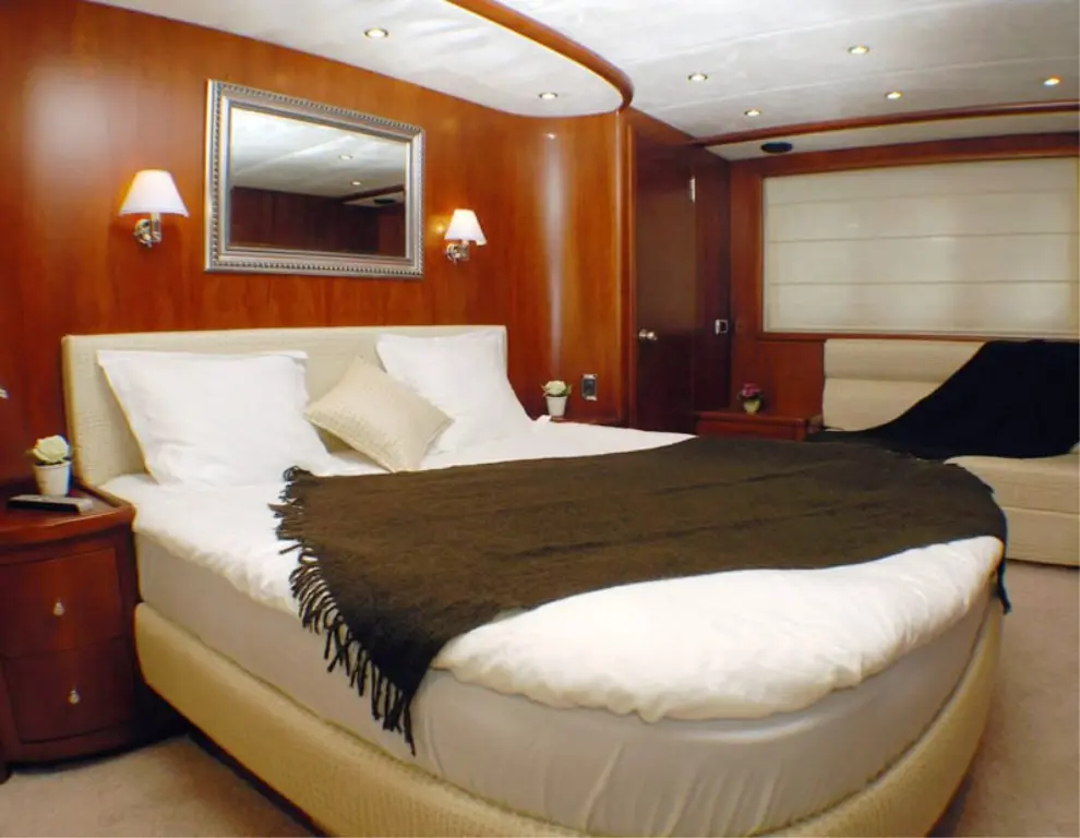 The master cabin is a sanctuary of luxury with a comfortable double bed, ample storage, and an en-suite bathroom with a shower box and electric toilet. Air conditioning ensures a cool and comfortable environment. It also features a TV and DVD player for private entertainment.