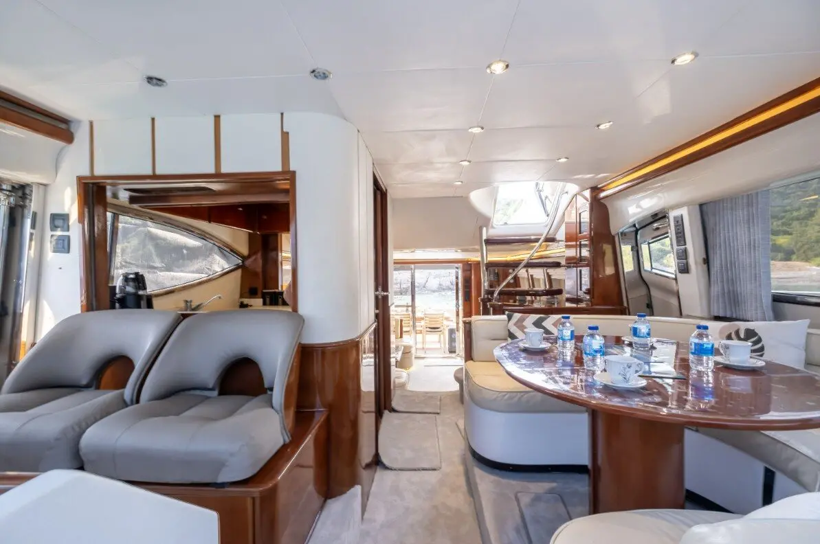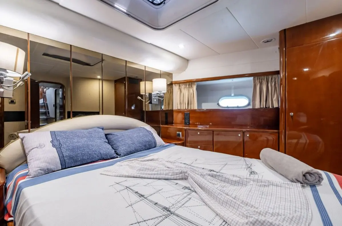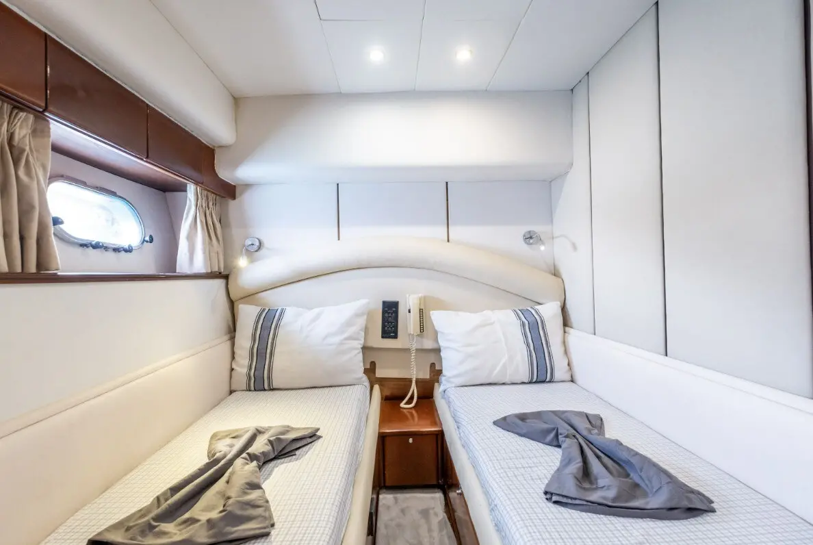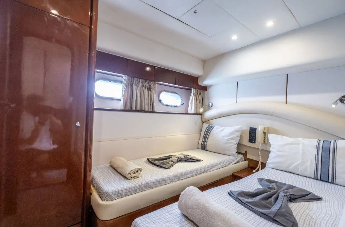 The cabin layout is what makes this yacht shine for larger gatherings. With six separate cabins, it offers more sleeping options than many other yachts in its class.