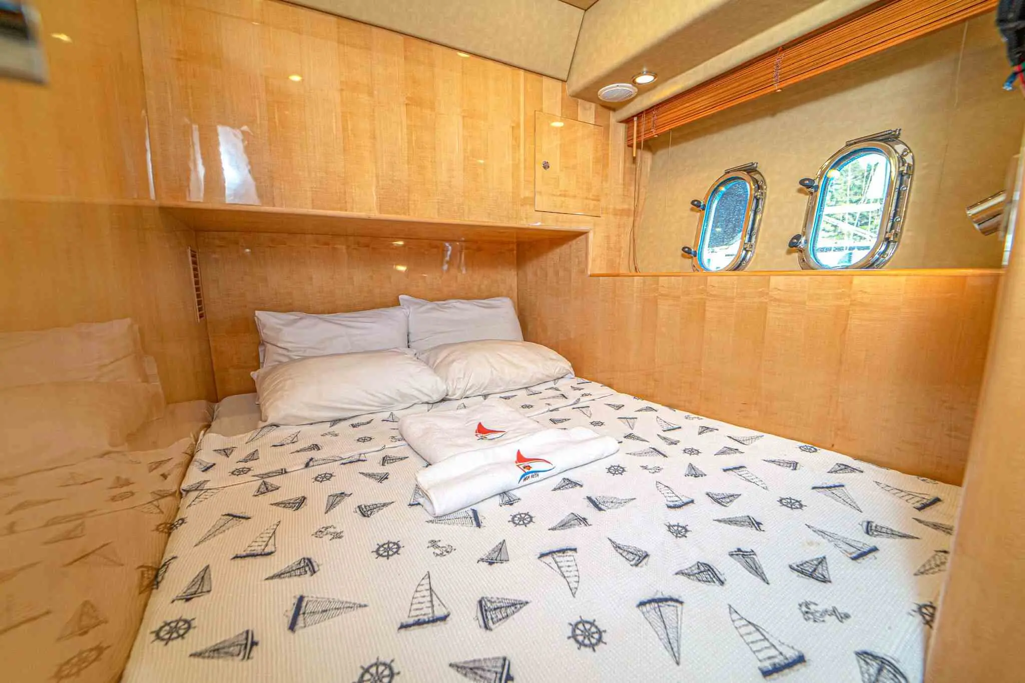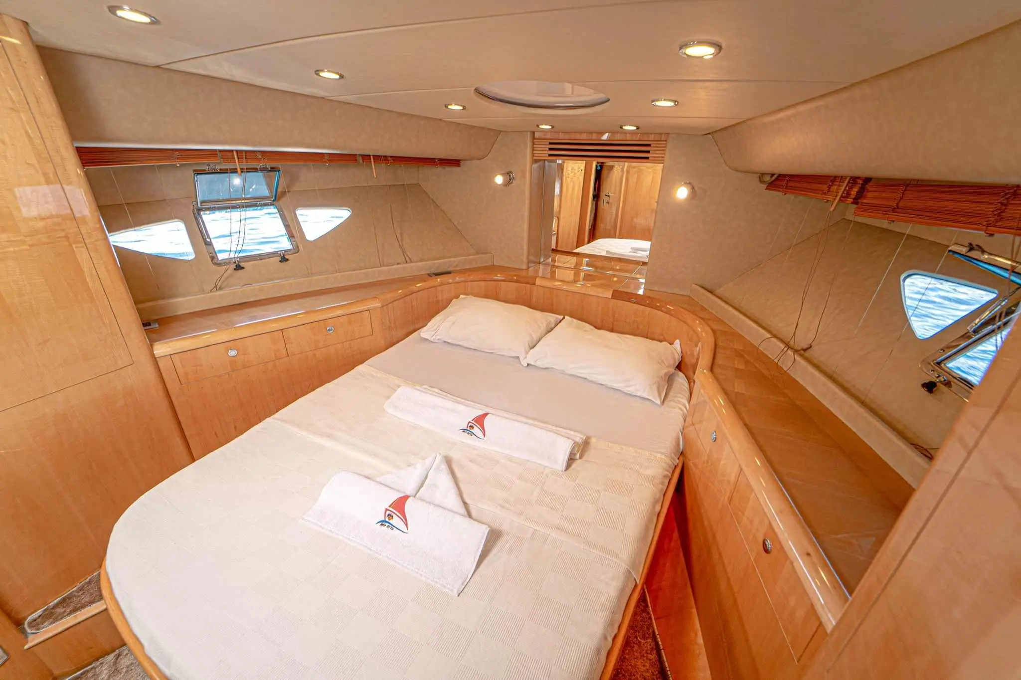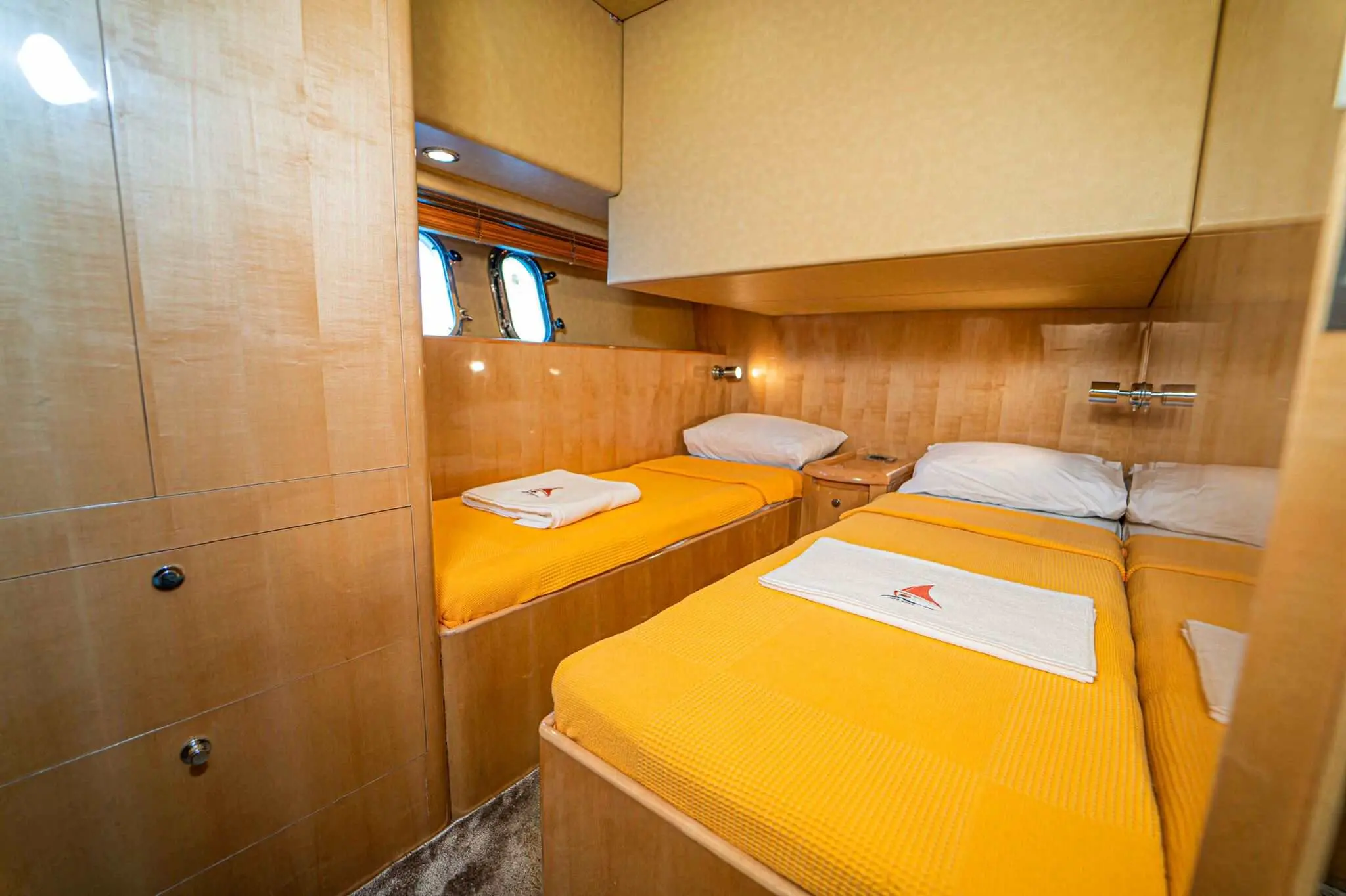The yacht houses three tastefully decorated cabins: a master suite, a double, and a twin cabin, each equipped with air conditioning and private shower facilities. The attention to detail in each cabin creates a welcoming and luxurious atmosphere, ensuring rest and privacy.