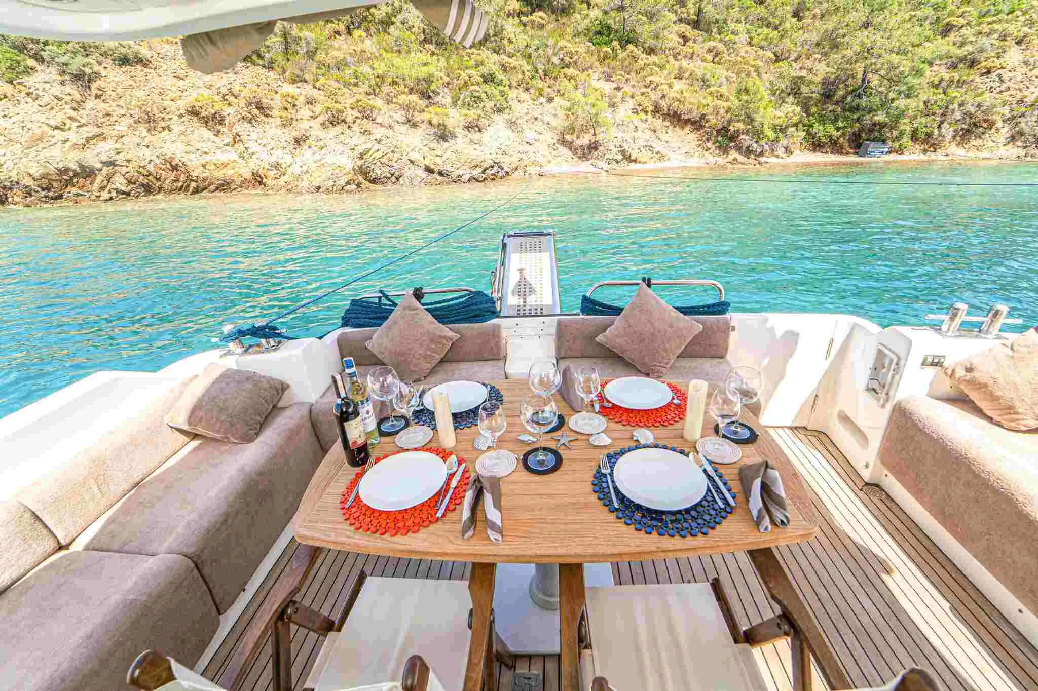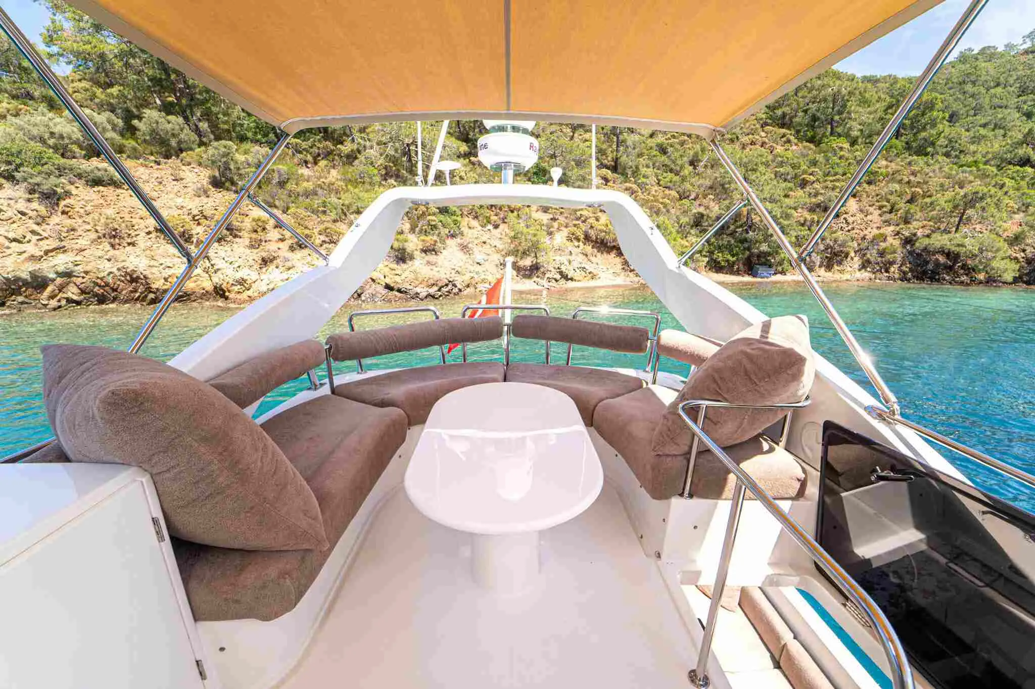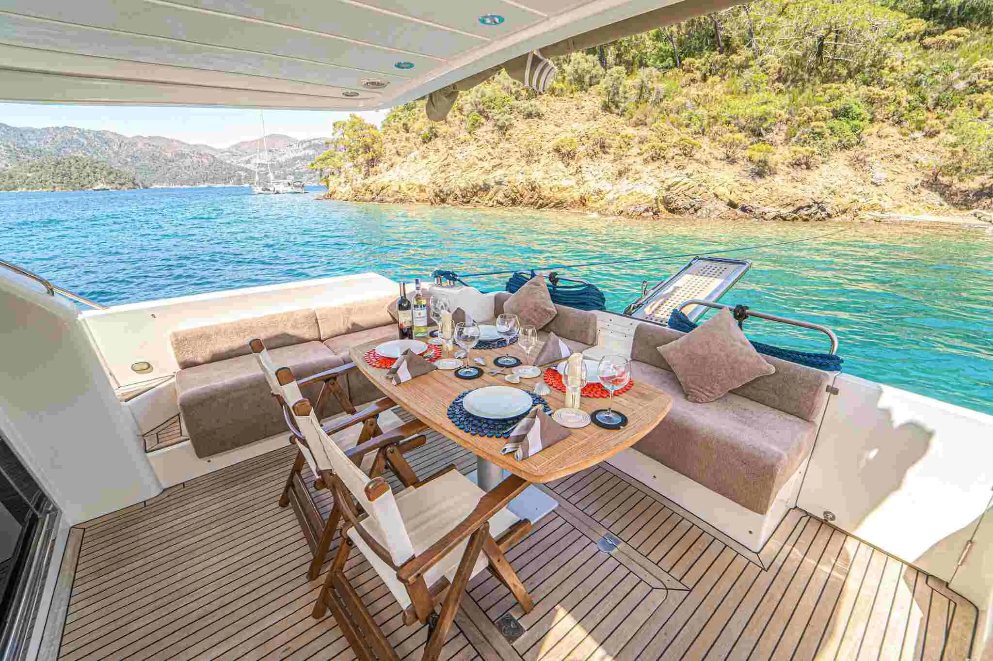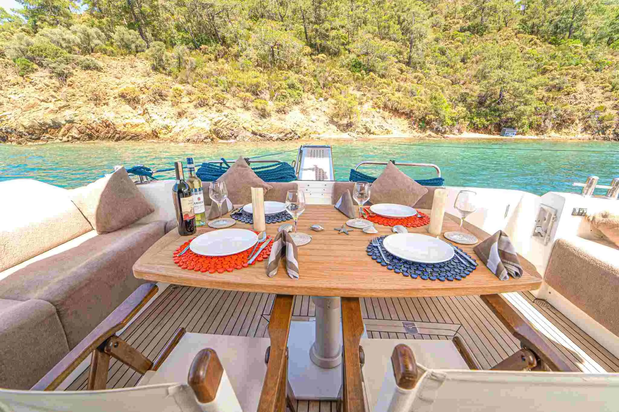 Onboard entertainment options include a TV in the salon, a music system, and wireless internet, providing guests with leisure and connectivity even at sea. The indoor restaurant area offers a comfortable space for enjoying meals and socializing. Powered by twin 550 hp Volvo Penta engines, Imera cruises comfortably at 30 knots. The yacht is equipped with state-of-the-art navigation systems, including radar, GPS, and autopilot, ensuring safe and efficient voyages across the beautiful waters of Göcek.