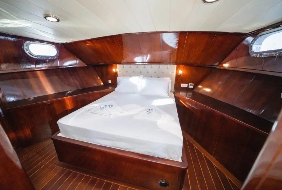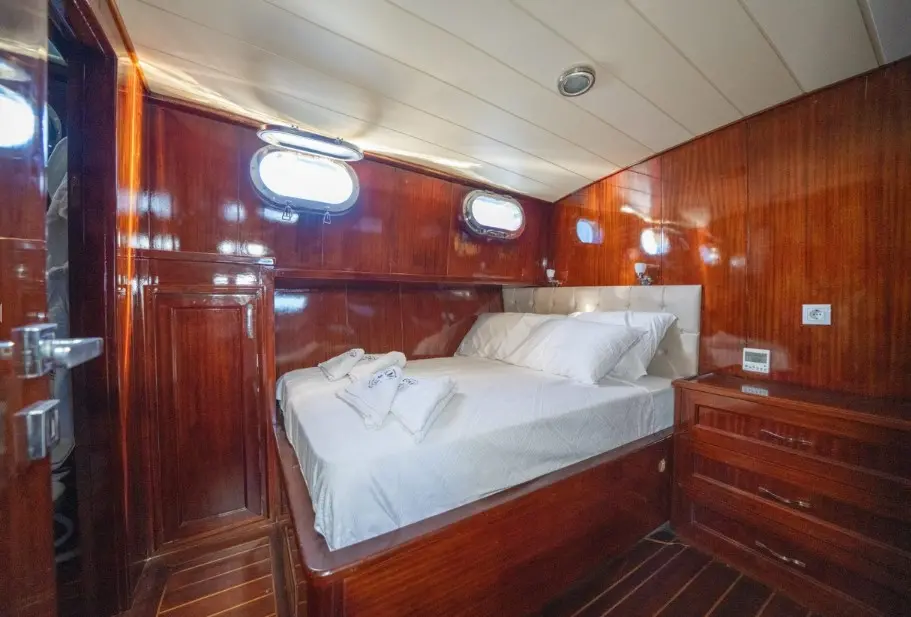 The gulet is designed to accommodate guests in comfort, with a total of three cabins: one master cabin and two double cabins. Each cabin is tastefully decorated, providing a cozy retreat after a day of sailing. The master cabin is the epitome of luxury on board, offering ample space, a comfortable bed, and en-suite bathroom facilities. The decor is elegant yet understated, creating a relaxing environment that complements the natural beauty outside. The two double cabins are equally inviting, designed with the same attention to detail as the master cabin. Each comes with its own en-suite bathroom, ensuring privacy and comfort for all guests.