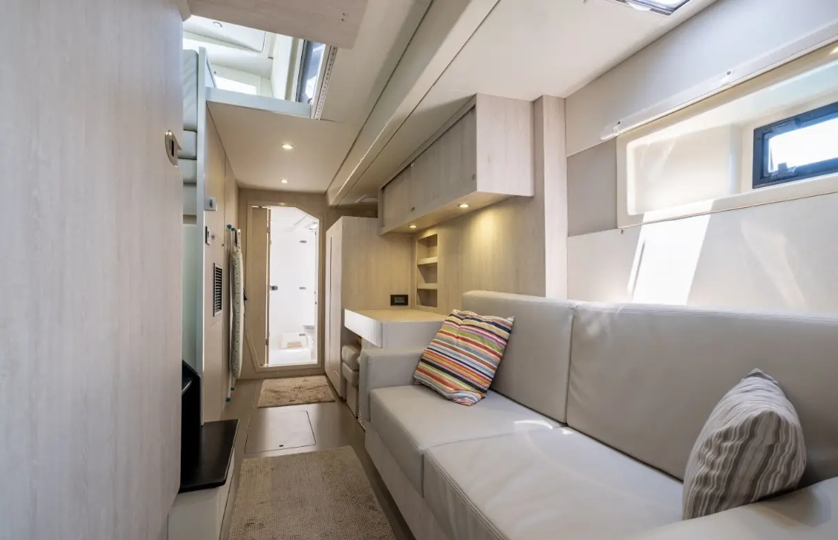 These dimensions make Monaco especially stable and spacious for a vessel its size. The broad beam ensures ample living space, both inside and out, while the efficient twin-hull design enhances balance and minimizes motion—ideal for guests new to sailing or prone to seasickness.