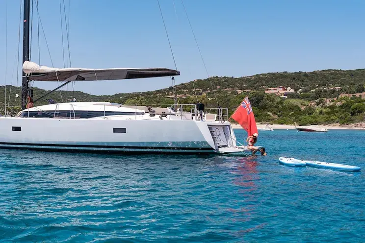 Neyina is equipped with a variety of entertainment options including a 3.85 m Williams Jet Tender with 100hp, a sailing dinghy, paddle boards, water skis, a trampoline, snorkeling gear, an underwater scooter, Wi-Fi, a deck shower, and a swim platform.