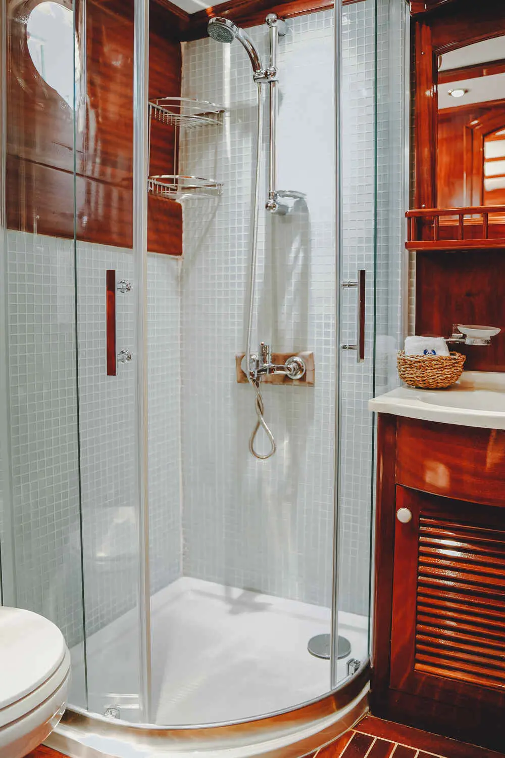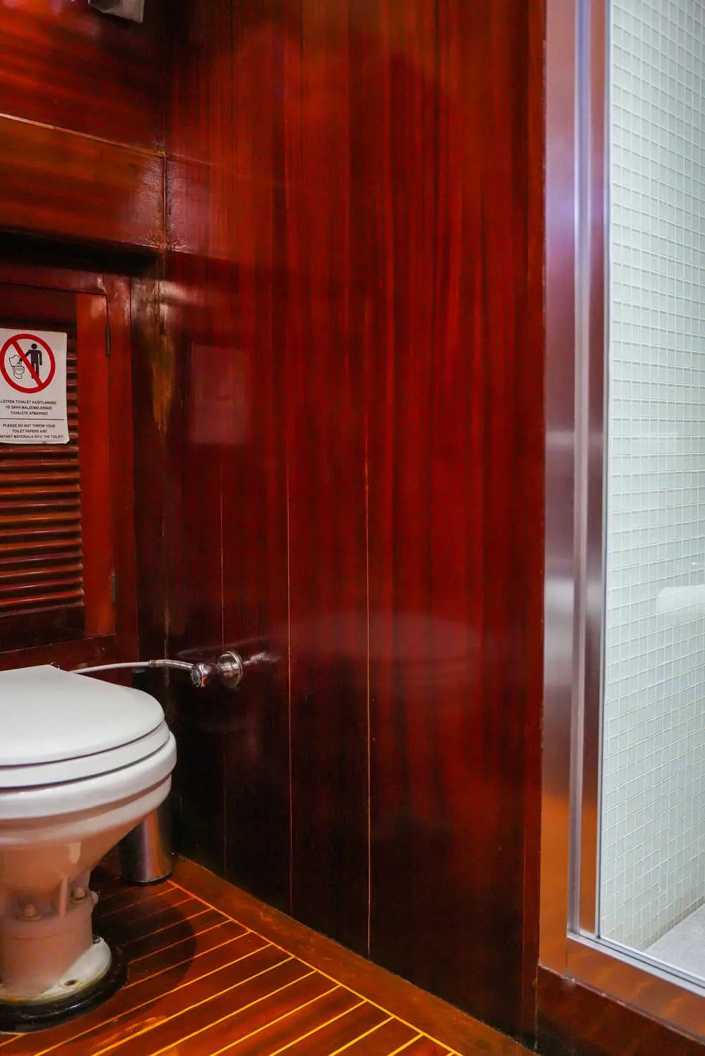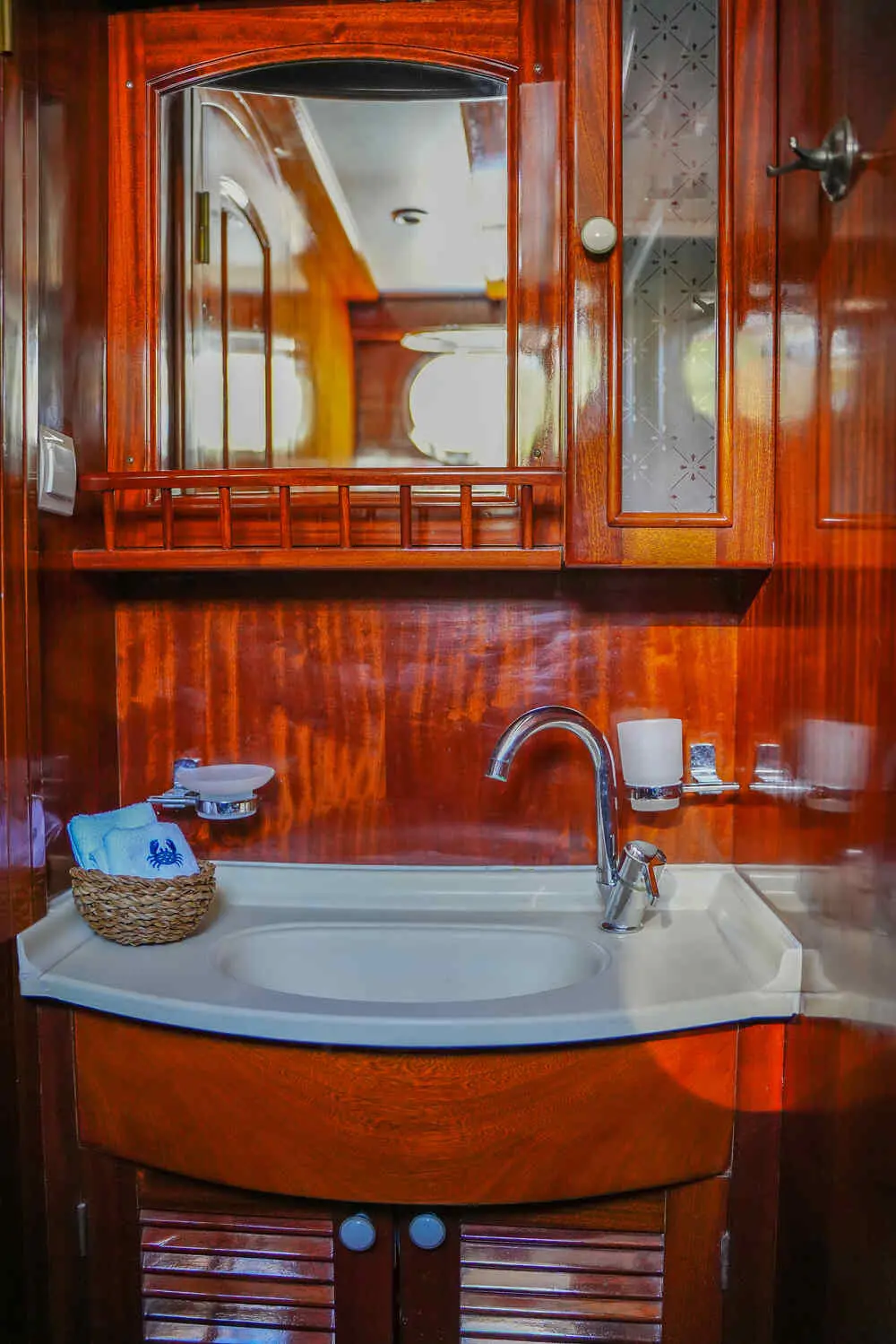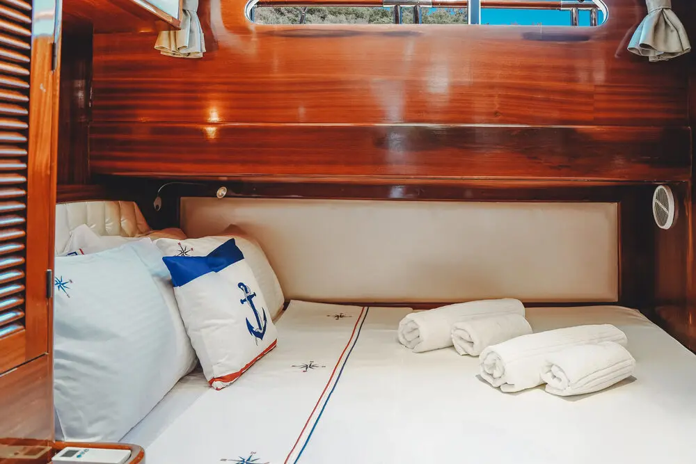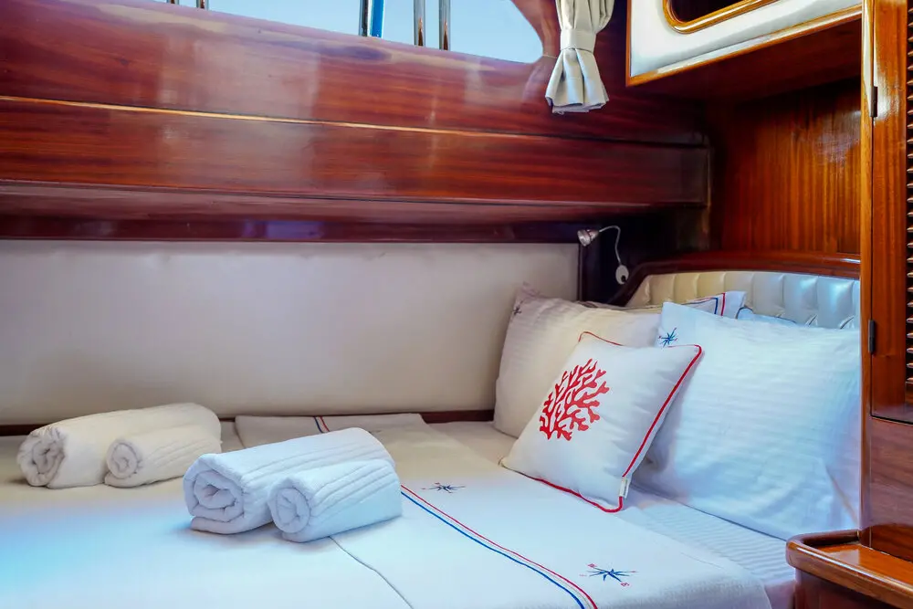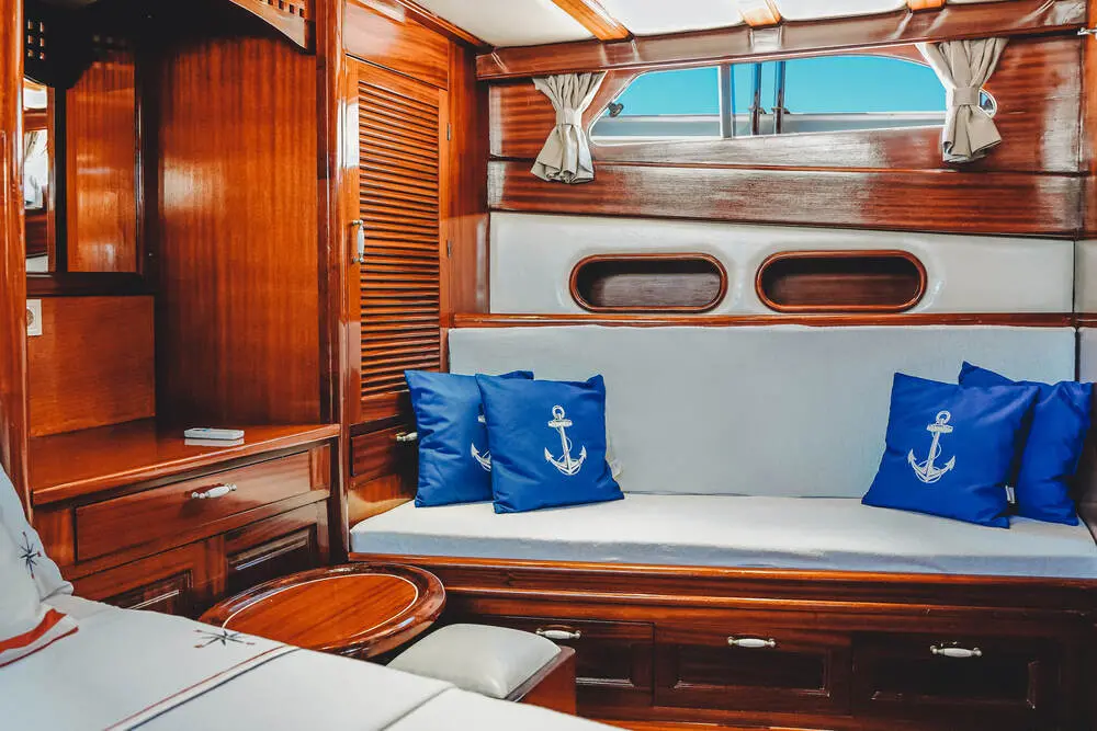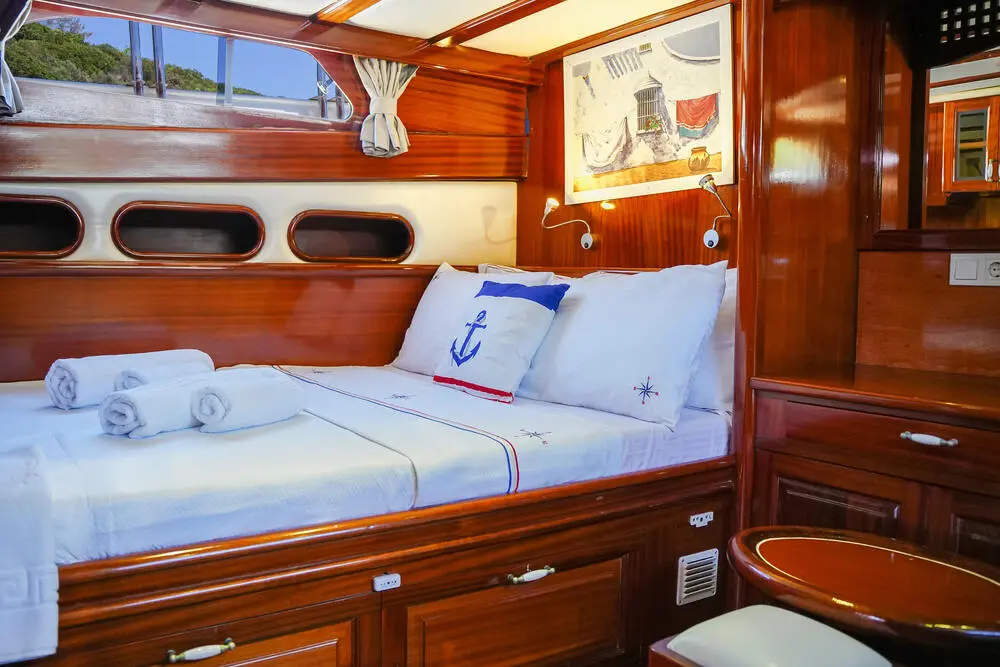 Oalis features three beautifully appointed cabins, including one master and two double cabins. Each cabin is equipped with electric toilettes, air conditioning, and shower boxes, ensuring comfort and privacy. The cabins are designed to provide a restful environment with luxurious bedding and state-of-the-art facilities. Entertainment systems including TV and Wi-Fi are standard in each cabin, enhancing the onboard experience.