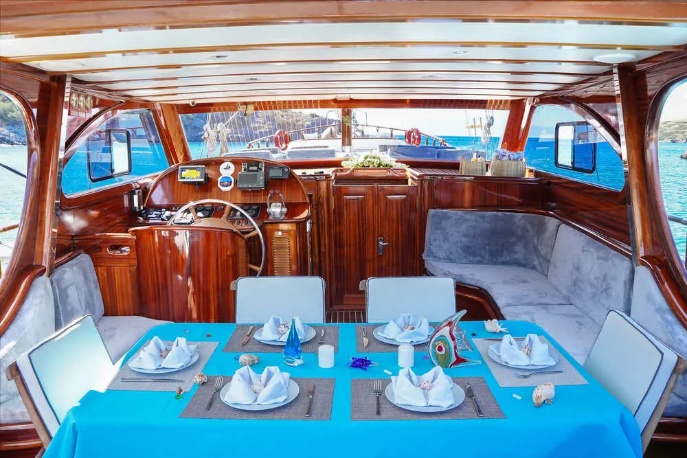 Guests can enjoy a variety of gourmet meals prepared by the onboard chef, featuring local Turkish delicacies and international dishes, all tailored to personal tastes and dietary requirements. Oalis offers a wide range of entertainment options, including a TV, Wi-Fi, and a selection of water sports equipment like snorkeling gear, a fishing kit, and sailing equipment. The deck also features a shower and areas perfect for sunbathing or enjoying the scenic views.