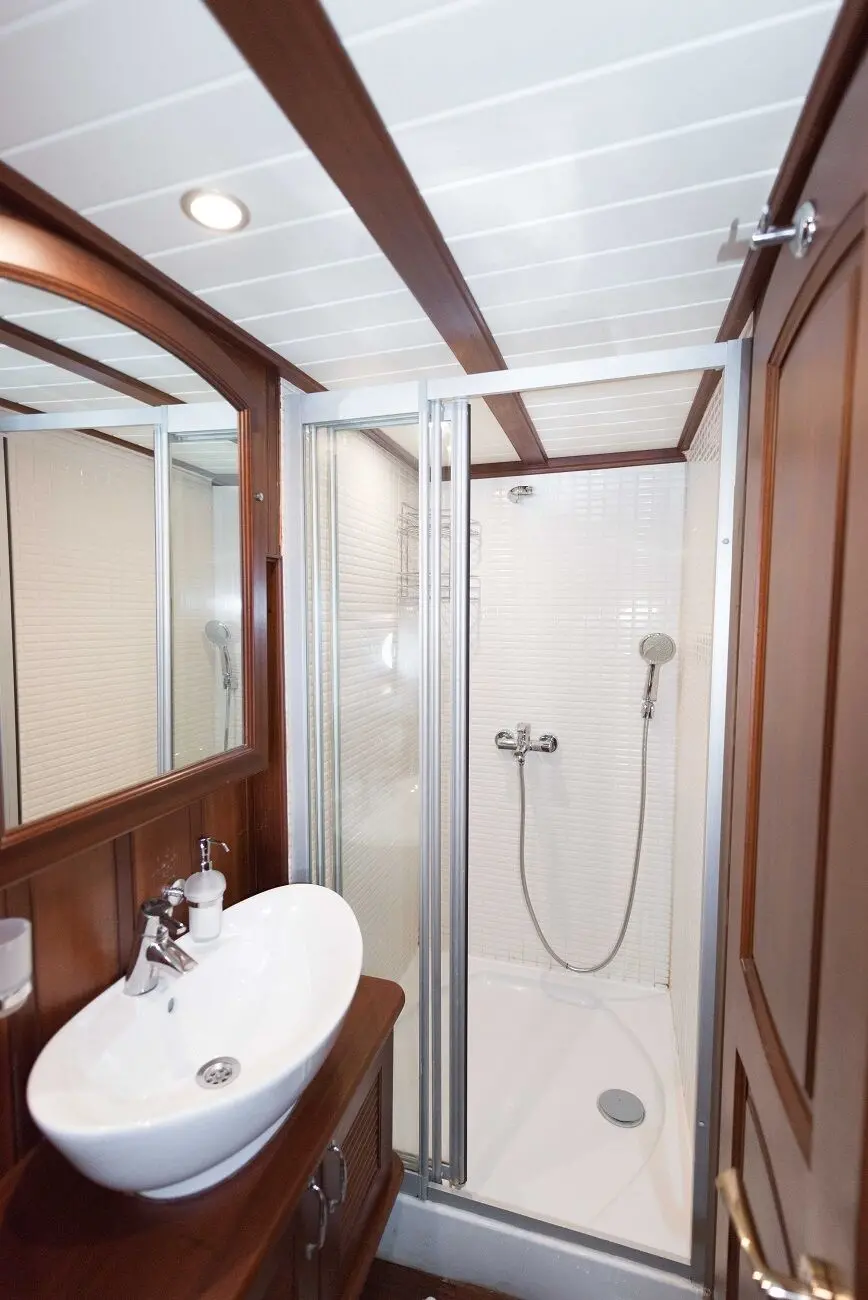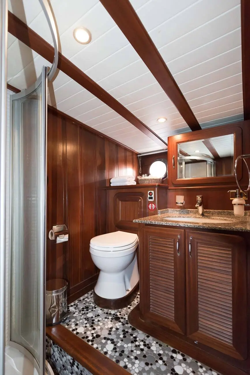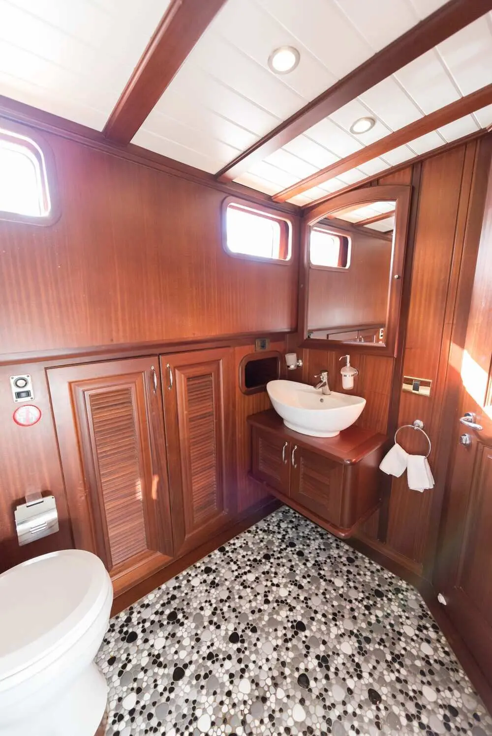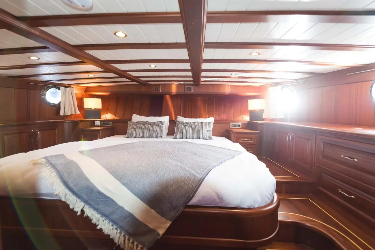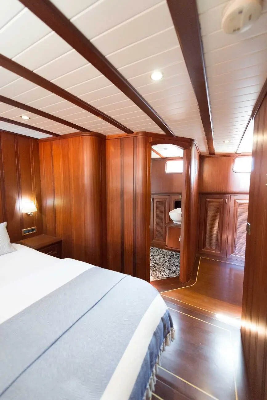 The yacht boasts three master cabins, each featuring full air conditioning, private shower facilities, and elegant décor, ensuring a comfortable and luxurious stay for up to six guests. Each master cabin is a sanctuary of comfort, with fine linens, ambient lighting, and ample storage space, providing guests with a private retreat after a day of sun and sea.