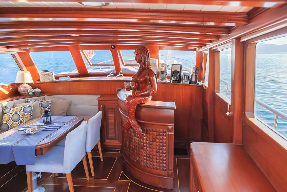 The yacht’s journey from its initial construction to its latest refurbishment reflects a commitment to maintaining its classic heritage while integrating modern amenities to enhance guest comfort and safety. At 21.50 meters long with a beam of 5.70 meters, Primadonna offers a stable and spacious environment. Powered by a 380 hp CAT engine and equipped with a 22 kW Onan generator, it cruises at a gentle pace of 10 knots, ideal for leisurely exploration.
