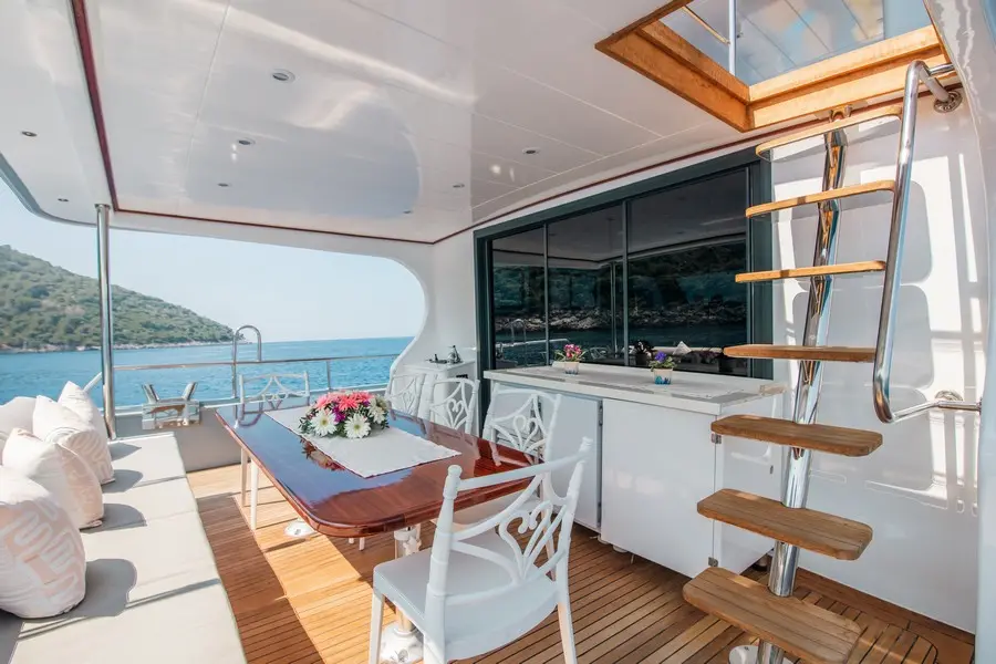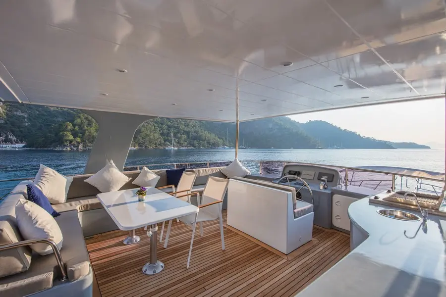 Proudly flying the Turkish flag, the Motor Yacht Royal RTT is based in Fethiye, a renowned hub for yachting. This base provides easy access to stunning destinations like Göcek, Oludeniz, and the hidden bays of the Turkish Riviera.