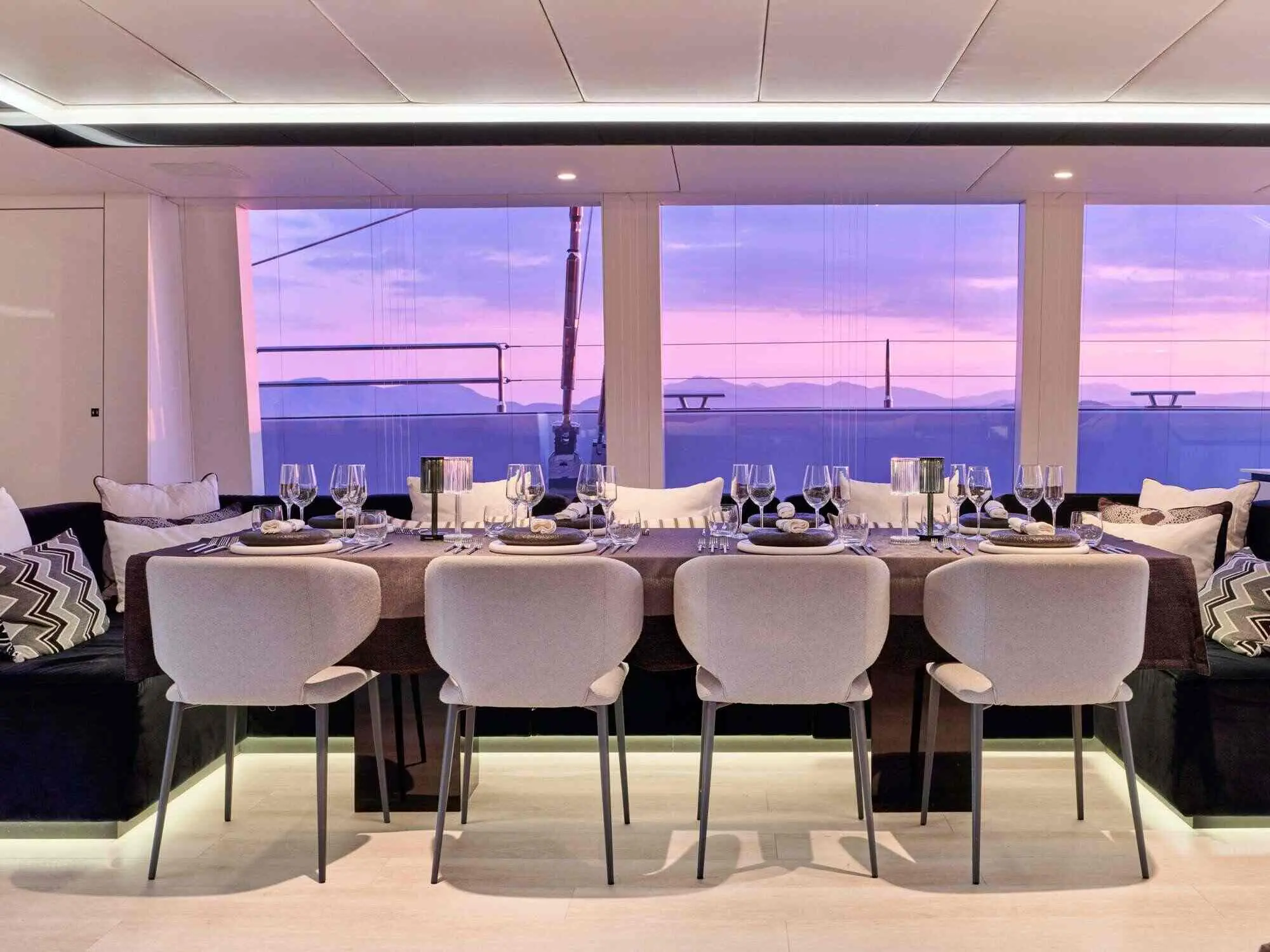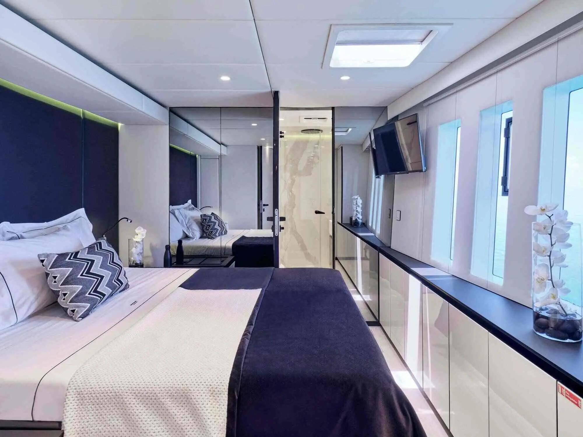 The Sunreef 80 Above & Beyond accommodates up to 8 guests across four luxurious cabins, each designed with comfort and elegance in mind. All cabins include ensuite bathrooms, air conditioning, and elegant finishes for a serene onboard experience.