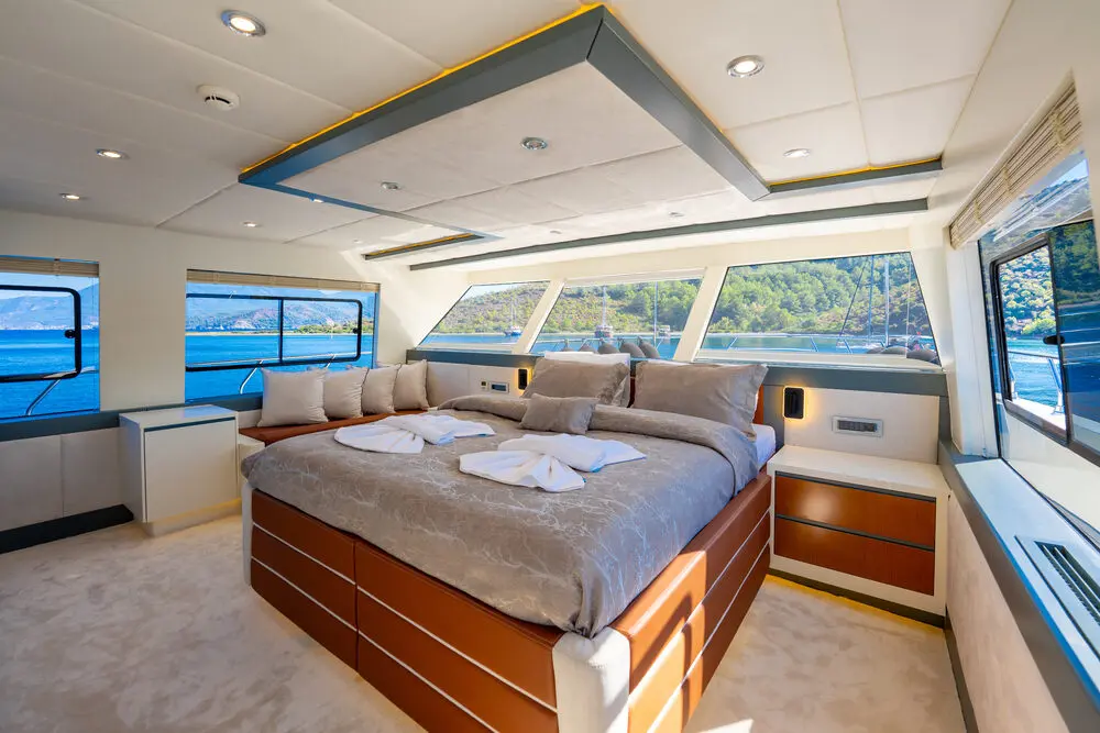 Air Conditioning, Internet Wireless, Swim Platform, LCD and Music System in all cabins and salon, 5.20 mt outborder with 90 HP tender, Ringo, Wakeboard, Sup Board, Crazy Shark (4 pax), Waterski for adults and children, Snorkeling and fishing equipments.
