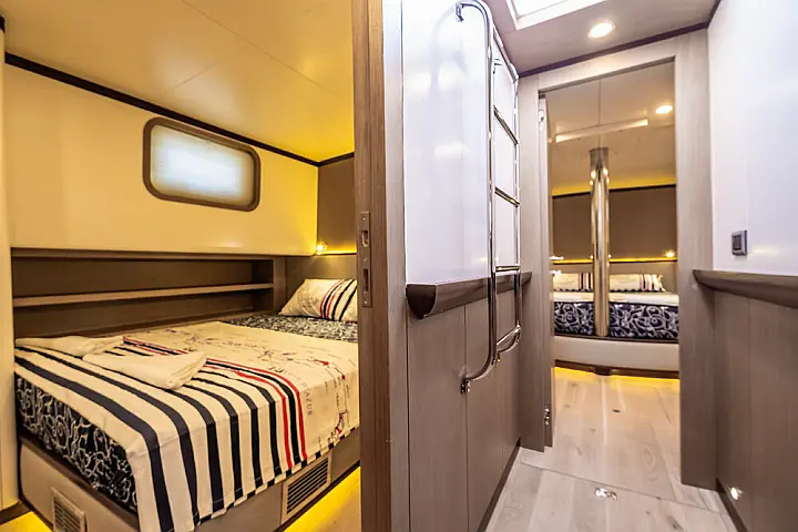 The Gulet Ali'Ce features four beautifully refurbished cabins that offer a tranquil retreat for up to 8 guests. Each cabin is designed with a blend of traditional Turkish woodwork and modern furnishings, ensuring both style and comfort.