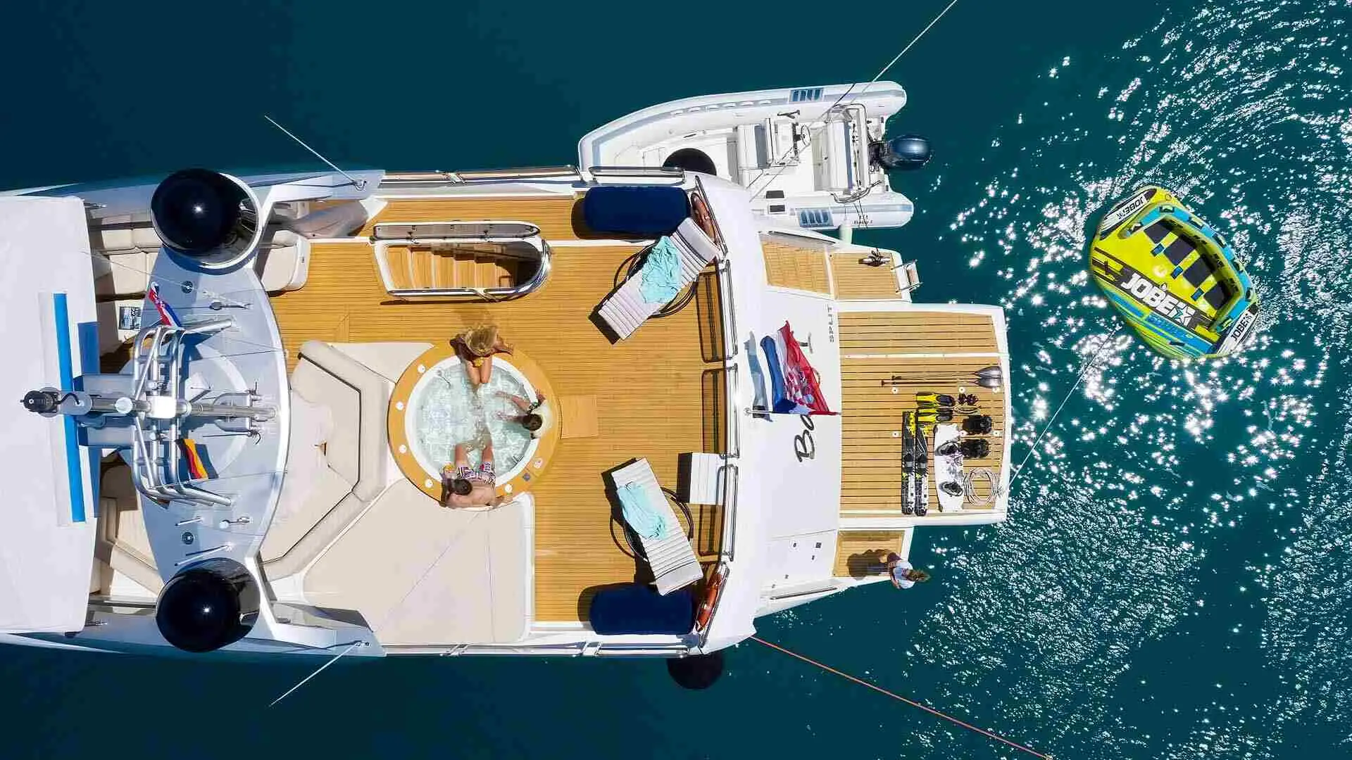 Novournaia tender 530 with Yamaha 130 HP, Jet ski Sea Doo 90 HP, Water skis, Wakeboard, SeaBob, Donut, SUP, Jobe, Snorkeling equipments, Jacuzzi on the flybridge, BBQ on the flybridge, Coctail bar with icemaker on the flybridge, Lifting platform, Underwater light, Wi-Fi, Deck Jacuzzi, Air Conditioning