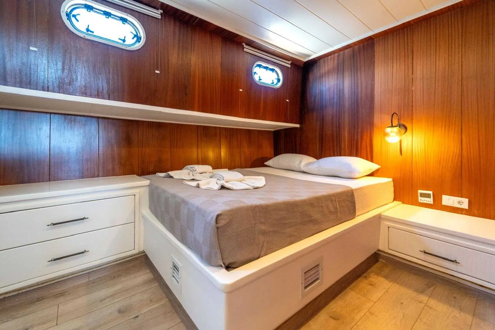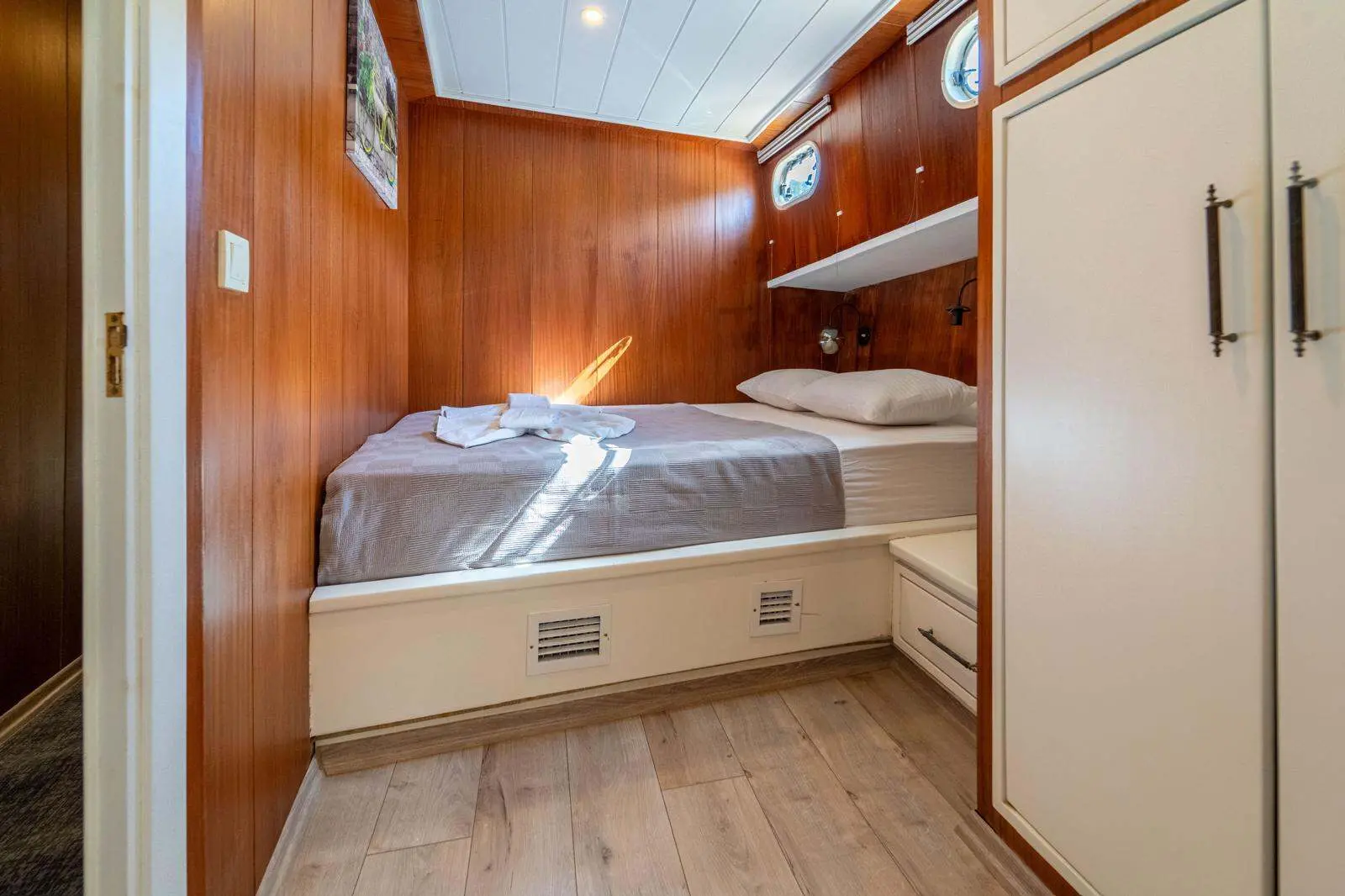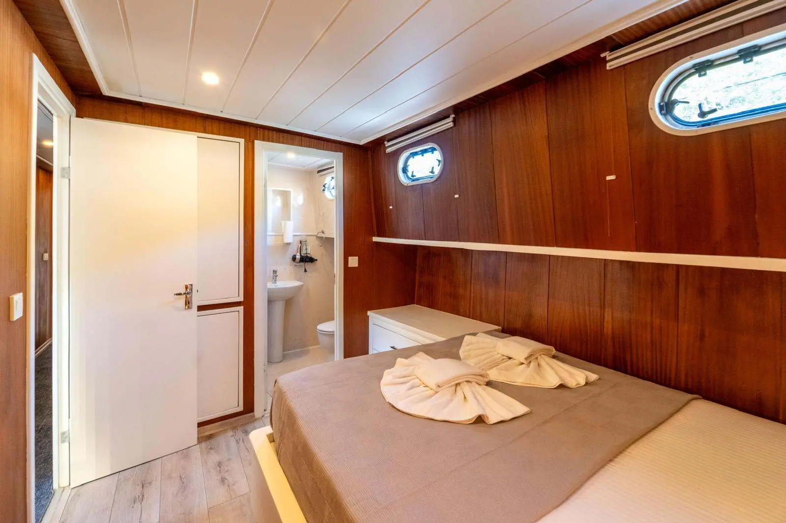 The Gulet Çağay offers spacious and elegantly designed cabins, ensuring a comfortable and stylish stay at sea. The gulet's interior is designed for relaxation, with modern furnishings, ample storage, and large windows offering stunning sea views.