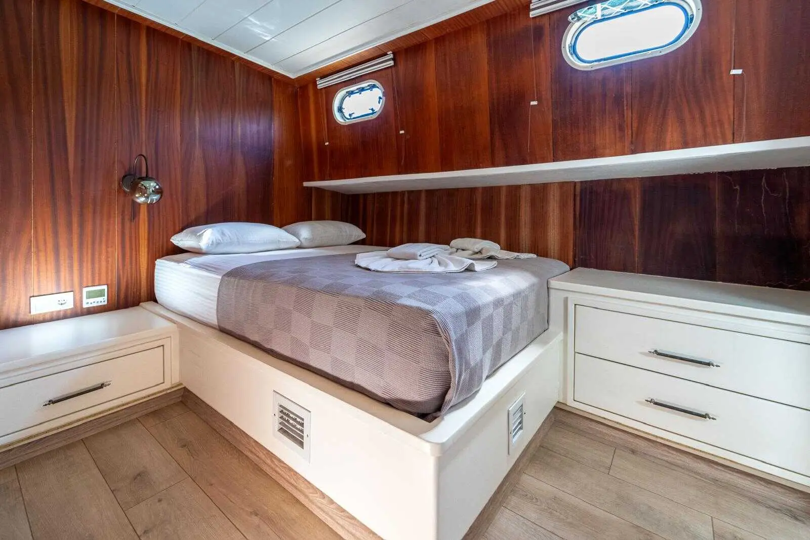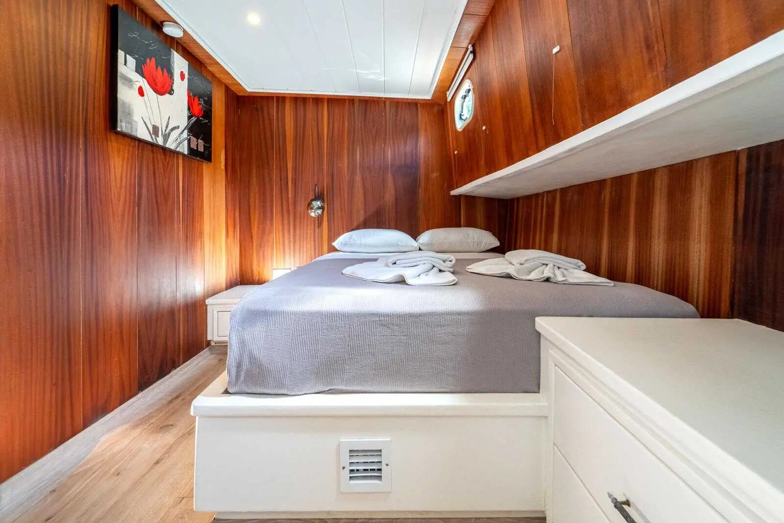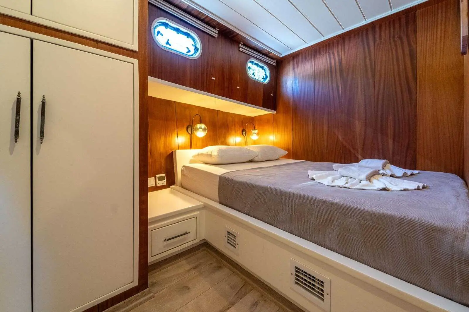 The Gulet Çağay offers spacious and elegantly designed cabins, ensuring a comfortable and stylish stay at sea. The gulet's interior is designed for relaxation, with modern furnishings, ample storage, and large windows offering stunning sea views.