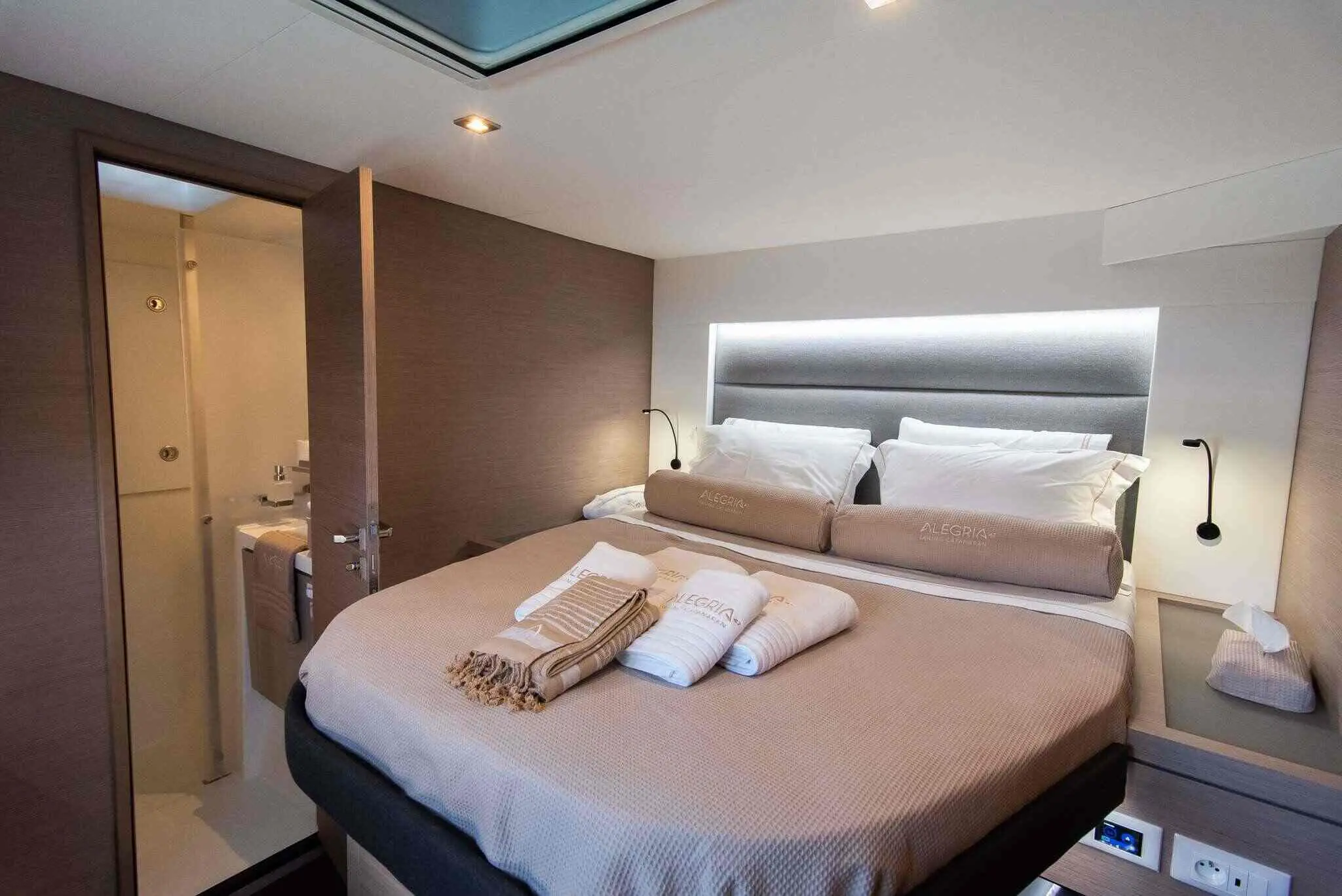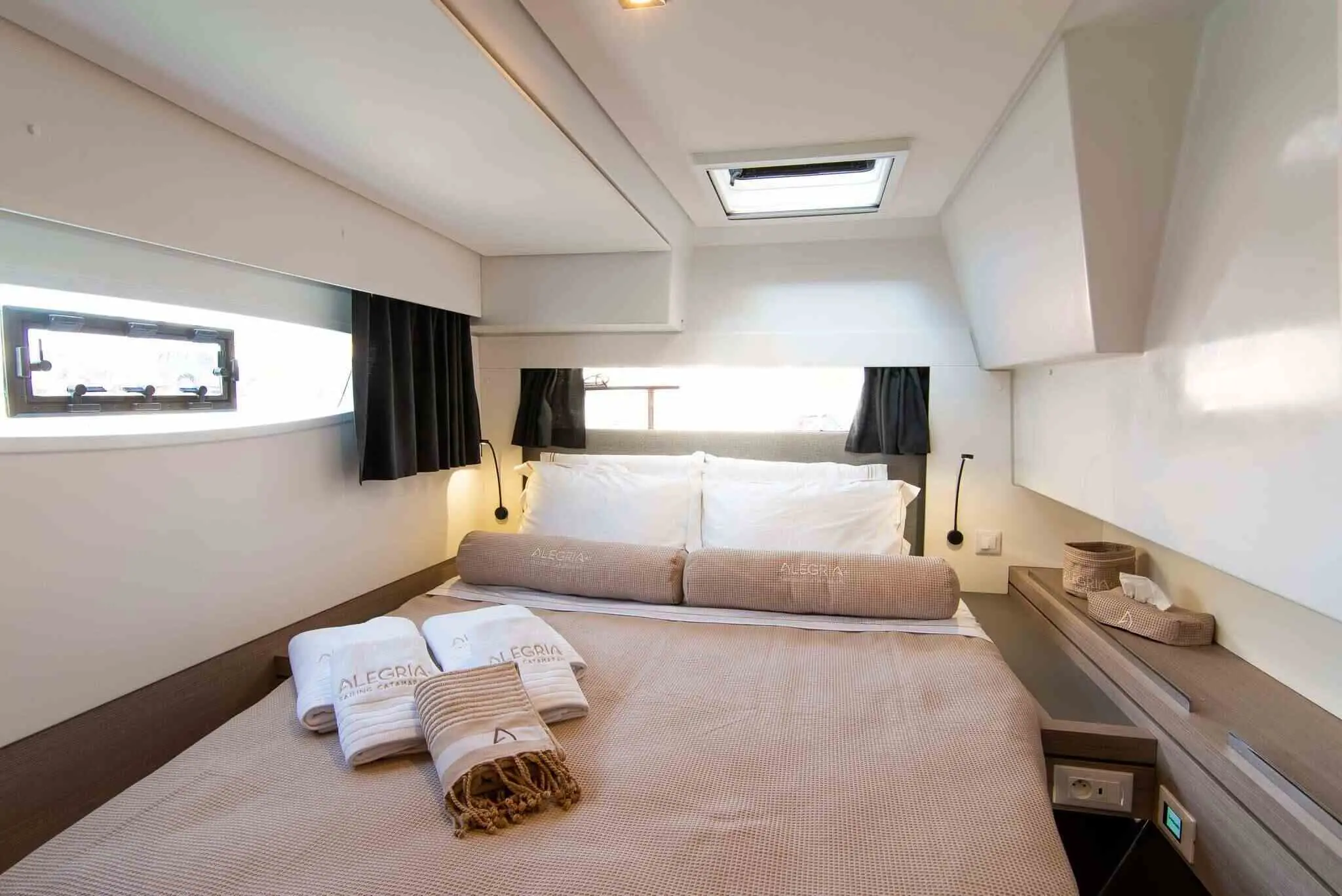 This spacious Saona 47 catamaran is built for both luxury and performance. The 7-knot cruising speed ensures a smooth and enjoyable ride, perfect for island hopping in Greece. The Saona 47 Alegria catamaran accommodates up to 8 guests in four beautifully designed cabins. With high-end finishes and modern design, these cabins provide a luxurious and comfortable retreat after a day of adventure.