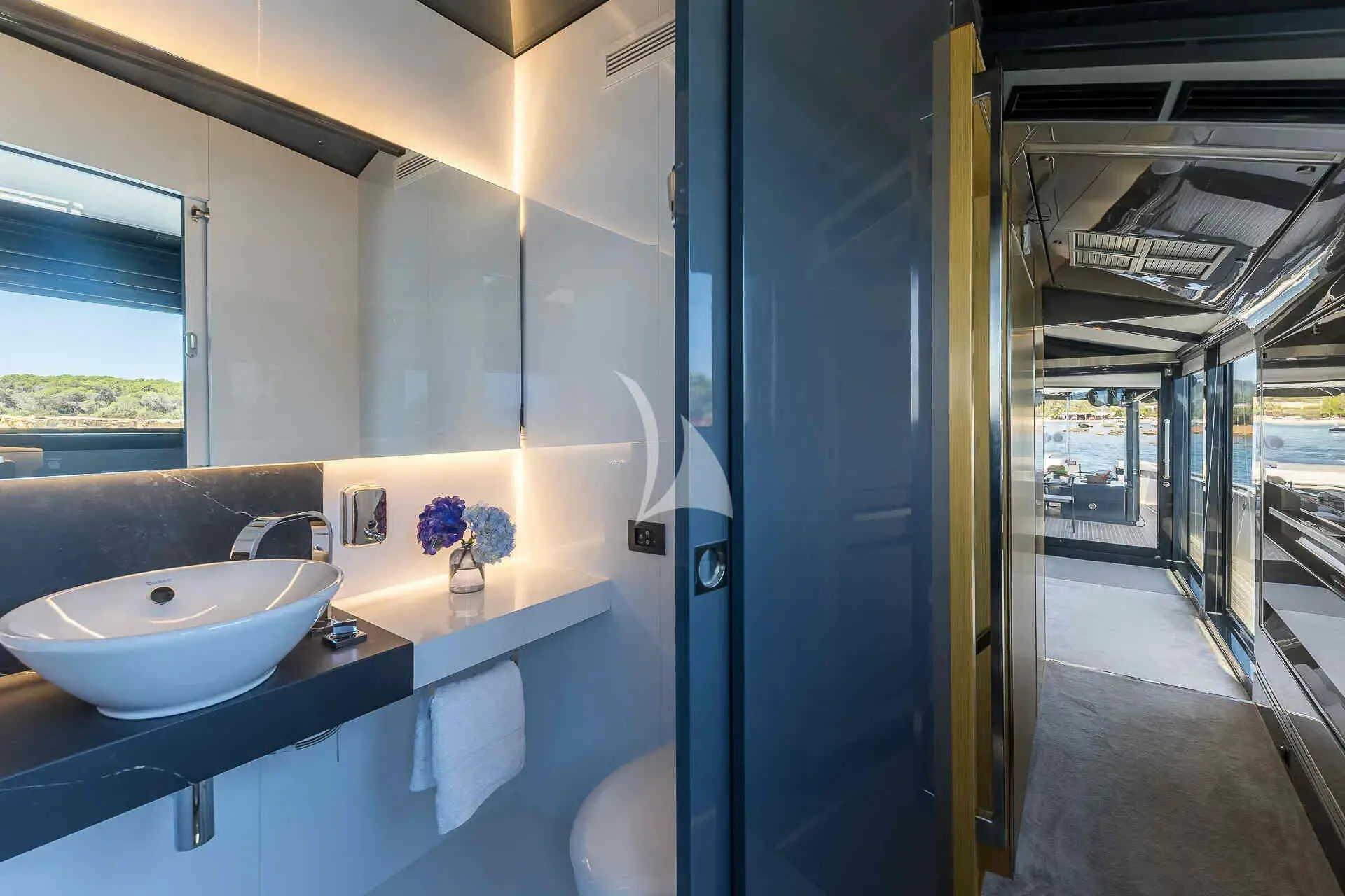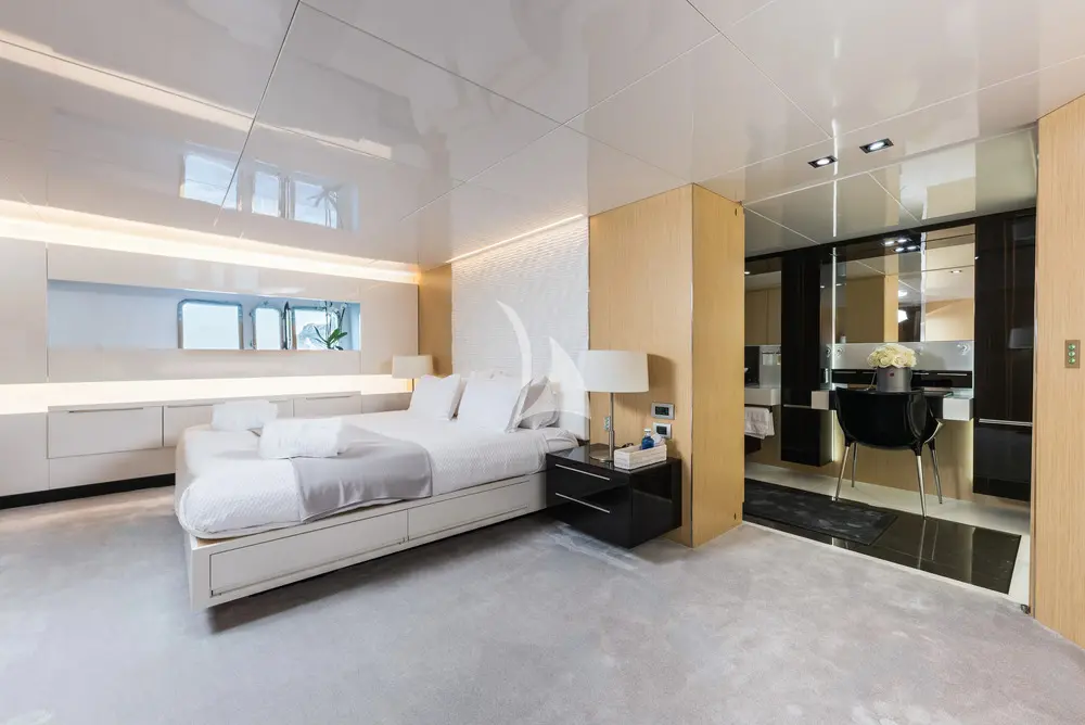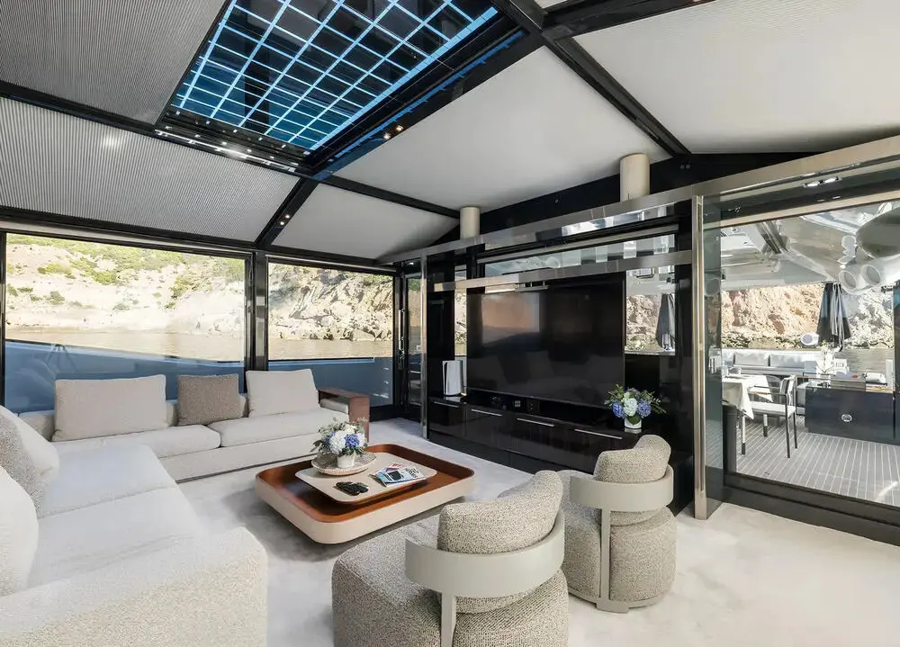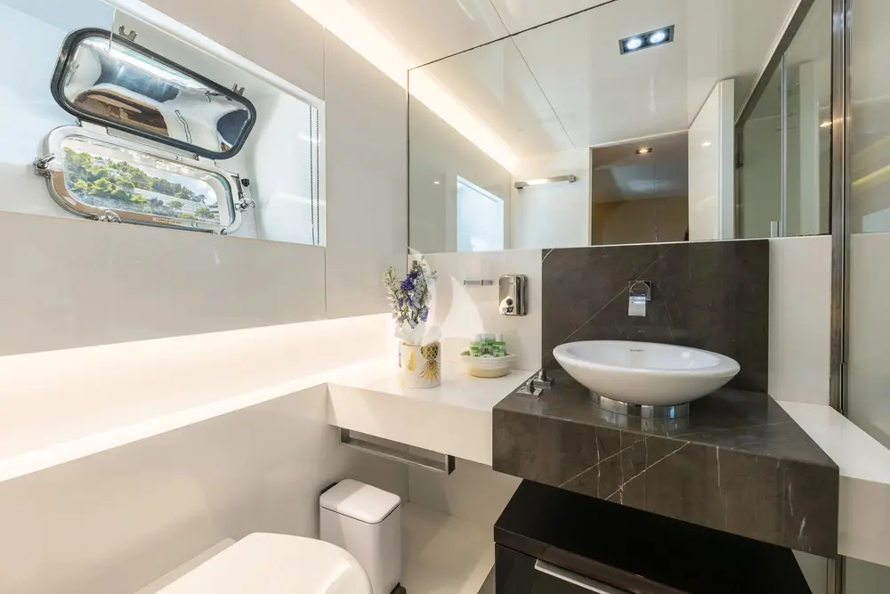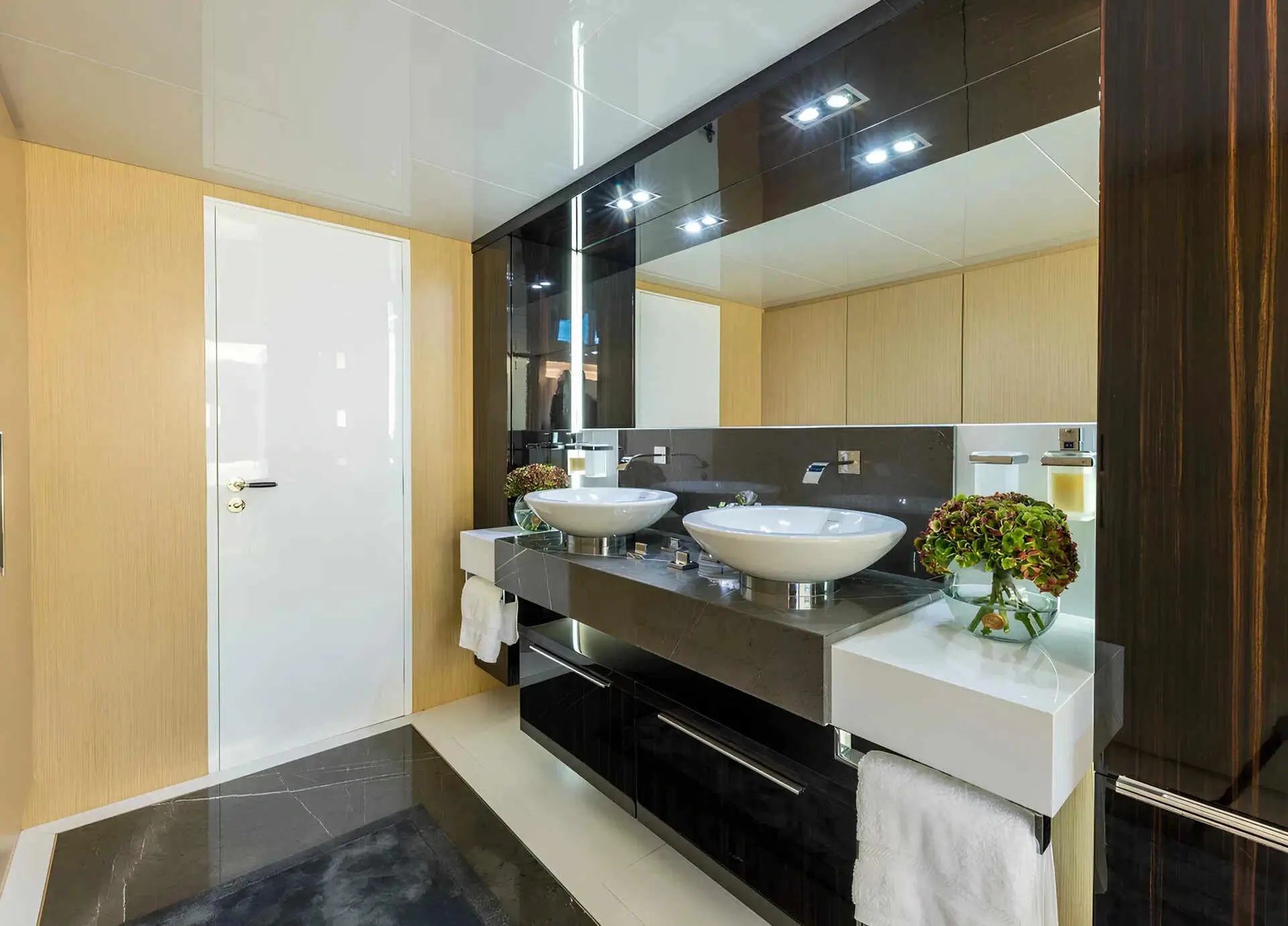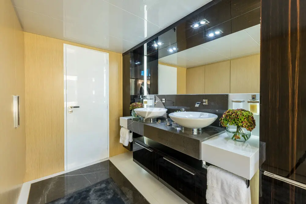 Two 28 kW Kohler generators provide stable and quiet power supply for onboard systems, A/C, entertainment, and all guest amenities. This energy setup, combined with the Arcadia build, enhances overall fuel efficiency and eco-friendly operation.