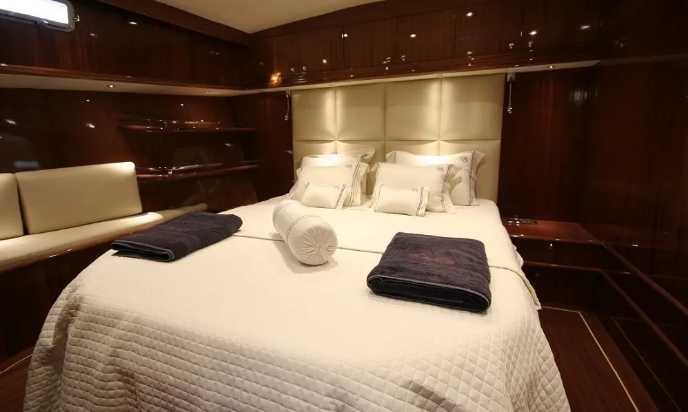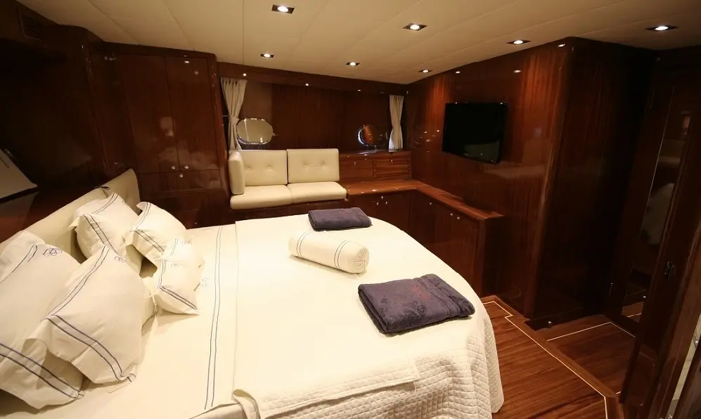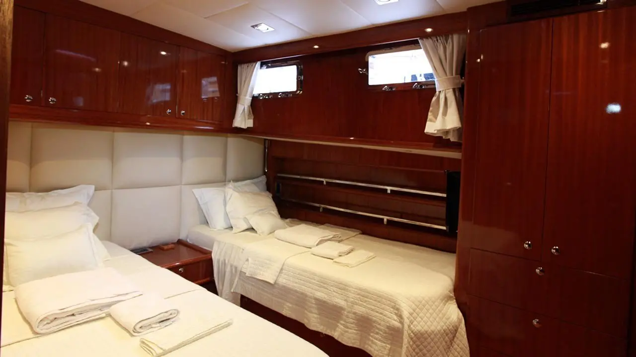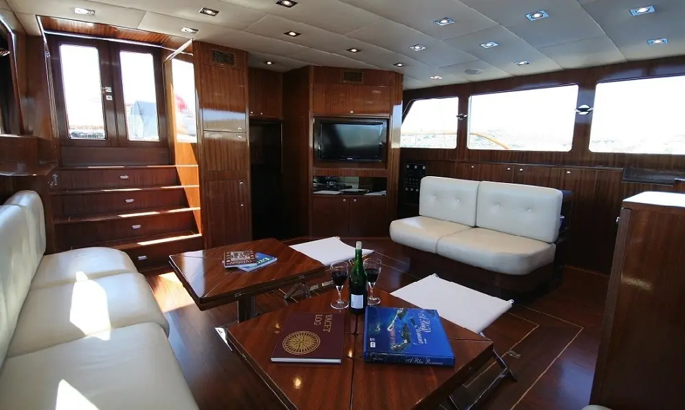 With a beam of 6.50 meters and a draft of 2.80 meters, the Didi offers ample space for relaxation and entertainment. Powered by twin 280 hp Fiat engines and equipped with two 22.5 kW Onan generators, it cruises smoothly at 12 knots, ensuring a journey as pleasant as the destinations themselves.