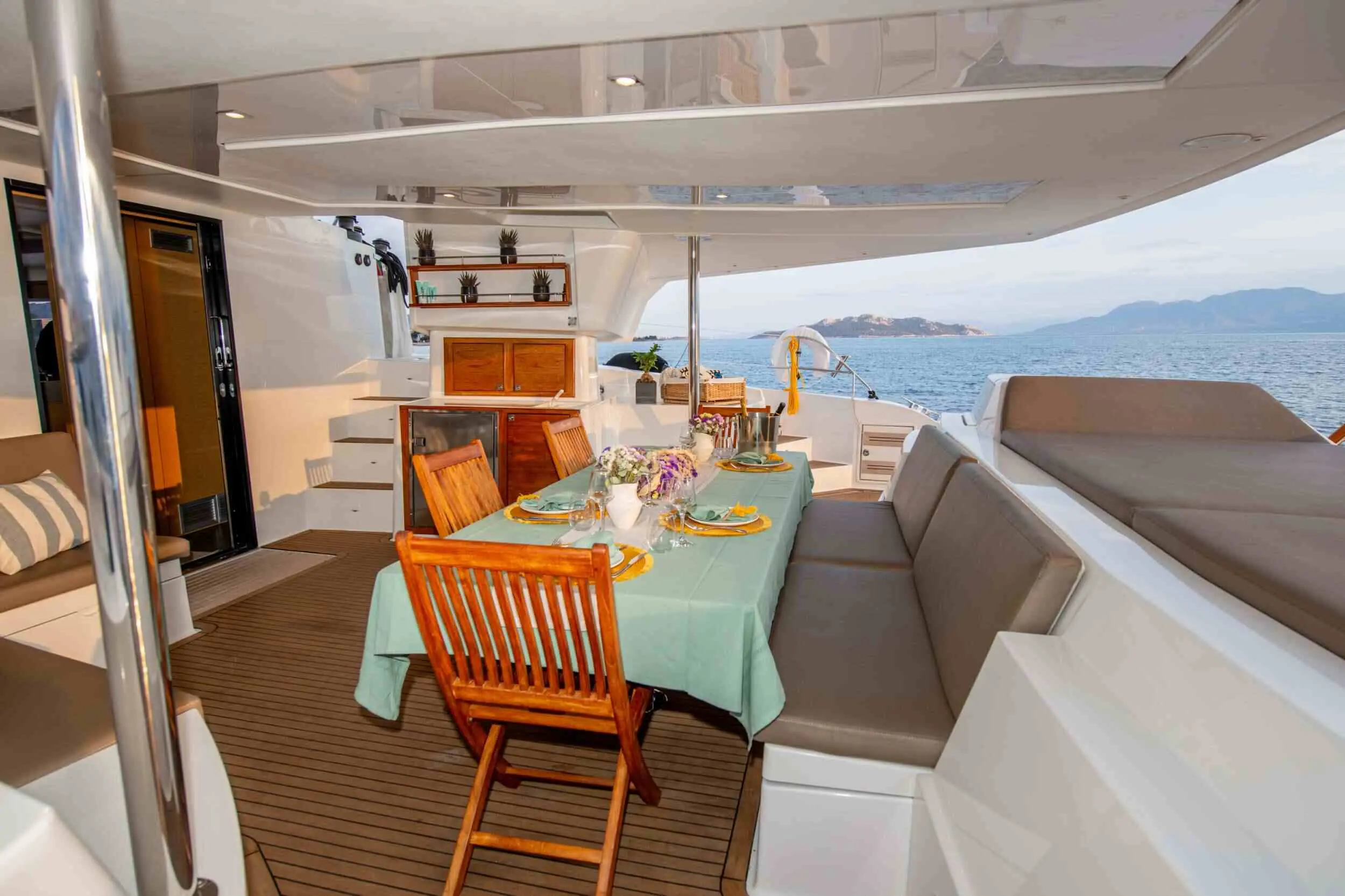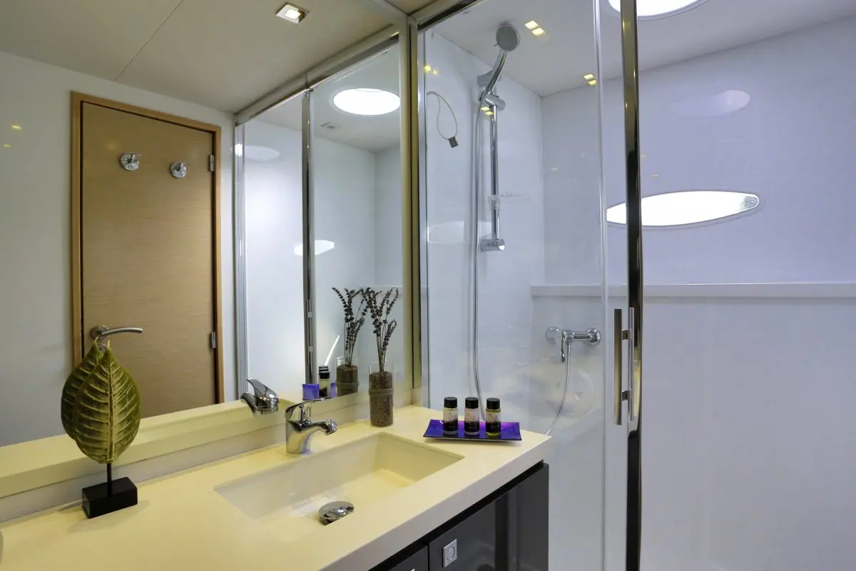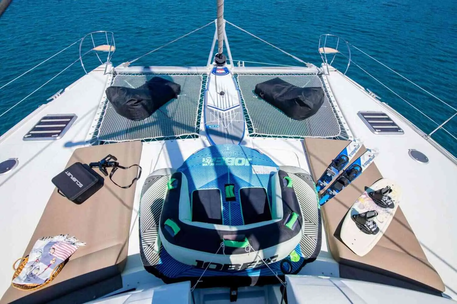Spacious cabins, Great cockpit area with wet bar, Fully equipped, TV in all cabins and saloon, IPOD blue tooth connection in all cabins, Wine cooler, Spider tent for foredeck, 2 x lounging puffs, Board games: Jenga, cards, backgammon and many more, Water purifier (drinkable), Ice Maker, Inverter, Hairdryers, Dine In, BBQ, Bimini, Onboard Wi-Fi, Air Conditioning, Salon Stereo, Satellite TV, Zodiac 4.10 - 50 HP engine, 2 x Paddle board, Water Ski (adults & kids), Scuba Jet (All in one Kit), Inflatable Kayak, Inflatable tube for 2 pax, Wakeboard, Snorkeling gear, Fishing gear, Inflatable donut, Kneeboard