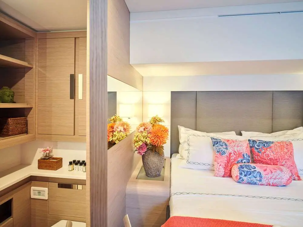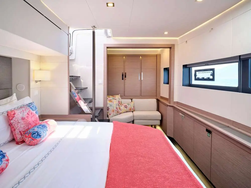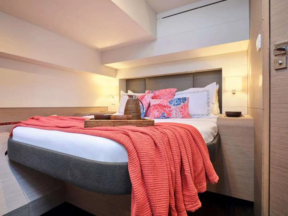 The Kimata accommodates up to eight guests in four luxurious cabins, including one master suite and three double cabins. Each cabin is thoughtfully designed to provide maximum comfort, featuring air conditioning, ensuite bathrooms, and modern furnishings. The layout is perfect for families, couples, or groups seeking a private and luxurious sailing experience.