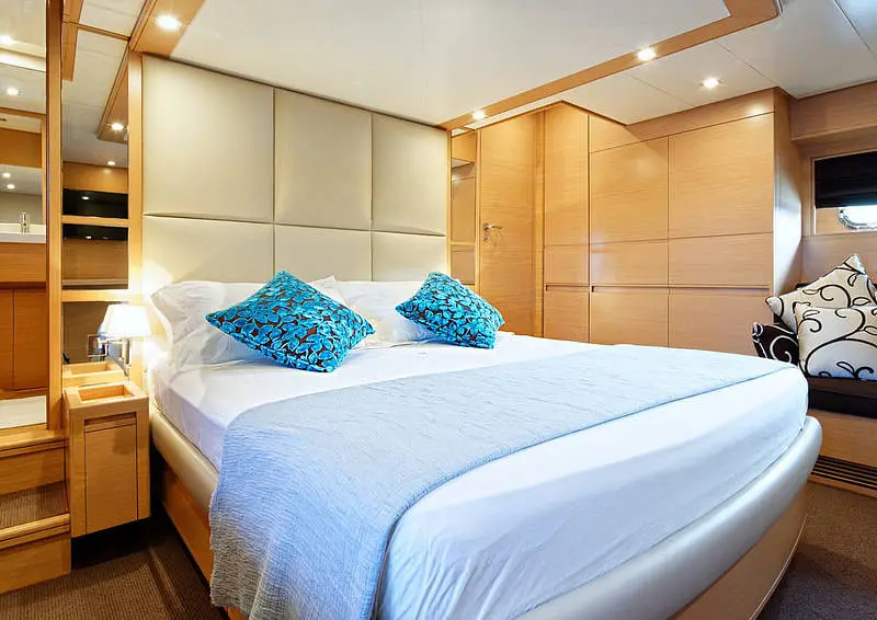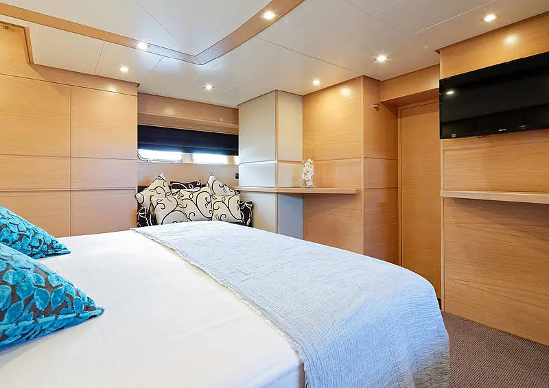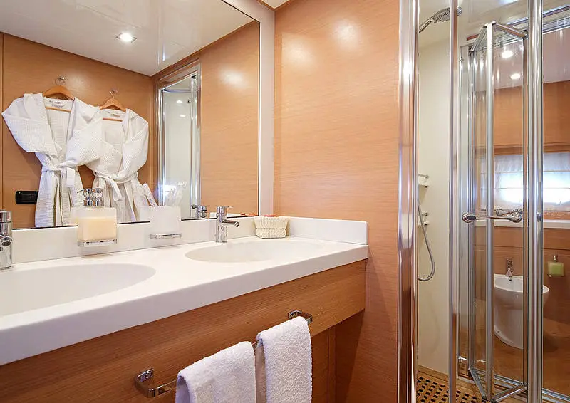 The yacht's interior is a haven of sophistication and comfort, featuring two double cabins and additional sleeping arrangements, all equipped with air conditioning and private bathrooms. Each cabin is a private retreat, offering guests a serene space to unwind after a day of exploration and adventure.