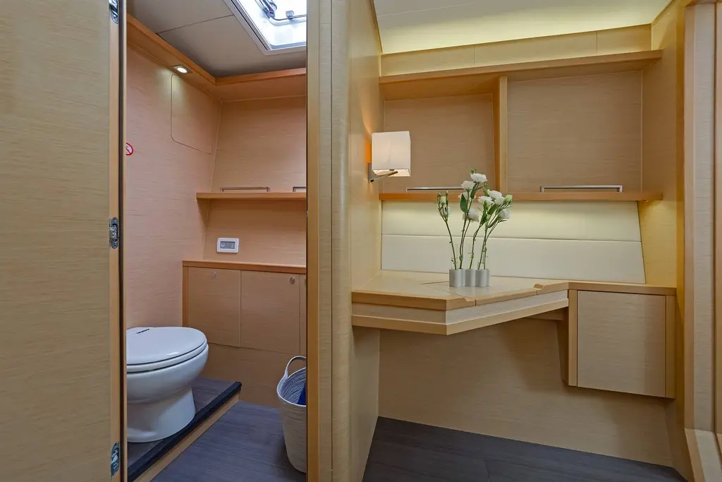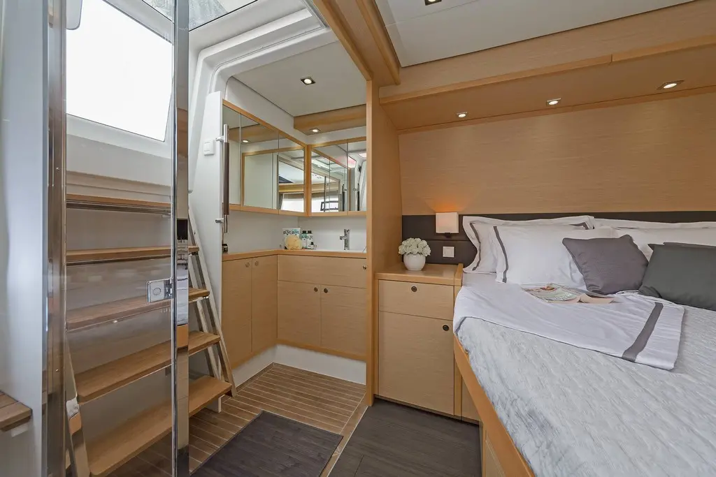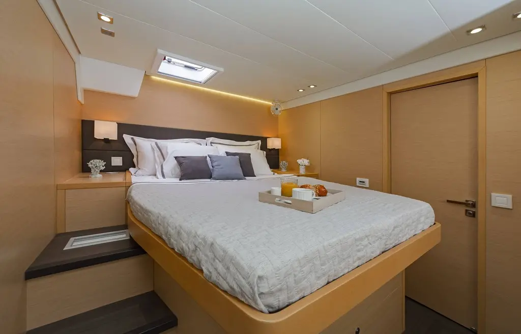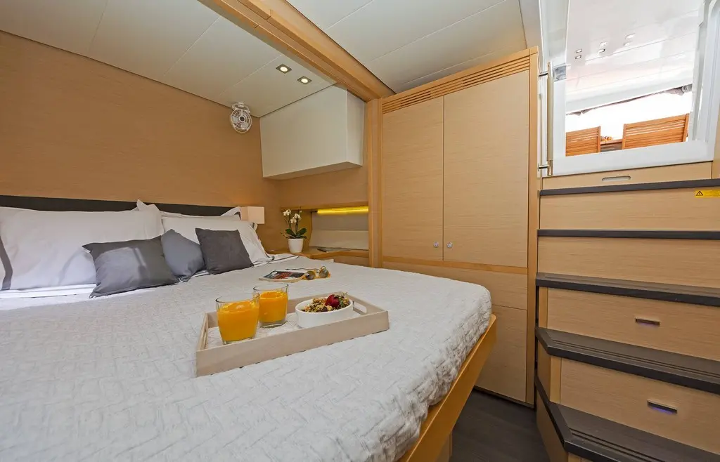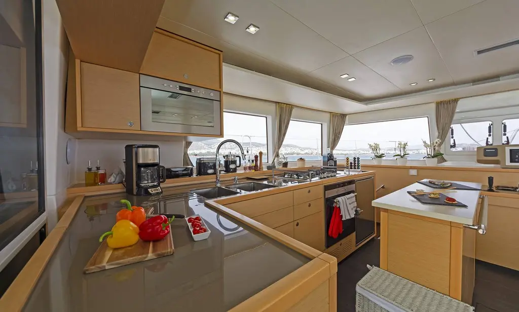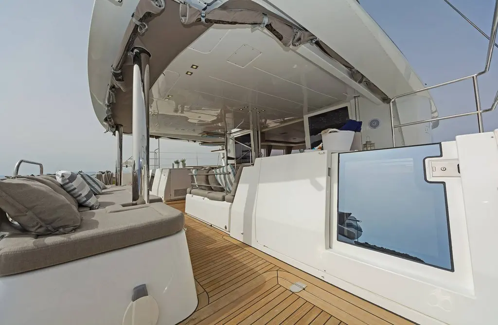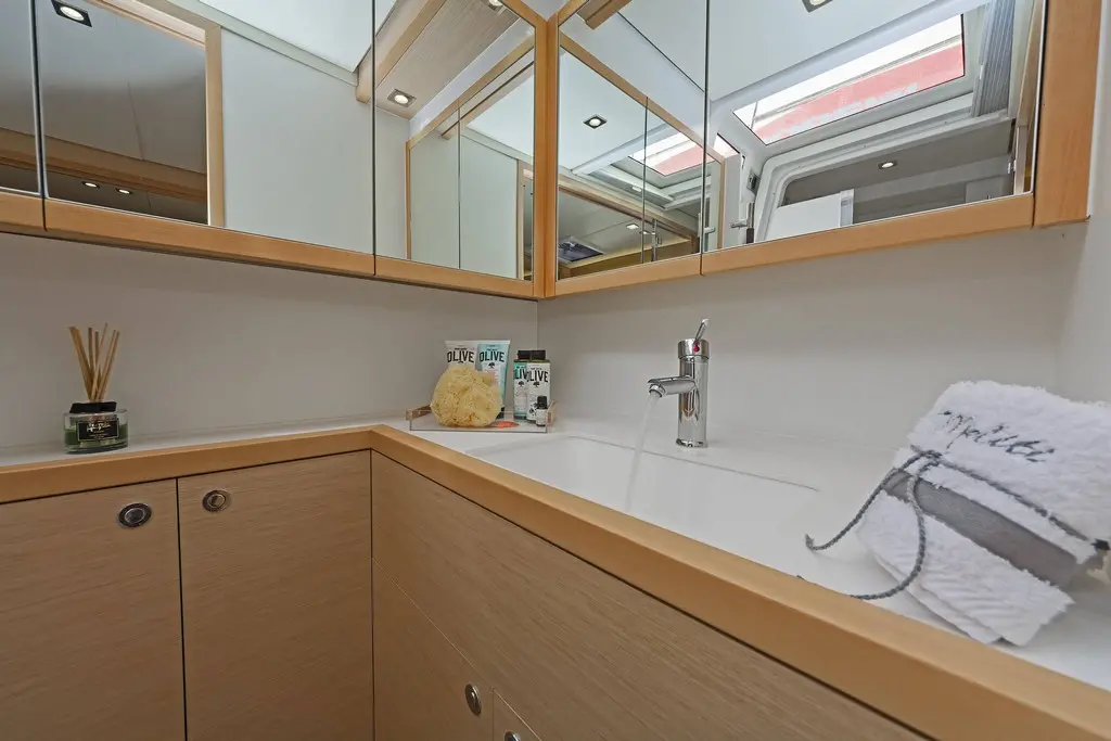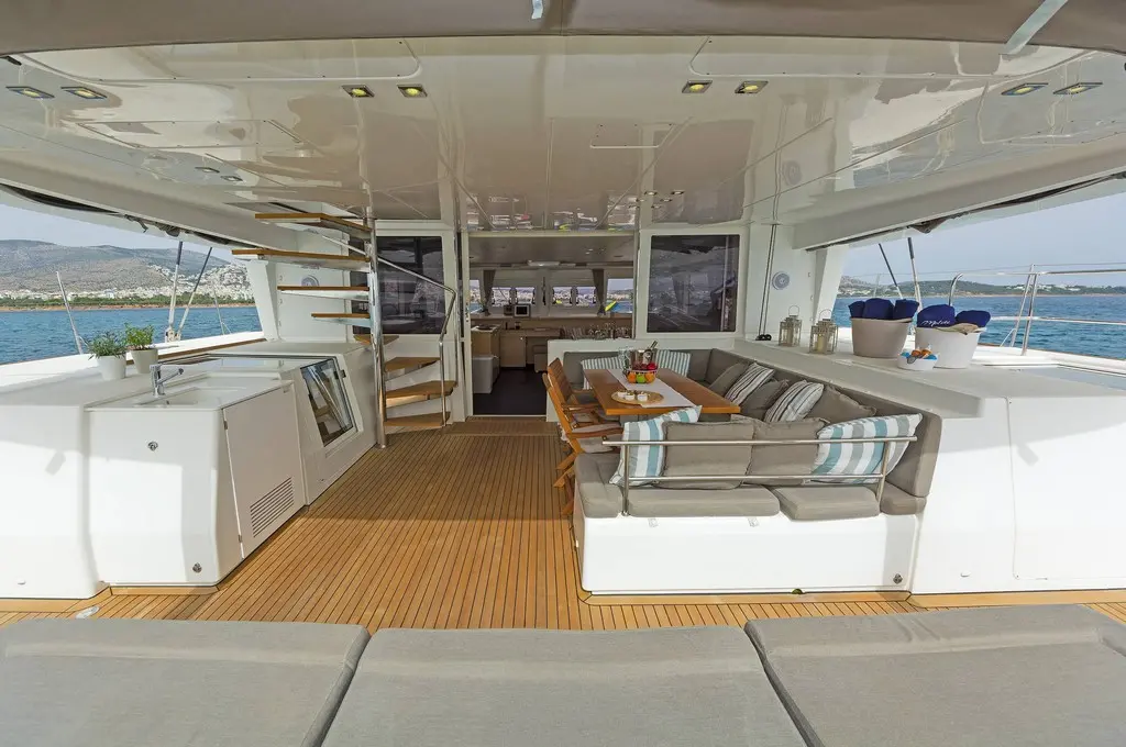 The interior of Meliti radiates warmth and elegance, with a design that maximizes light and space. The saloon, equipped with a TV, DVD player, and music system, serves as the heart of the catamaran, inviting guests to gather and relax. The vast exterior decks offer ample lounging space, perfect for soaking up the sun or enjoying alfresco dining against the backdrop of the Greek isles.