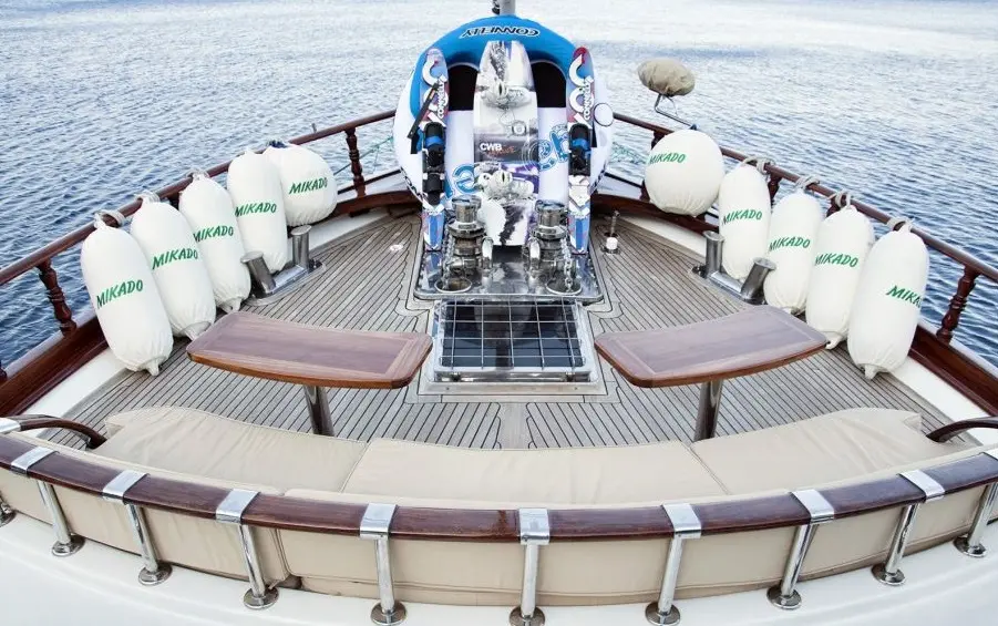 Adventure and relaxation go hand in hand on Mikado, with a variety of water sports equipment, including water skis, a wakeboard, a canoe, and a ringo, ensuring endless fun on the water. The yacht's indoor amenities, such as an onboard restaurant, TVs, a music system, and wireless internet, provide entertainment and connectivity throughout your journey.