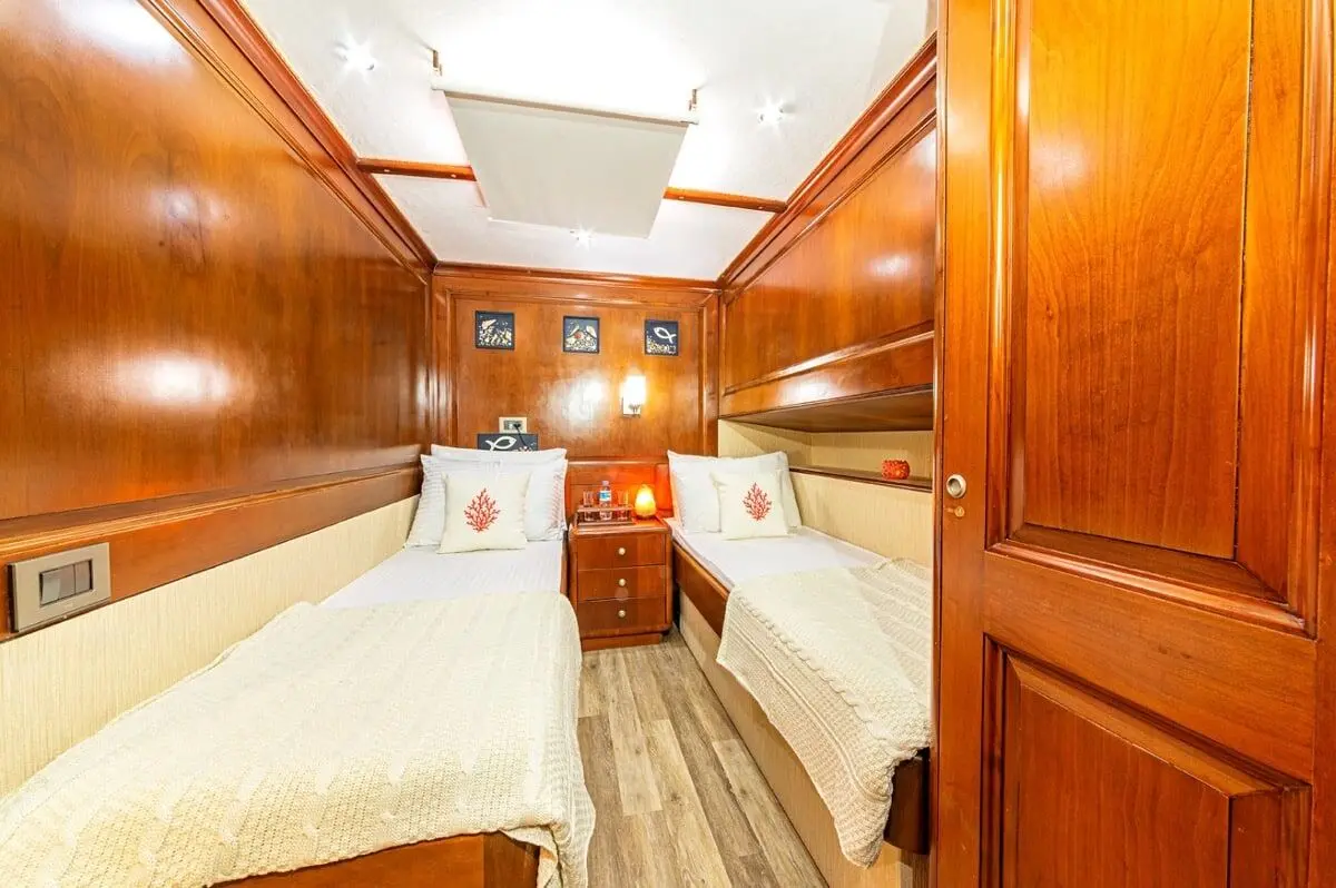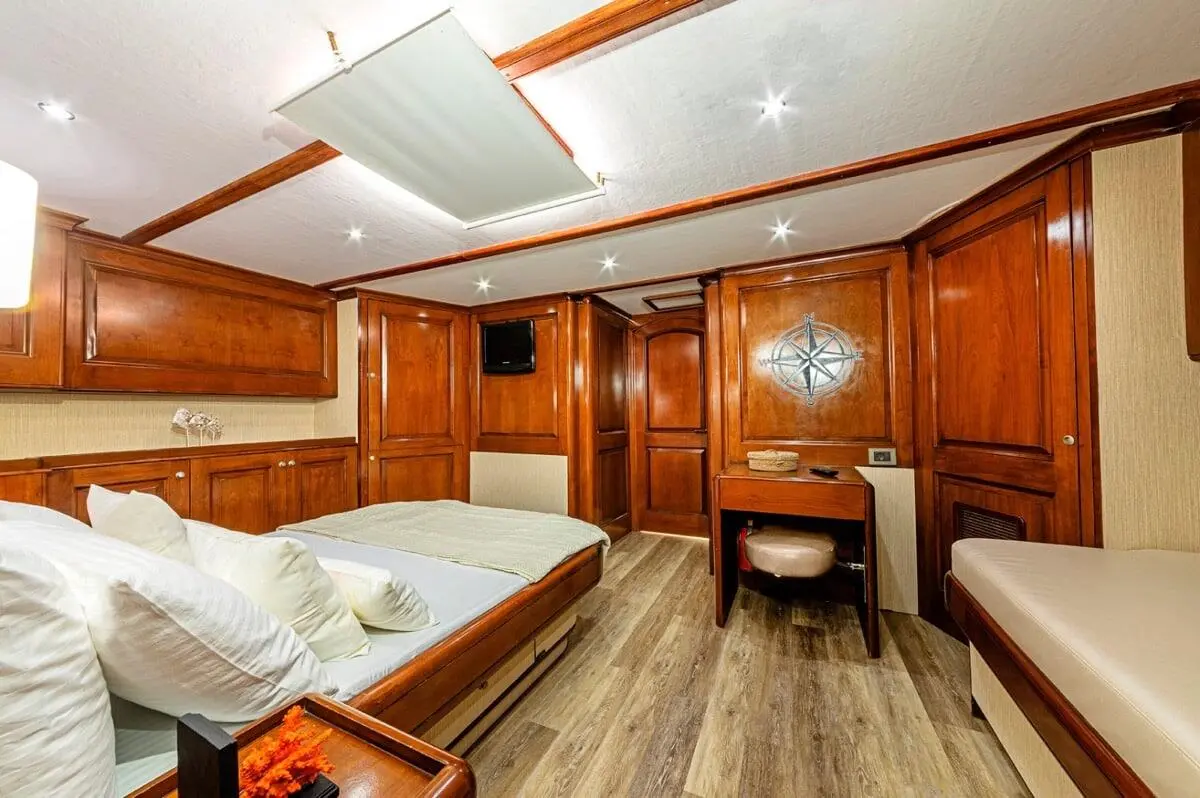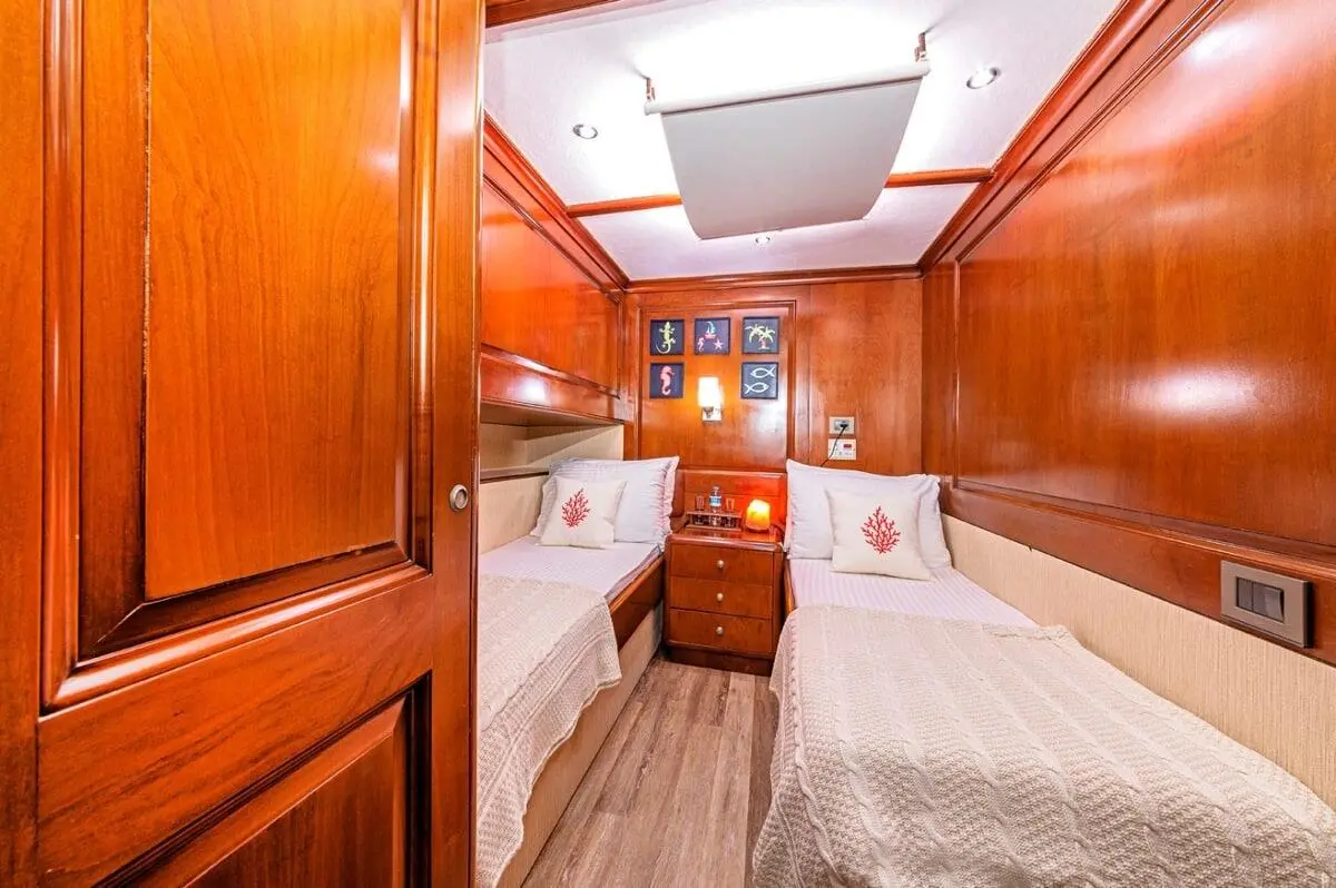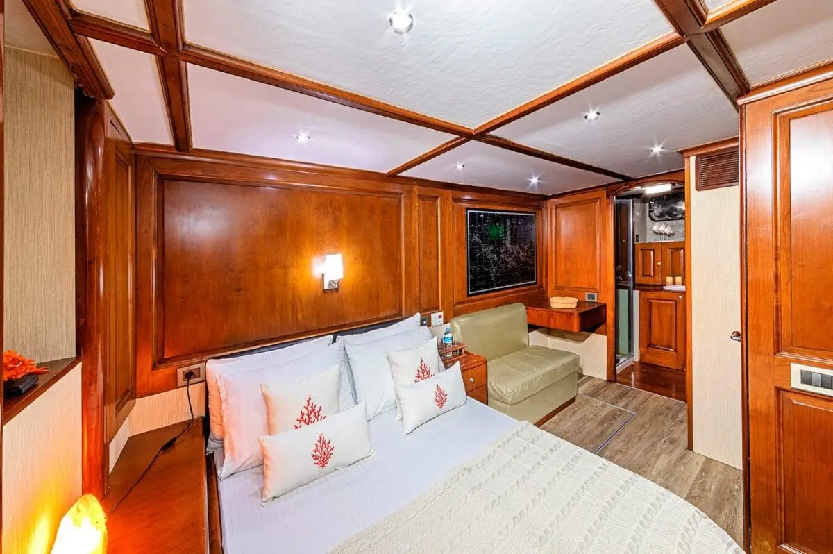 Capable of hosting up to 9 guests, each cabin comes equipped with air conditioning, en-suite bathrooms, and ample storage. Whether you’re lounging in the VIP suite or enjoying the comfort of a twin cabin, every inch of the space speaks of luxury and care.