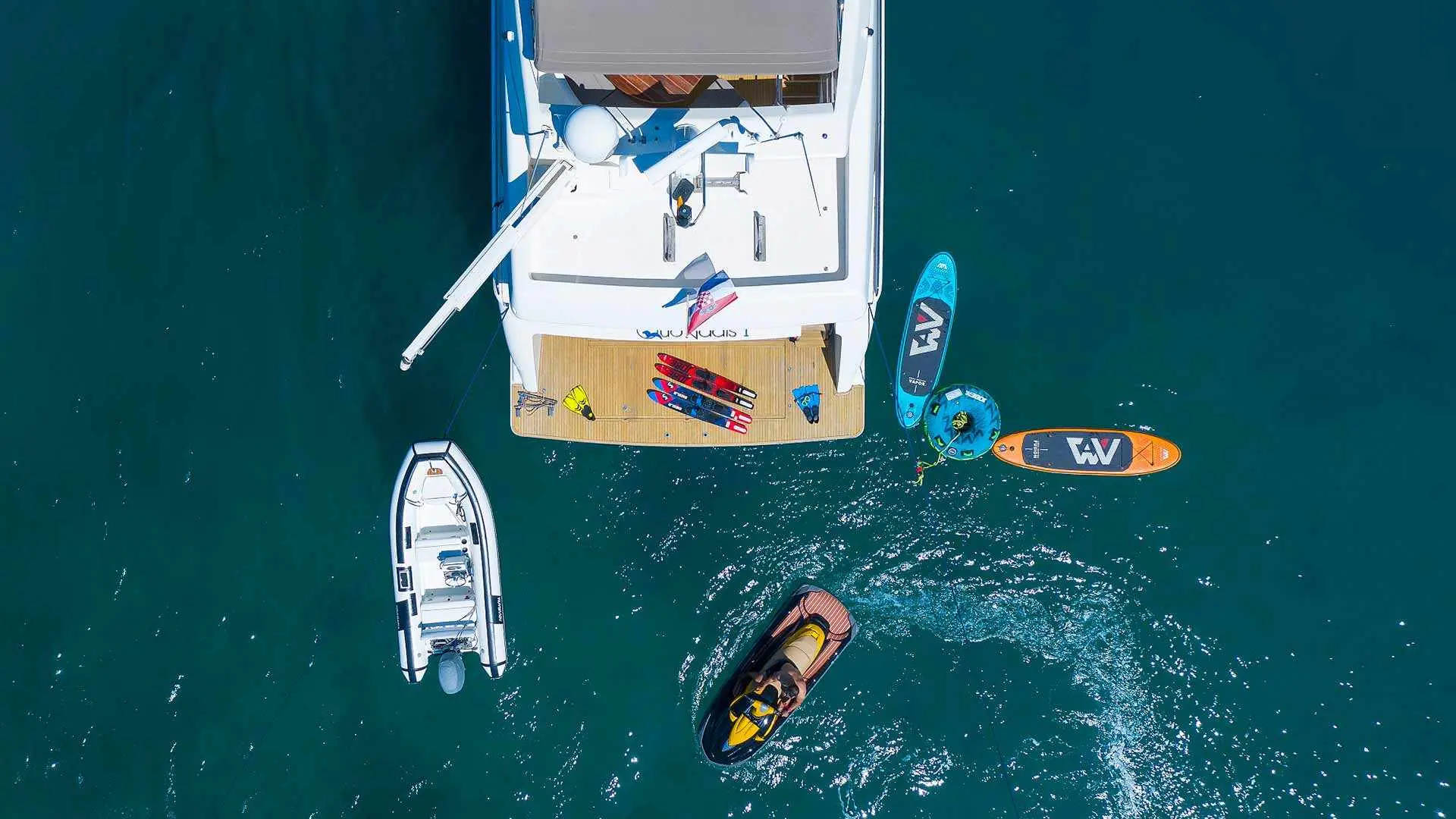 Quo Vadis I is equipped with an array of water toys and sports equipment, ensuring guests can enjoy everything from wave running and flyboarding to more serene activities like paddleboarding and snorkeling. The yacht's tender and water sports gear invite excitement and exploration.