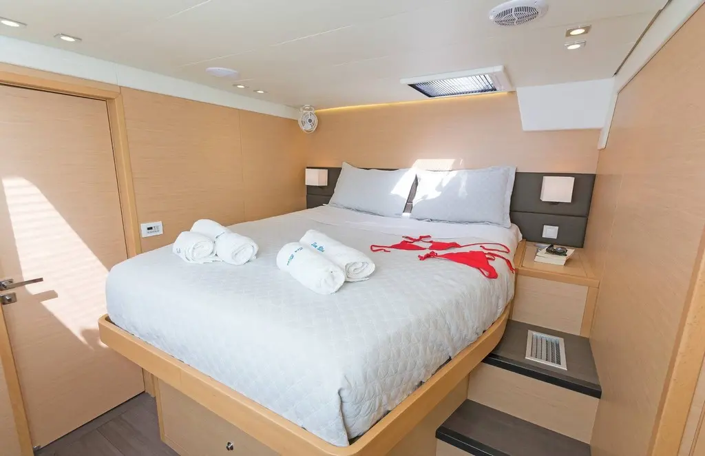 Sea Bliss offers luxurious accommodations for up to 8 guests in four double cabins, each featuring en-suite bathrooms and electric toilettes. The cabins are designed as serene retreats, promising restful nights after days filled with sun and sea.
