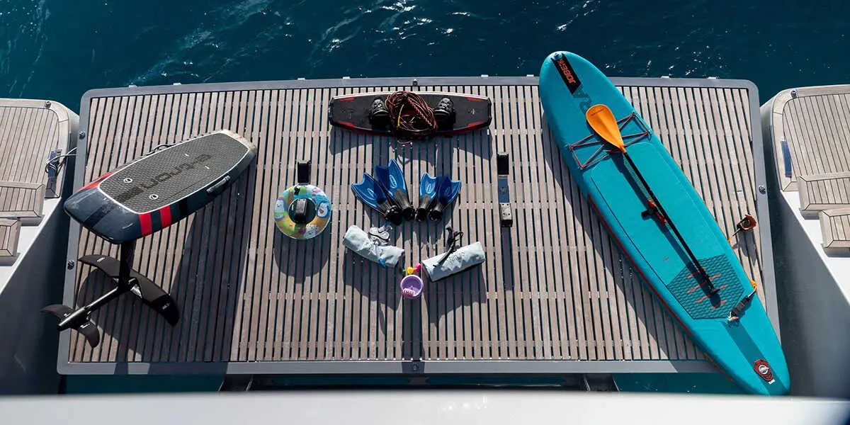 A key highlight of the Sunreef 80 is its extensive collection of water toys and equipment. Guests can enjoy two stand-up paddleboards (SUPs), a tube, floating mats, a hydraulic swim platform, wakeboards, water skis (both for adults and kids), two Sea Bobs F5SR, and snorkel equipment for all guests. These amenities ensure that there's never a dull moment on board.