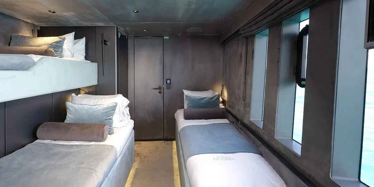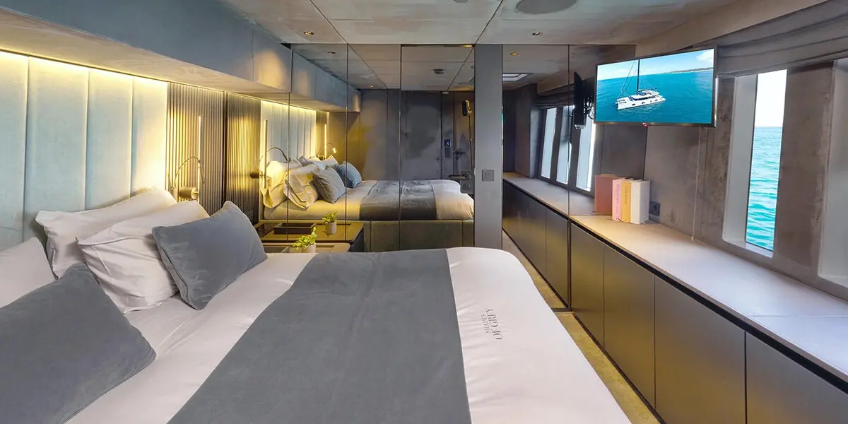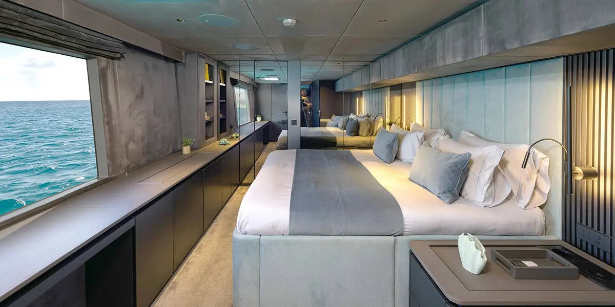 The Sunreef 80 accommodates 9 guests in luxurious comfort across four cabins: one master suite, one double cabin, one VIP cabin, and one guest cabin. Each cabin is designed with an emphasis on space, elegance, and functionality, offering plush bedding, ample storage, and stunning views.