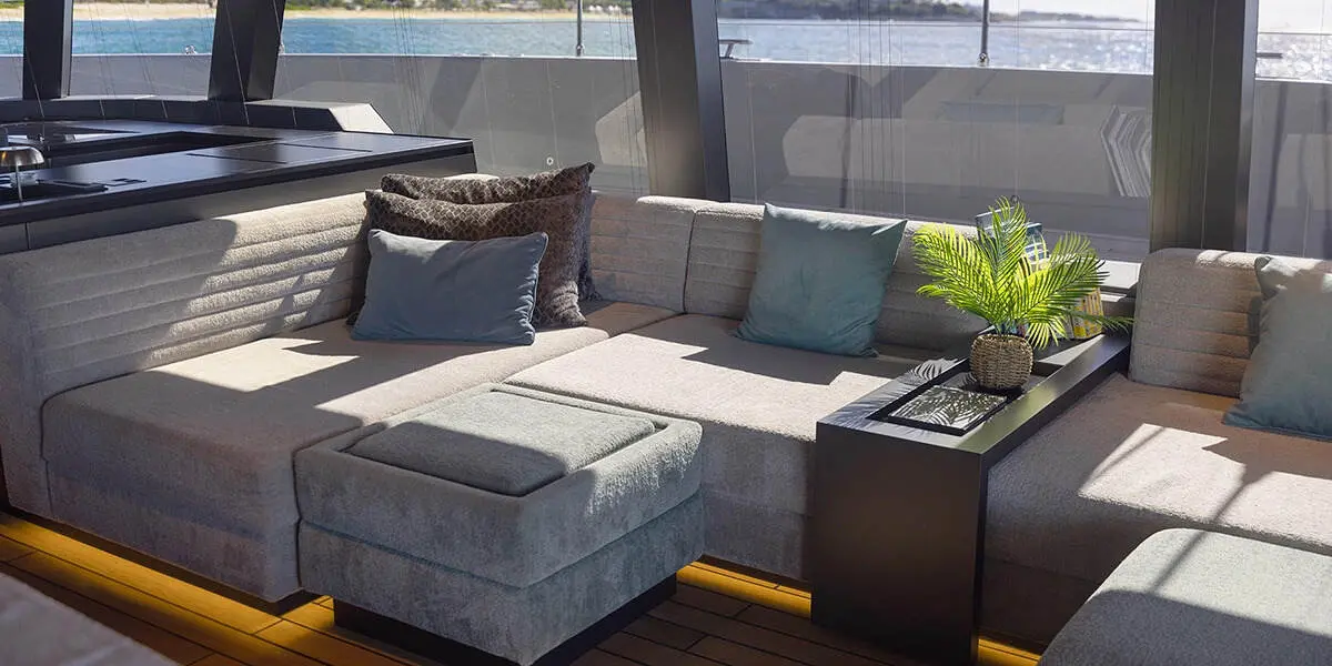 The outdoor spaces on the Sunreef 80 are designed for relaxation and enjoyment. Features include a BBQ grill for outdoor dining, a deck shower for rinsing off after a swim, a bimini for shade, and a hydraulic swim platform for easy access to the water.