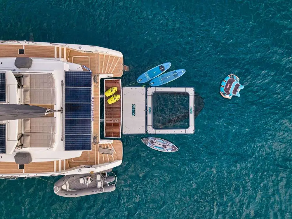 Air Conditioning, Salon Stereo, Deck Shower, Hairdryers, Pets Aboard, Salon TV, Bimini, Inverter, Onboard Wi-Fi, Dinghy Highfield Yamaha 70 HP, 3 x Water Skis (Adult & Kids), Kneeboard, Tube, Kayak, Snorkel Gear, Wake Board (Adults), 2 x SUP, 2 x Seabobs, Canoe, 8 x Connelly Party Cove Noodle DeLuxe, Infinity Island Inflatable Dock, Airstream Towable 3P, Infinity Pool inflatable Sea Pool, Board games: scrabble, jenga, backgammon
